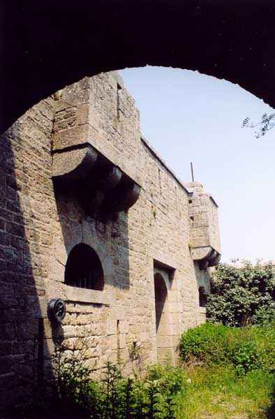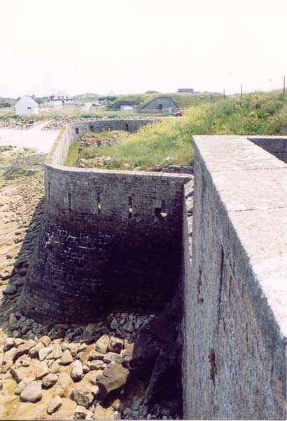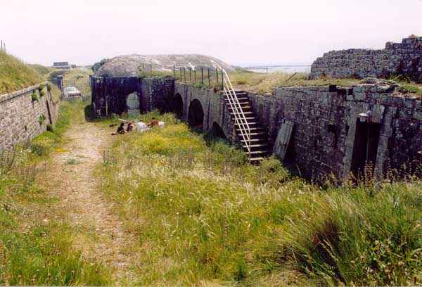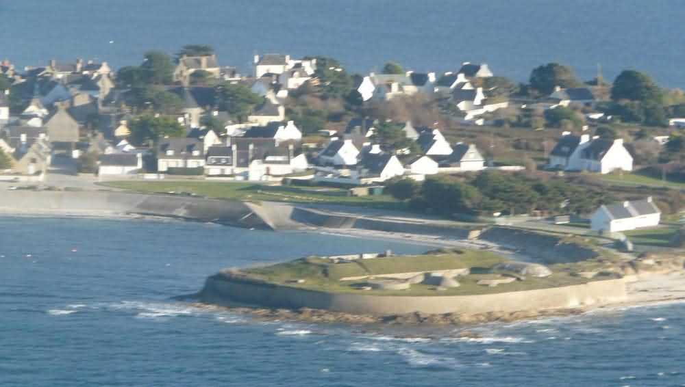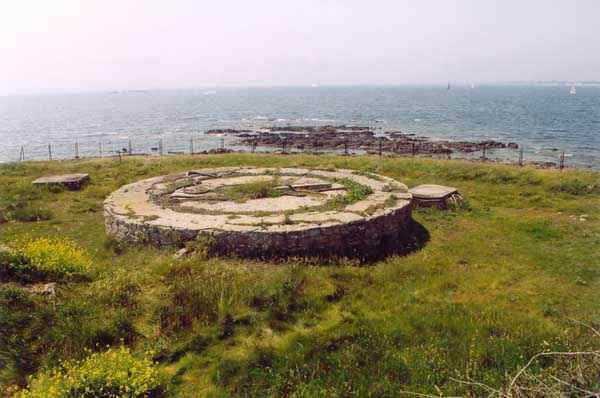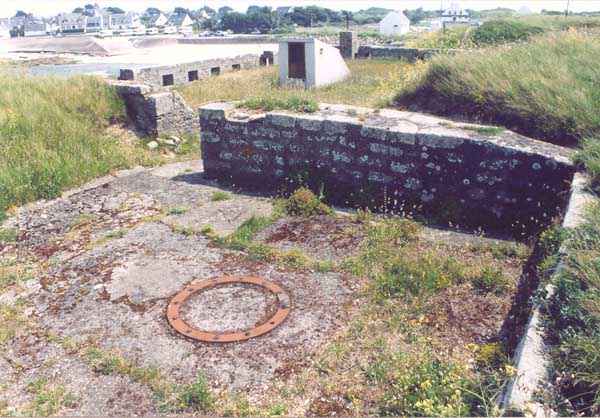 Fortress of Brest, west of the town, 1877-1878. Battery located at the level of the place called "Maison Blanche", 150 m northeast of the Sea fort of Portzic, on the edge of the plateau crowning the slopes descending to the sea. It is a line of seven traverse-shelters framing six identical artillery platforms, armed before 1900 with 2 M 32 cm guns Model 1870-79 on M carriages Model 1876-T-83 P.A. (the only ones in the entire fortress) and 4 M 24 cm guns Model 1870 on M carriages Model 1876-T-83 P.A., which will still be recorded in the 1914 armament schedule. On the southwest side, this battery has a powder magazine, model 1879 (very low with only one lamp embrasure) and, in the northeast, a second small building, the keeper's house, completes the complex. In 1888, it was considered to install a battery of 6 x 100 mm, or, failing that, 6 x 90 mm M Model 1881, but funding prevented this intention. The whole is freely accessible (05/2004), abandoned and overgrown with vegetation. Sometimes designated as "outer battery of Portzic" or "Maison Blanche battery".