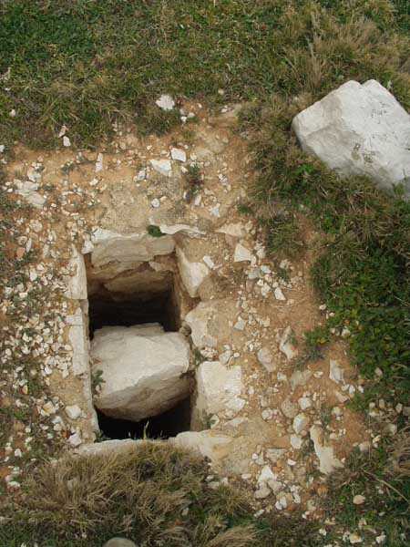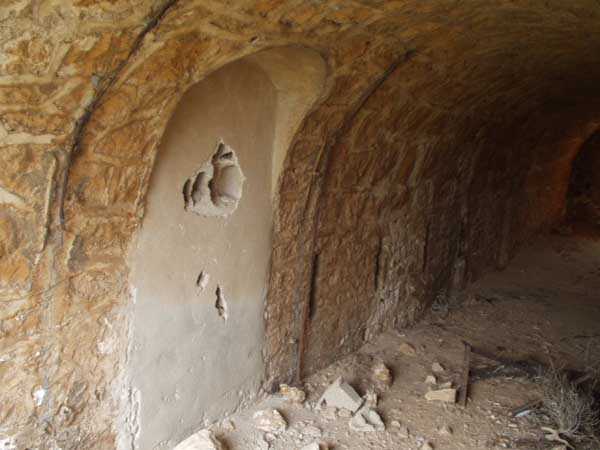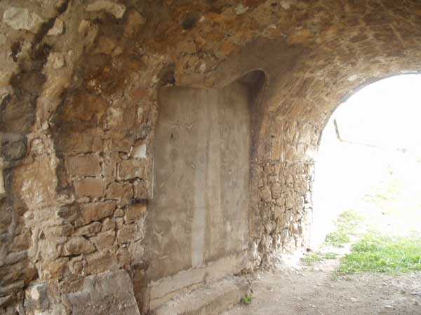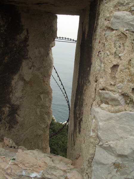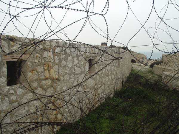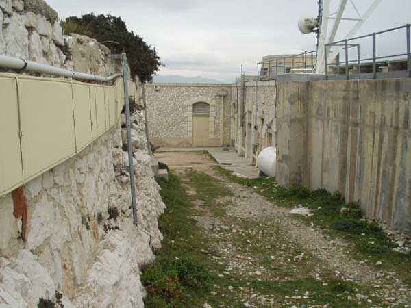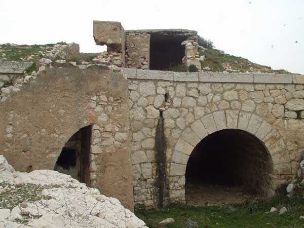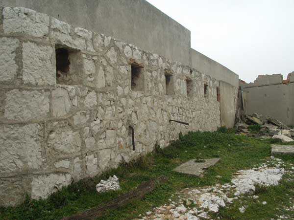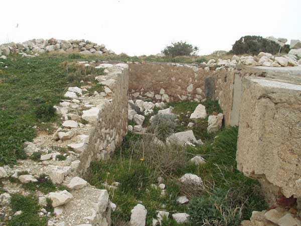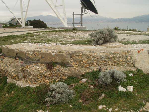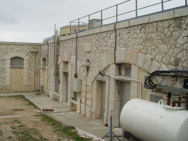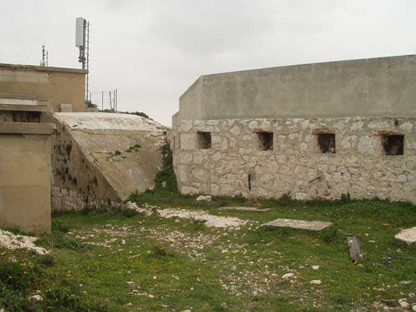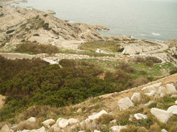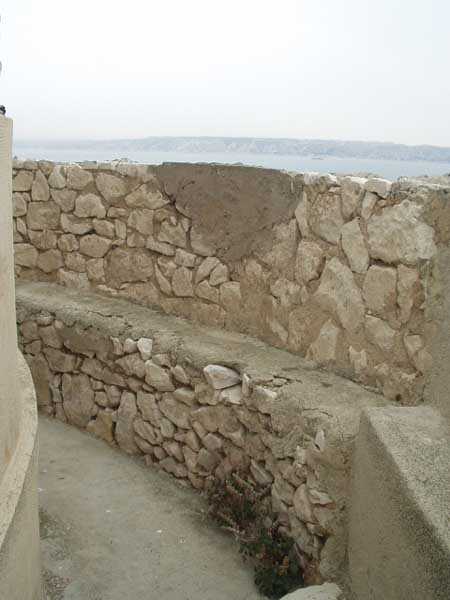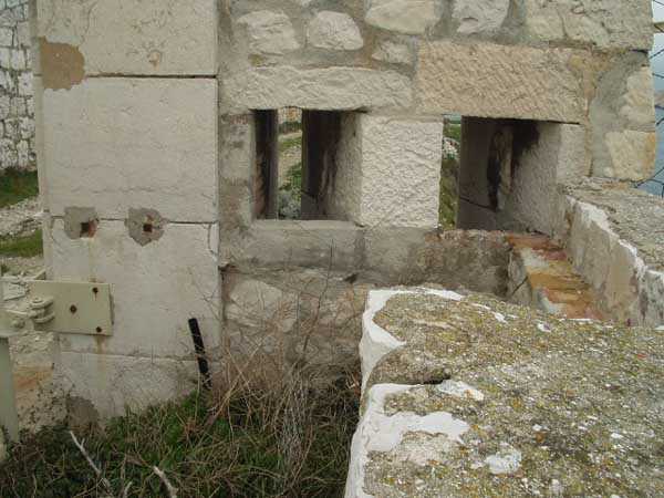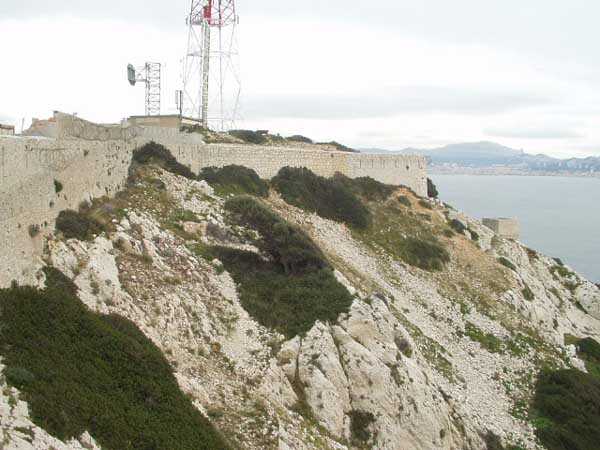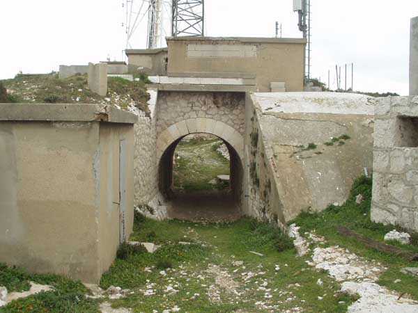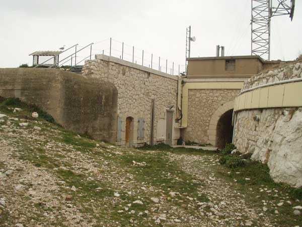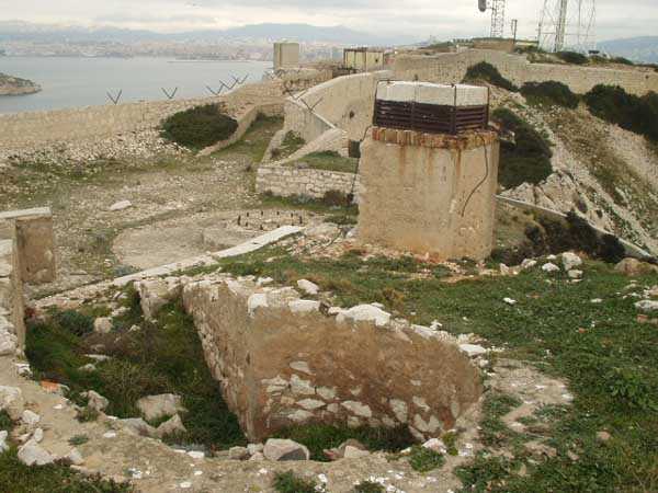 Fortress of Marseille, Pomègues island, 188? Important battery whose entrance, framed by pilasters, is followed on the right by an imposing masonry mole protecting the two bays of a small barracks on a single level. The battery, with a tormented perimeter, is surrounded by a masonry scarp wall. Its armament was 5 - 24 cm Mle 1876 guns, of which 2 on PA carriage and 3 on PC carriage. The carriages are replaced in 1913 by C Mle 1911 carriages. Today (03/2006) access forbidden, it appears rather degraded.
