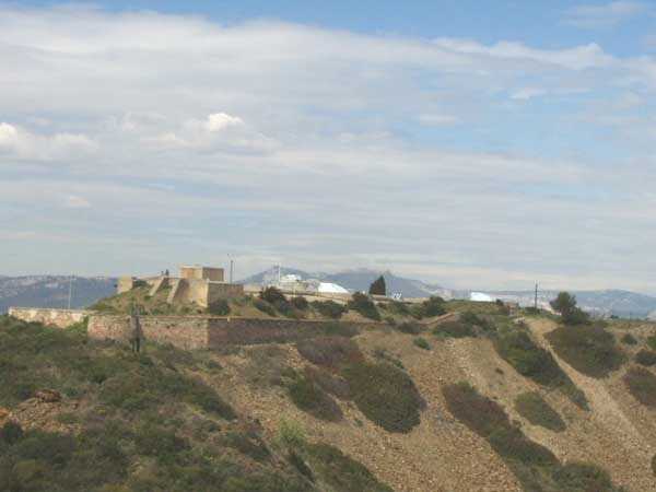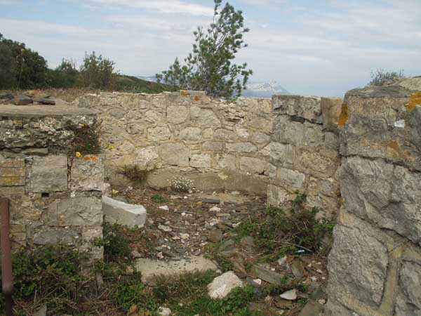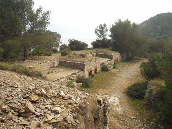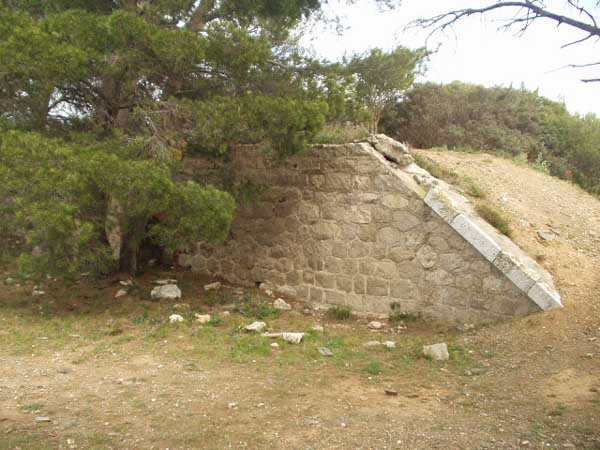 Fortress of Toulon, southwest of the city, 1899. 142 m/alt. 500 m south-southwest of the main battery of Peyras lies the alignment, in pairs, of the six 95 mm guns arming this auxiliary battery. Its isolation has apparently preserved it from degradation and, although abandoned, it is (04/2006) in a relatively good state of preservation. Ammunition niches were provided in the base of the traverses. It also has a small rock-cut magazine, but its entrance is solidly walled up. It is located on a walking path, but one should inquire about accessibility periods, as the site is sensitive to fires.