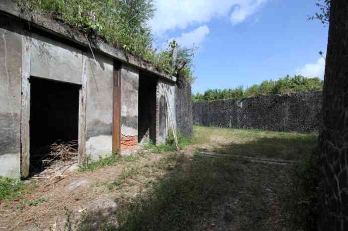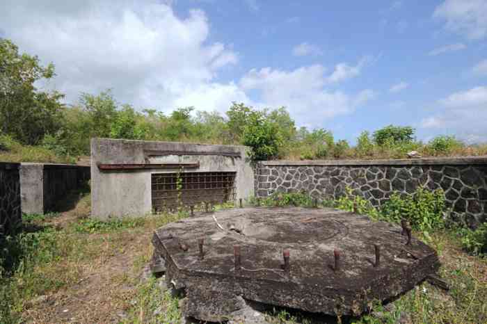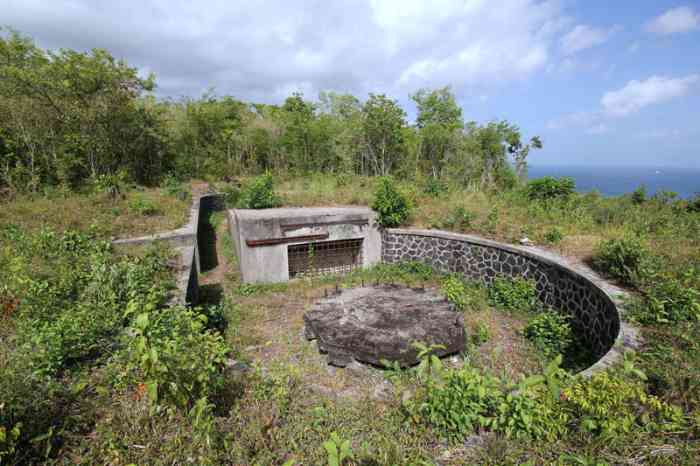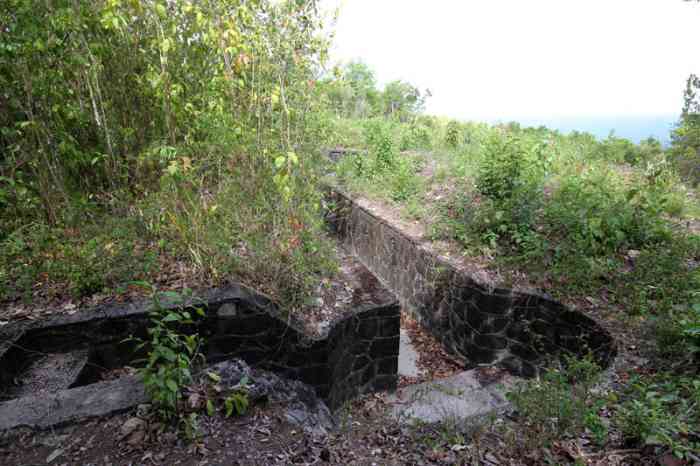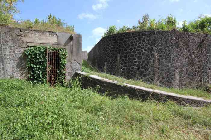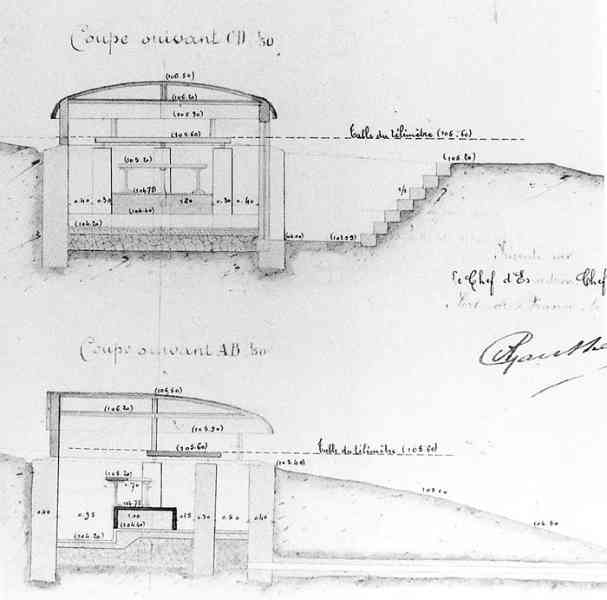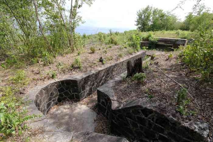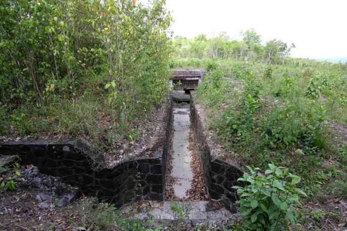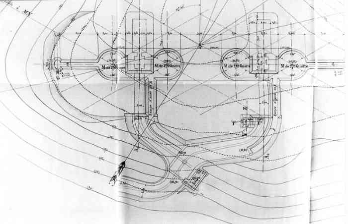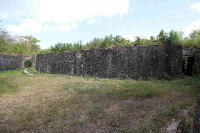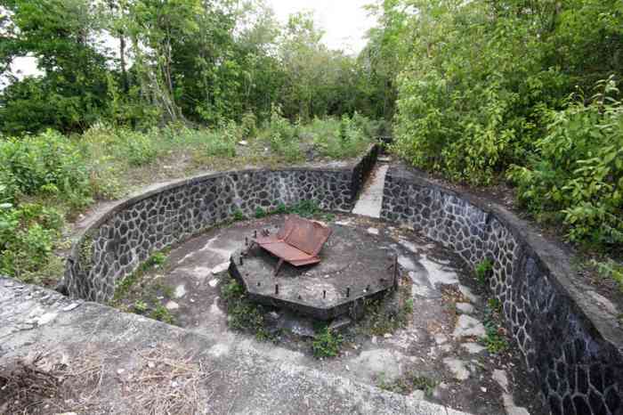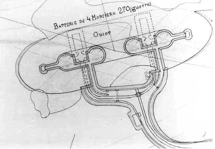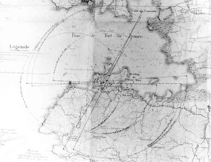 Martinique. Fort-de-France. Dernier venu des ouvrages du point d'appui, la batterie de la Pointe d'Alet est une construction moderne en béton armé, édifiée en 1900. Elle est située sur le territoire de la commune des Trois-Îlets, à deux kilomètres au sud de la pointe du Bout, sur la rive sud de la baie de Fort-de-France. Située sur le morne d'Alet, à l'altitude moyenne de 110 mètres, l'ouvrage comprend deux demi-batteries, armées chacune de 4 mortiers G de 270 Mle 1889 sur affût G à châssis circulaire. Elles sont distantes de 500 mètres l'une de l'autre. Celle de l'Est est établie sur le morne Flambeau, celle de l'Ouest sur le morne des Étages. L'ouvrage ne possède pas de magasin caverne. Chaque demi-batterie est organisée autour de deux magasins en béton armé, ravitaillés par voie de 60. Chacun de ces magasins alimente les pièces des deux cuves encadrantes, à l'aide d'une noria à munitions. Il s'agit là d'un plan complètement original, que nous n'avons rencontré sur aucune batterie de mortiers métropolitaine. La batterie est ravitaillée par mer, depuis Fort-de-France, au moyen d'un appontement construit à Glacy, relié aux magasins par une route et par une voie de 60. Le champ de tir couvre la quasi-totalité de la baie de Fort-de-France, ainsi que l'intérieur des terres, jusqu'au Diamant. Un plan, daté de 1899, fait figurer une batterie de quatre canons de 138 Mle 1881 entre les deux demi-batteries de mortiers. Dans un projet de 1902, c'est une batterie de quatre canons M de 19 cm Mle 1870-93 sur affût M Mle 1899 PC, qui est prévue à cet emplacement. Mais, en 1912, on n'y trouve que quatre canons de 90 Mle 1877 sur affût de campagne. Les mortiers sont déposés au cours de la Première Guerre mondiale, et renvoyés en métropole. La batterie tombe ensuite dans l'oubli, et ne sera pas réutilisée pendant la Seconde Guerre mondiale. Lors de notre passage, elle était très embroussaillée, et servait de terrain de jeu à la jeunesse des environs. Depuis, la demi-batterie ouest a été dégagée de la végétation. Als letztes der Werke des Stützpunkts ist die Batterie der Pointe d'Alet ein moderner Stahlbetonbau, errichtet im Jahr 1900. Sie liegt auf dem Gebiet der Gemeinde Les Trois-Îlets, zwei Kilometer südlich der Pointe du Bout, am Südufer der Bucht von Fort-de-France. Auf dem Morne d'Alet gelegen, auf einer durchschnittlichen Höhe von 110 Metern, umfasst das Werk zwei Halbbatterien, jede bewaffnet mit 4 G-Mörsern 270 mm Mle 1889 auf G-Lafette mit kreisförmigem Rahmen. Sie sind 500 Meter voneinander entfernt. Die östliche befindet sich auf dem Morne Flambeau, die westliche auf dem Morne des Étages. Das Werk besitzt kein Kavernenmagazin. Jede Halbbatterie ist um zwei Stahlbetonmagazine herum organisiert, die über eine Feldbahn der Spurweite 60 versorgt werden. Jedes dieser Magazine versorgt die Geschütze der beiden angrenzenden Gruben mit Hilfe einer Munitionsnoria. Dies ist ein völlig origineller Plan, wie wir ihn bei keiner metropolitanen Mörserbatterie angetroffen haben. Die Batterie wird von See her von Fort-de-France aus über eine in Glacy gebaute Anlegestelle versorgt, die durch eine Straße und eine Feldbahn der Spurweite 60 mit den Magazinen verbunden ist. Das Schussfeld deckt fast die gesamte Bucht von Fort-de-France sowie das Landesinnere bis zum Diamant ab. Ein Plan aus dem Jahr 1899 zeigt eine Batterie von vier Kanonen 138 mm Mle 1881 zwischen den beiden Mörserhalbbatterien. In einem Projekt von 1902 ist an dieser Stelle eine Batterie von vier M-Kanonen 19 cm Mle 1870-93 auf M-Lafette Mle 1899 PC (Lafette mit zentralem Drehpunkt) vorgesehen. Aber 1912 findet man dort nur vier Kanonen 90 mm Mle 1877 auf Feldlafette. Die Mörser werden während des Ersten Weltkriegs abgebaut und ins Mutterland zurückgeschickt. Die Batterie gerät dann in Vergessenheit und wird während des Zweiten Weltkriegs nicht wieder genutzt. Bei unserem Besuch war sie sehr zugewachsen und diente der örtlichen Jugend als Spielplatz. Inzwischen ist die westliche Halbbatterie von der Vegetation befreit worden. Als laatste van de werken van het steunpunt is de batterij van de Pointe d'Alet een moderne constructie van gewapend beton, gebouwd in 1900. Zij ligt op het grondgebied van de gemeente Les Trois-Îlets, twee kilometer ten zuiden van de Pointe du Bout, op de zuidoever van de baai van Fort-de-France. Gelegen op de Morne d'Alet, op een gemiddelde hoogte van 110 meter, omvat het werk twee halfbatterijen, elk bewapend met 4 G-mortieren van 270 mm Mle 1889 op G-affuit met cirkelvormig frame. Ze liggen 500 meter van elkaar verwijderd. De oostelijke ligt op de Morne Flambeau, de westelijke op de Morne des Étages. Het werk bezit geen grotmagazijn. Elke halfbatterij is georganiseerd rond twee magazijnen van gewapend beton, bevoorraad via een veldspoor van spoorwijdte 60. Elk van deze magazijnen voedt de stukken van de twee omliggende kazematten met behulp van een munitienoria. Dit is een volkomen origineel plan, dat we bij geen enkele metropolitaanse mortierbatterij zijn tegengekomen. De batterij wordt van over zee bevoorraad vanuit Fort-de-France via een aanlegsteiger gebouwd in Glacy, verbonden met de magazijnen door een weg en een veldspoor van spoorwijdte 60. Het schootsveld bestrijkt vrijwel de gehele baai van Fort-de-France, evenals het binnenland tot aan Le Diamant. Een plan uit 1899 toont een batterij van vier kanonnen van 138 mm Mle 1881 tussen de twee mortierhalfbatterijen. In een project van 1902 is op deze plaats een batterij van vier M-kanonnen van 19 cm Mle 1870-93 op M-affuit Mle 1899 PC (affuit met centraal draaipunt) voorzien. Maar in 1912 vindt men er slechts vier kanonnen van 90 mm Mle 1877 op veldaffuit. De mortieren worden tijdens de Eerste Wereldoorlog gedemonteerd en naar het moederland teruggezonden. De batterij raakt vervolgens in vergetelheid en wordt tijdens de Tweede Wereldoorlog niet hergebruikt. Bij ons bezoek was ze zeer ov