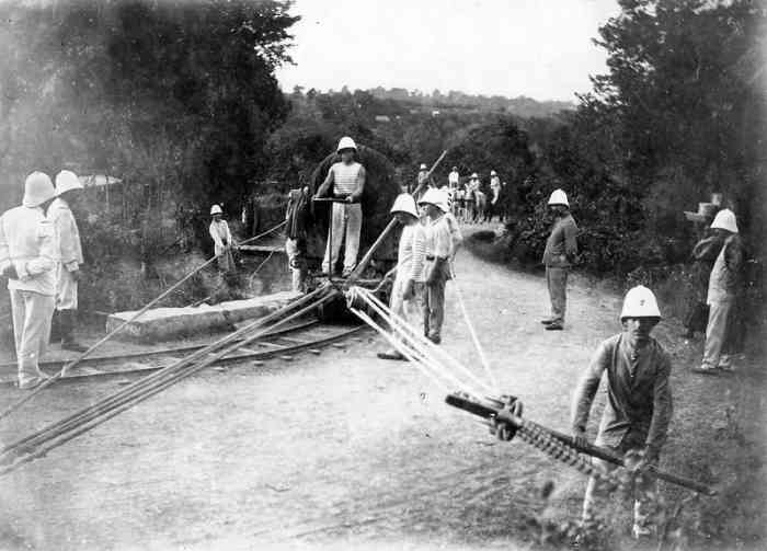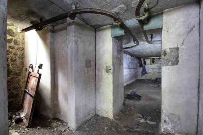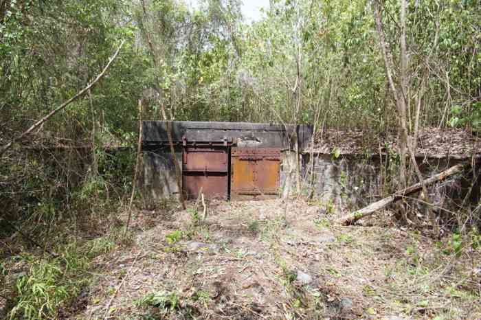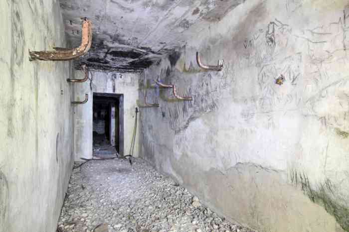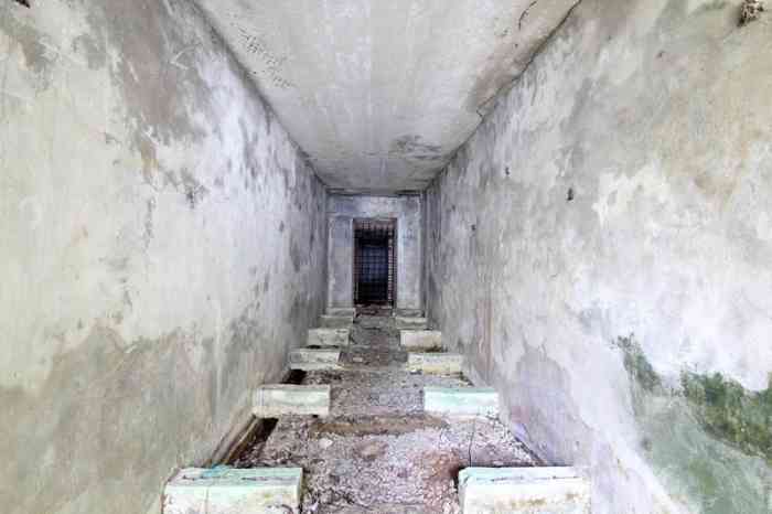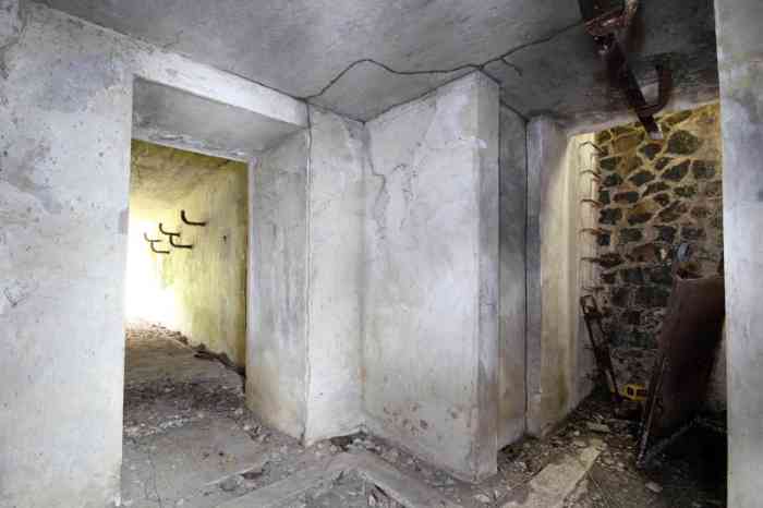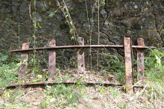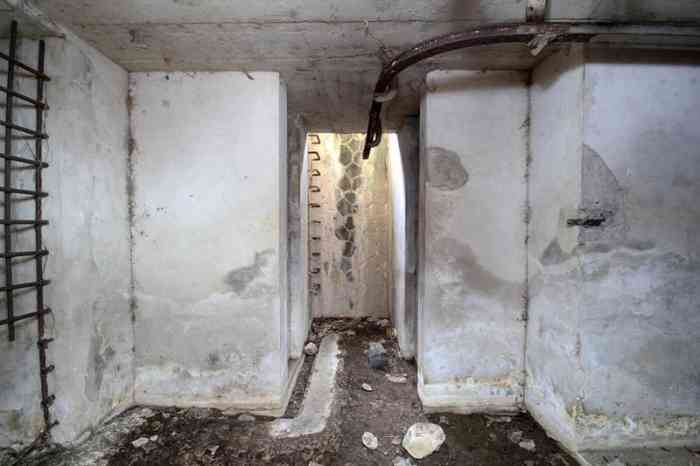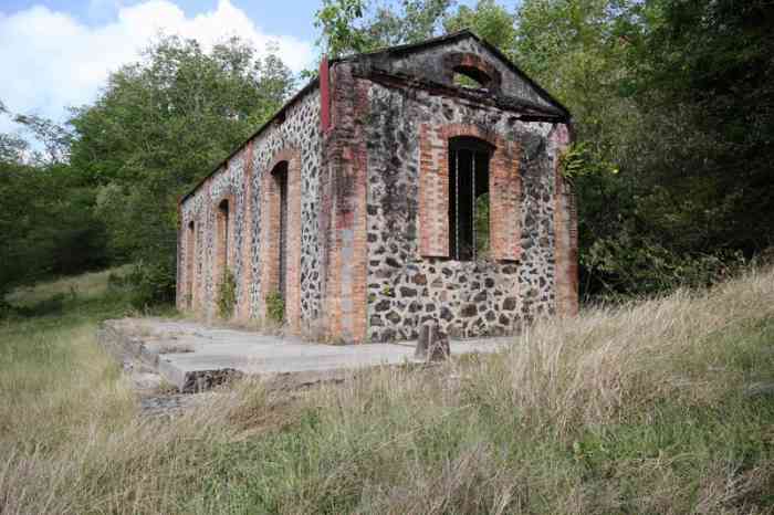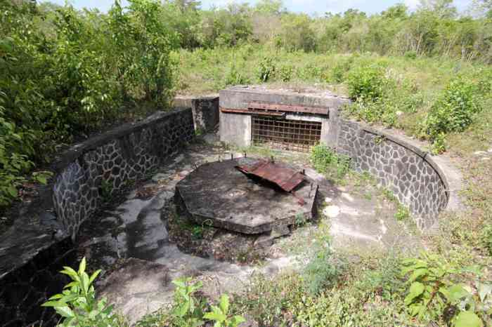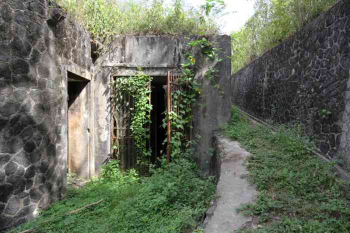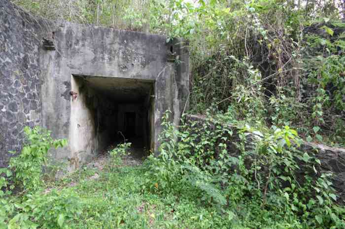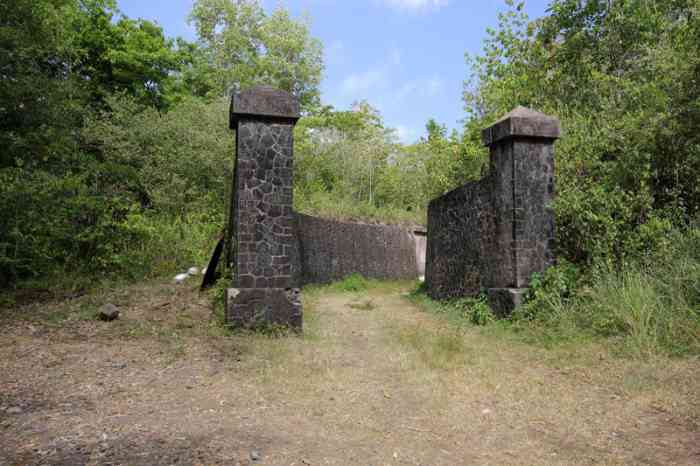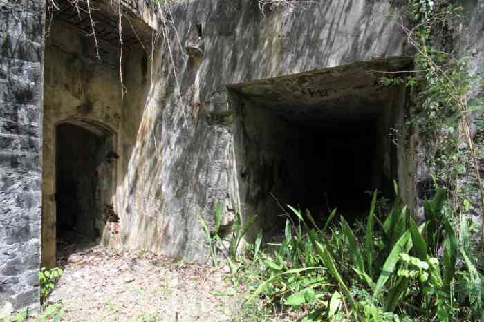 Martinique. Fort-de-France. Dernier venu des ouvrages du point d'appui, la batterie de la Pointe d'Alet est une construction moderne en béton armé, édifiée en 1900. Elle est située sur le territoire de la commune des Trois-Îlets, à deux kilomètres au sud de la pointe du Bout, sur la rive sud de la baie de Fort-de-France. Située sur le morne d'Alet, à l'altitude moyenne de 110 mètres, l'ouvrage comprend deux demi-batteries, armées chacune de 4 mortiers G de 270 Mle 1889 sur affût G à châssis circulaire. Elles sont distantes de 500 mètres l'une de l'autre. Celle de l'Est est établie sur le morne Flambeau, celle de l'Ouest sur le morne des Étages. L'ouvrage ne possède pas de magasin caverne. Chaque demi-batterie est organisée autour de deux magasins en béton armé, ravitaillés par voie de 60. Chacun de ces magasins alimente les pièces des deux cuves encadrantes, à l'aide d'une noria à munitions. Il s'agit là d'un plan complètement original, que nous n'avons rencontré sur aucune batterie de mortiers métropolitaine. La batterie est ravitaillée par mer, depuis Fort-de-France, au moyen d'un appontement construit à Glacy, relié aux magasins par une route et par une voie de 60. Le champ de tir couvre la quasi-totalité de la baie de Fort-de-France, ainsi que l'intérieur des terres, jusqu'au Diamant. Un plan, daté de 1899, fait figurer une batterie de quatre canons de 138 Mle 1881 entre les deux demi-batteries de mortiers. Dans un projet de 1902, c'est une batterie de quatre canons M de 19 cm Mle 1870-93 sur affût M Mle 1899 PC, qui est prévue à cet emplacement. Mais, en 1912, on n'y trouve que quatre canons de 90 Mle 1877 sur affût de campagne. Les mortiers sont déposés au cours de la Première Guerre mondiale, et renvoyés en métropole. La batterie tombe ensuite dans l'oubli, et ne sera pas réutilisée pendant la Seconde Guerre mondiale. Lors de notre passage, elle était très embroussaillée, et servait de terrain de jeu à la jeunesse des environs. Depuis, la demi-batterie ouest a été dégagée de la végétation. Als letztes der Werke des Stützpunkts ist die Batterie der Pointe d'Alet ein moderner Stahlbetonbau, errichtet im Jahr 1900. Sie liegt auf dem Gebiet der Gemeinde Les Trois-Îlets, zwei Kilometer südlich der Pointe du Bout, am Südufer der Bucht von Fort-de-France. Auf dem Morne d'Alet gelegen, auf einer durchschnittlichen Höhe von 110 Metern, umfasst das Werk zwei Halbbatterien, jede bewaffnet mit 4 G-Mörsern 270 mm Mle 1889 auf G-Lafette mit kreisförmigem Rahmen. Sie sind 500 Meter voneinander entfernt. Die östliche befindet sich auf dem Morne Flambeau, die westliche auf dem Morne des Étages. Das Werk besitzt kein Kavernenmagazin. Jede Halbbatterie ist um zwei Stahlbetonmagazine herum organisiert, die über eine Feldbahn der Spurweite 60 versorgt werden. Jedes dieser Magazine versorgt die Geschütze der beiden angrenzenden Gruben mit Hilfe einer Munitionsnoria. Dies ist ein völlig origineller Plan, wie wir ihn bei keiner metropolitanen Mörserbatterie angetroffen haben. Die Batterie wird von See her von Fort-de-France aus über eine in Glacy gebaute Anlegestelle versorgt, die durch eine Straße und eine Feldbahn der Spurweite 60 mit den Magazinen verbunden ist. Das Schussfeld deckt fast die gesamte Bucht von Fort-de-France sowie das Landesinnere bis zum Diamant ab. Ein Plan aus dem Jahr 1899 zeigt eine Batterie von vier Kanonen 138 mm Mle 1881 zwischen den beiden Mörserhalbbatterien. In einem Projekt von 1902 ist an dieser Stelle eine Batterie von vier M-Kanonen 19 cm Mle 1870-93 auf M-Lafette Mle 1899 PC (Lafette mit zentralem Drehpunkt) vorgesehen. Aber 1912 findet man dort nur vier Kanonen 90 mm Mle 1877 auf Feldlafette. Die Mörser werden während des Ersten Weltkriegs abgebaut und ins Mutterland zurückgeschickt. Die Batterie gerät dann in Vergessenheit und wird während des Zweiten Weltkriegs nicht wieder genutzt. Bei unserem Besuch war sie sehr zugewachsen und diente der örtlichen Jugend als Spielplatz. Inzwischen ist die westliche Halbbatterie von der Vegetation befreit worden. Als laatste van de werken van het steunpunt is de batterij van de Pointe d'Alet een moderne constructie van gewapend beton, gebouwd in 1900. Zij ligt op het grondgebied van de gemeente Les Trois-Îlets, twee kilometer ten zuiden van de Pointe du Bout, op de zuidoever van de baai van Fort-de-France. Gelegen op de Morne d'Alet, op een gemiddelde hoogte van 110 meter, omvat het werk twee halfbatterijen, elk bewapend met 4 G-mortieren van 270 mm Mle 1889 op G-affuit met cirkelvormig frame. Ze liggen 500 meter van elkaar verwijderd. De oostelijke ligt op de Morne Flambeau, de westelijke op de Morne des Étages. Het werk bezit geen grotmagazijn. Elke halfbatterij is georganiseerd rond twee magazijnen van gewapend beton, bevoorraad via een veldspoor van spoorwijdte 60. Elk van deze magazijnen voedt de stukken van de twee omliggende kazematten met behulp van een munitienoria. Dit is een volkomen origineel plan, dat we bij geen enkele metropolitaanse mortierbatterij zijn tegengekomen. De batterij wordt van over zee bevoorraad vanuit Fort-de-France via een aanlegsteiger gebouwd in Glacy, verbonden met de magazijnen door een weg en een veldspoor van spoorwijdte 60. Het schootsveld bestrijkt vrijwel de gehele baai van Fort-de-France, evenals het binnenland tot aan Le Diamant. Een plan uit 1899 toont een batterij van vier kanonnen van 138 mm Mle 1881 tussen de twee mortierhalfbatterijen. In een project van 1902 is op deze plaats een batterij van vier M-kanonnen van 19 cm Mle 1870-93 op M-affuit Mle 1899 PC (affuit met centraal draaipunt) voorzien. Maar in 1912 vindt men er slechts vier kanonnen van 90 mm Mle 1877 op veldaffuit. De mortieren worden tijdens de Eerste Wereldoorlog gedemonteerd en naar het moederland teruggezonden. De batterij raakt vervolgens in vergetelheid en wordt tijdens de Tweede Wereldoorlog niet hergebruikt. Bij ons bezoek was ze zeer ov