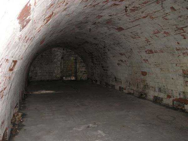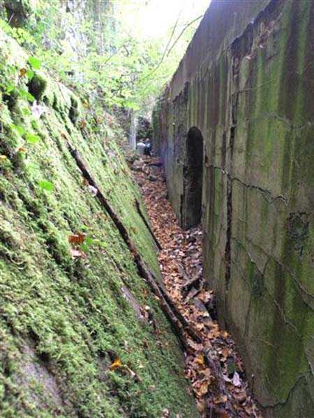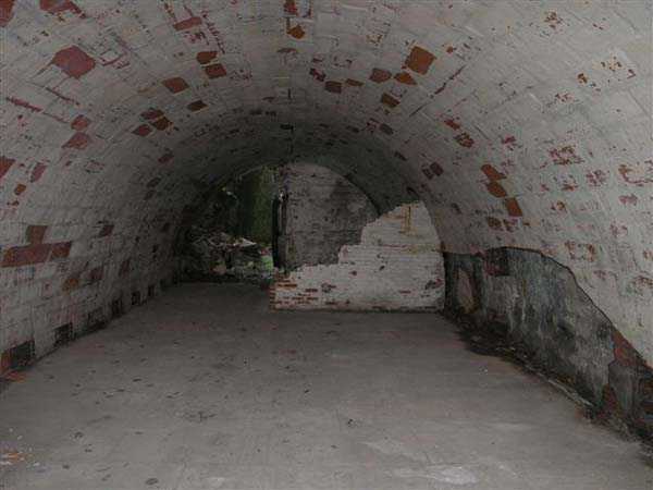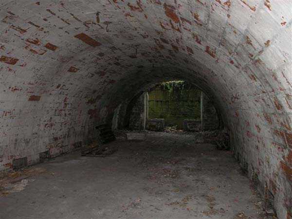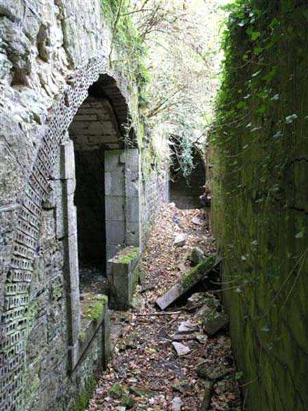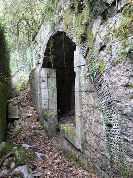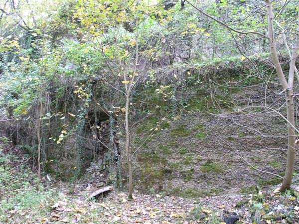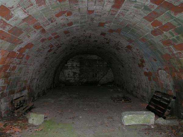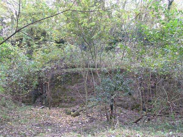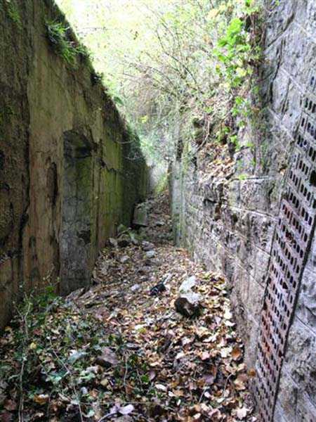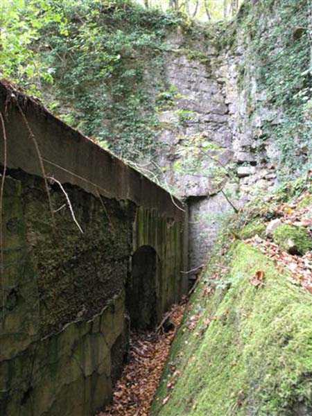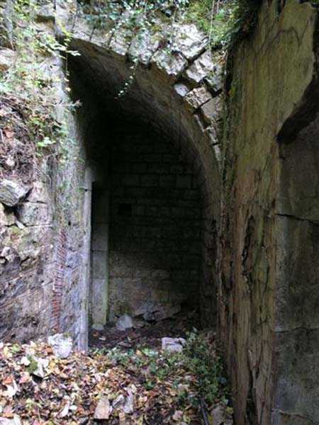 Fortress of Besançon, southwest of the city, 1891-1892. ± 465 m above sea level. Since the center of the plateau housing Fort Planoise had been turned into a stone quarry, upon completion of the complex, a cavern shelter was excavated under the quarry face. The latter consists of four large dormitories of 17 x 6.5 m connected by a corridor at their rear. The entrances to the dormitories are protected by a concrete mask wall, 150 cm thick. The corridor created by this wall in front of the dormitories was covered to protect the passage from potential falling rocks. All interior parts are lined with bricks ensuring air circulation between them and the rubble masonry. Each end of the rear circulation corridor leads to a cistern. Visited in October 2007, this shelter appeared very degraded to us. The covering of the outer corridor has collapsed as well as large sections of the brick lining. It is even advisable to be very careful before passing under certain ceiling parts that only require a minor shock to collapse. If graffiti artists have miraculously not struck the interior, on the other hand the slope leading to the shelter disappears under rubbish.