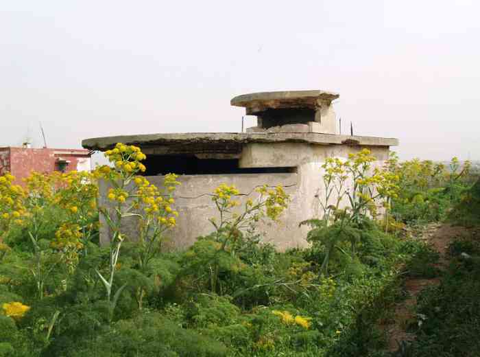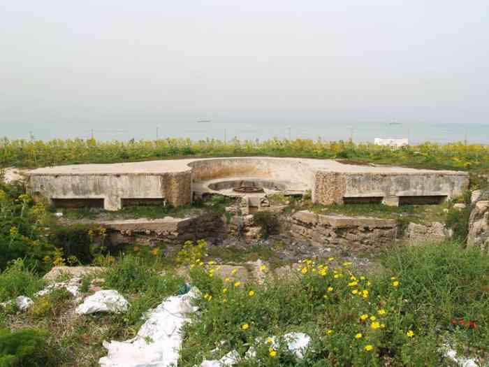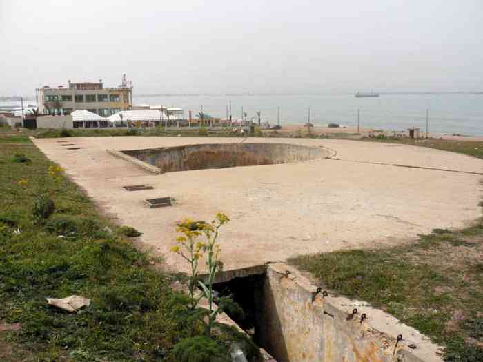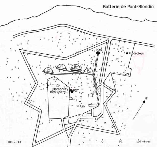 Named Ollivier battery after November 1942. Fixed secondary artillery battery, built from 1933 for the defence of the port and beaches of Fédala, jointly with the Falaise battery. Established on a small hillock, east of the Oued Nefifik, at an average altitude of 20 metres, it is armed with 4 guns of 138 mm Mle 1910 on mounting Mle 1919-25. The pieces are installed on BA Mle 26 platforms, in the centre of circular gun pits 8 metres in diameter. These are provided with adjacent niches, of the same model as those of the 138 mm battery of El Hank. The centre distance of the pieces is only 40 metres. The niches of the pieces are supplied by a 60 cm gauge railway, from an unprotected semi-buried magazine located on the reverse slope. The fire control post (PDT), built behind the pieces at an average distance of 80 metres, is only protected against splinters. It is equipped with a conjugator C Mle 26 and a 5-metre rangefinder C SOM. To guard against fog, an auxiliary PDT is arranged lower down, a few metres from the shore. Besides an "aviso" conjugator, there is the command post for the 150 cm searchlight GP, installed to the right of the pieces. Accommodation is provided by permanent buildings. Close defence includes 4 mountings of 13.2 mm CAS, 2 machine guns of 8 mm and 3 light machine guns. On 8 November 1942, the battery's strength, placed under the command of Chief Petty Officer Le Hir, numbers only 54 men. The 13.2 mm machine guns are not manned. The work lies in the axis of attack of the centre group, and its resistance can only be short-lived. At 05:30 hours, the battery uncovers its searchlight, to illuminate suspicious vessels, which are none other than the first landing craft heading for the red and blue beaches. The searchlight proves impossible to extinguish and is destroyed by machine-gun fire. At 06:10 hours, the battery opens fire, and scores a hit on the destroyer Murphy. Fire continues on the transport ships and landing craft, countered by the cruiser Brooklyn. The latter scores a hit on piece 2, killing three crewmen and wounding three others. Another projectile hits the PDT, destroying the rangefinder, and killing its operator. Subjected to mortar fire, the battery ceases combat at 08:00 hours. It has fired 150 rounds of 138 mm, and received 190 projectiles, the vast majority of which from the Brooklyn, which fired 757 rounds of 152 mm at it. The battery is repaired after the fighting. Work for the construction of a protected niche, identical to those built for pits 3 and 4 of the 138 mm battery at El Hank, is undertaken in 1942, behind pit 1. Stopped by the events, it will be limited to the excavation. In April 1946, the guns are removed and transferred to the 138 mm battery of El Hank, whose equipment is worn out. Still representative about ten years ago, the battery has practically disappeared. Only pits 3 and 4 remain, in poor condition, and the fire control posts have disappeared.