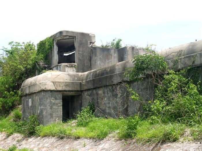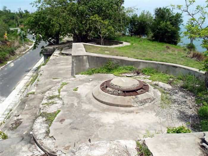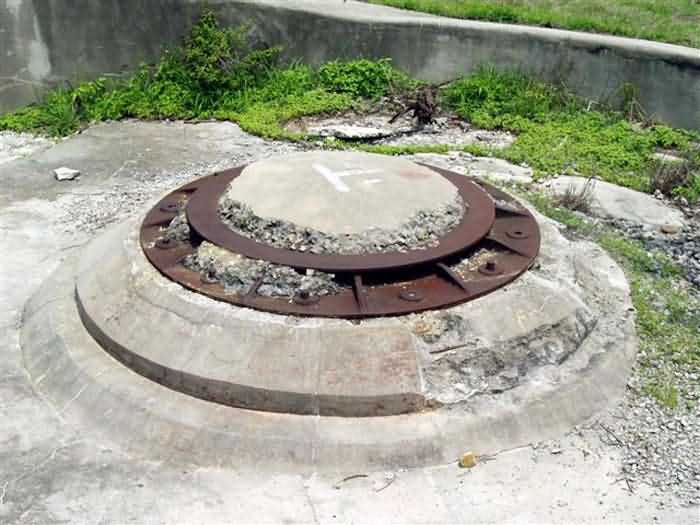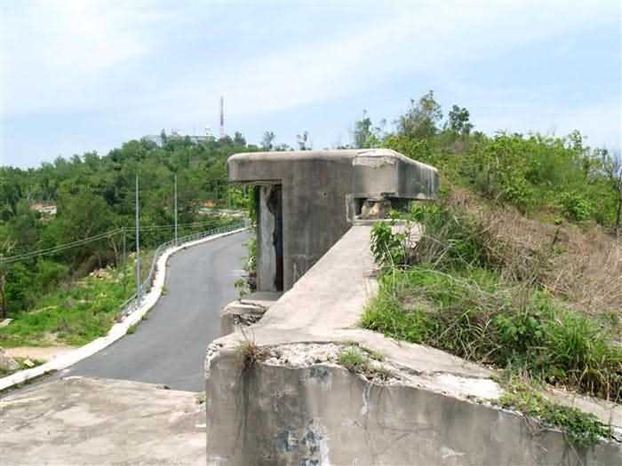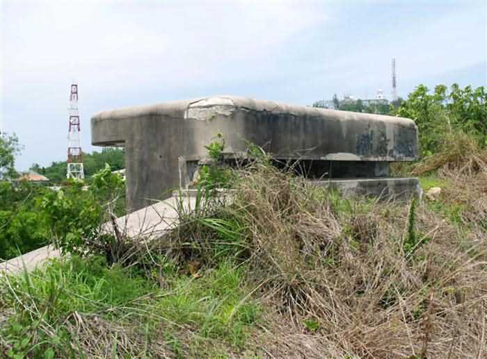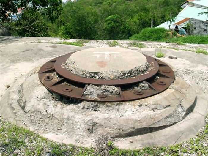 Cape Saint-Jacques. This battery, coded B2, is installed at an altitude of 125 metres and is part of the Lighthouse group. It is a modern reinforced concrete work, comprising four emplacements armed, in 1912, with four 194 mm guns Mle 1893-96 M on PC carriage with inclined chassis. It is identical to its neighbour, the Cable battery. These two works are undoubtedly among the most accomplished French coastal battery designs on the eve of the First World War. Only batteries armed with 240 mm guns Mle 1893-96 M "Colonies", under turret or on PC carriage, can be compared to them. The barrel of the 194 mm Mle 1893-96 M was manufactured in only nine examples by the Ruelle foundry, and its carriage with inclined chassis in 8 examples by Schneider, in Le Creusot. At an angle of 12°, it can fire an armour-piercing shell to 10,465 metres. No document, nor any photograph, of this equipment in position has reached us. The battery presents itself as a monolithic reinforced concrete structure, 80 metres long. A service gallery, accessible via three protected entrances, runs behind the gorge wall. It connects to the distribution chambers of the pieces via short sections of gallery. The supply of the piece is via a vertical metal shaft, emerging in the centre of the sub-saddle, as can still be seen on the 240 mm pieces Mle 1902-06 of the Lighthouse battery. Everything suggests that the 240 mm "Colonies" batteries on PC carriage were organised in the same way, although none of them have reached us in that state. The command posts, located at both ends of the battery, are reinforced concrete and foreshadow the future fire control posts of the interwar period. The pieces remained in position for only a very short time, the work was disarmed during the First World War and its equipment sent back to mainland France. It was not reused in 1939, despite a 1930 project, which planned to merge it with the Cable battery to form a modernised battery, armed with 4 194 mm guns Mle 1893-96 M on PC carriage modified for high-angle fire. Indeed, of the eight barrels from the two batteries sent back to mainland France, four were lost in the torpedoing of the ship transporting them, but the other four were available in mainland France. As for the carriages, they were still at Cape Saint-Jacques. This project was not followed up. The battery has recently been cleared of vegetation and is in remarkable condition. The shafts of the supply conduits, emerging in the centre of the sub-saddles, were covered, after the dismantling of the pieces, with a concrete plug that gives them the appearance of a disappearing turret in a lowered position. It is an exceptional site, even in the absence of its armament. JJM 03/07/2008