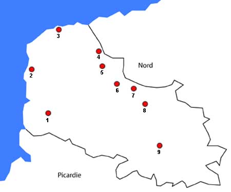 Velké řeči jsou k ničemu. Pas-de-Calais je na opevnění Séré de Rivières také chudý. Jednoduchá mapa s označením pevností, z nichž pouze Boulogne a Calais představují určitý zájem.