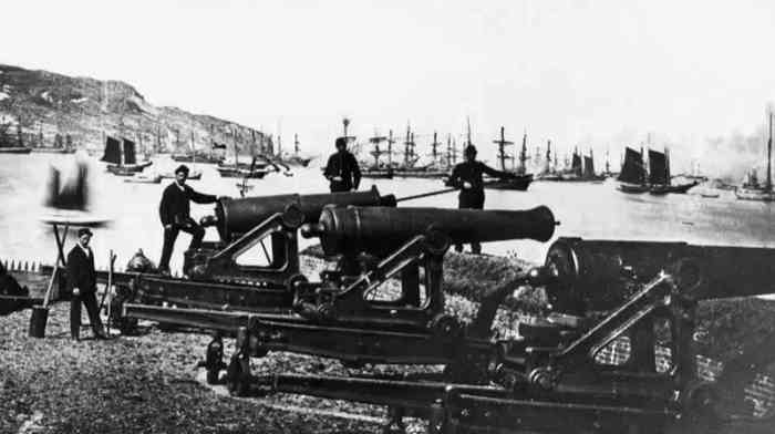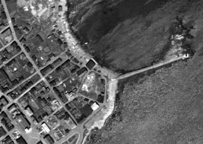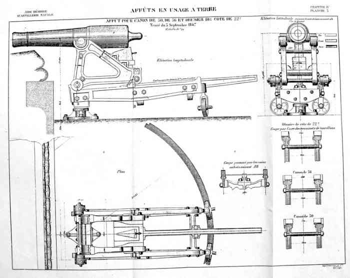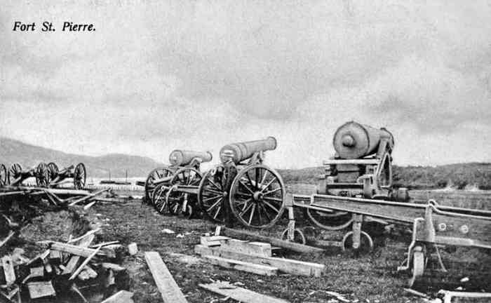 Saint-Pierre. Construite après 1850, il s’agit d’une fortification de plan semi-triangulaire, située près du phare de la pointe-aux-canons, sensiblement sur l’emplacement de l’actuel bâtiment de la Direction des Territoires, de l’Administration et de la Mer. Les quatre canons exposés de nos jours, à proximité immédiate, sont deux obusiers de 22 cm et deux canons de 30, les quatre sur affût Mle 1847. Ils correspondent à ceux visibles sur les photos d’époque. Il est donc probable qu’il s’agisse des pièces d’origine. Mais la photo aérienne de l’ouvrage montre qu’il devait posséder plus de quatre pièces. Certainement au moins huit. Ainsi que des pièces sur affût de campagne. Et qu’il a dû être utilisé comme arsenal, comme on peut le voir sur la troisième photo. Sur celle-ci, comme sur les autres, on ne voit qu’une petite moitié du front de l’ouvrage, celui orienté vers le nord-est. L’autre, orientée vers le sud-est reste invisible. À gauche, deux canons de 90 Mle 1877 sur affût de campagne, plus un dont on ne voit qu’une roue, puis un obusier de 22 cm, un canon de 30, et un autre obusier de 22 cm, puis l’arrière d’un affût orienté vers le sud-est, et trois canons sur affût de campagne abrités entre les autres. Nach 1850 erbaut, handelt es sich um eine Befestigung mit halbdreieckigem Grundriss, die sich in der Nähe des Leuchtturms von Pointe-aux-Canons befindet, etwa an der Stelle des heutigen Gebäudes der Direction des Territoires, de l’Administration et de la Mer. Die vier heute in unmittelbarer Nähe ausgestellten Kanonen sind zwei 22-cm-Haubitzen und zwei 30-Pfünder-Kanonen, alle vier auf Lafette Mle 1847. Sie entsprechen denen, die auf den zeitgenössischen Fotos zu sehen sind. Es ist daher wahrscheinlich, dass es sich um die ursprünglichen Geschütze handelt. Das Luftbild des Werks zeigt jedoch, dass es mehr als vier Geschütze besaß, sicherlich mindestens acht, sowie Geschütze auf Feldlafette. Und dass es als Arsenal genutzt wurde, wie auf dem dritten Foto zu sehen ist. Auf diesem, wie auf den anderen, sieht man nur eine kleine Hälfte der Front des Werks, die nach Nordosten ausgerichtete. Die andere, nach Südosten ausgerichtete, bleibt unsichtbar. Links zwei 90-mm-Kanonen Mle 1877 auf Feldlafette, plus eine, von der man nur ein Rad sieht, dann eine 22-cm-Haubitze, eine 30-Pfünder-Kanone und eine weitere 22-cm-Haubitze, dann die Rückseite einer nach Südosten ausgerichteten Lafette und drei Kanonen auf Feldlafette, die zwischen den anderen untergebracht sind. Gebouwd na 1850, betreft het een versterking met een halfdriehoekig grondplan, gelegen nabij de vuurtoren van Pointe-aux-Canons, ongeveer op de plaats van het huidige gebouw van de Direction des Territoires, de l’Administration et de la Mer. De vier tegenwoordig in de onmiddellijke nabijheid tentoongestelde kanonnen zijn twee 22 cm-houwitsers en twee 30-pondskanonnen, alle vier op affuit Mle 1847. Ze komen overeen met die zichtbaar op de foto's van die tijd. Het is daarom waarschijnlijk dat het de originele stukken zijn. Maar de luchtfoto van het werk toont aan dat het meer dan vier stukken moet hebben gehad, zeker minstens acht, alsmede stukken op veldaffuit. En dat het als arsenaal moet zijn gebruikt, zoals te zien is op de derde foto. Op deze, zoals op de andere, ziet men slechts een kleine helft van het front van het werk, de naar het noordoosten gerichte. De andere, naar het zuidoosten gericht, blijft onzichtbaar. Links twee 90 mm-kanonnen Mle 1877 op veldaffuit, plus een waarvan men slechts een wiel ziet, dan een 22 cm-houwitser, een 30-pondskanon en nog een 22 cm-houwitser, dan de achterkant van een affuit gericht naar het zuidoosten, en drie kanonnen op veldaffuit beschut tussen de andere. Built after 1850, it is a fortification with a semi-triangular plan, located near the Pointe-aux-Canons lighthouse, roughly on the site of the current building of the Direction des Territoires, de l’Administration et de la Mer. The four cannons displayed today in the immediate vicinity are two 22 cm howitzers and two 30-pounder guns, all four on mounting Mle 1847. They correspond to those visible in contemporary photos. It is therefore likely that they are the original pieces. However, the aerial photo of the work shows that it must have had more than four pieces, certainly at least eight, as well as pieces on field mountings. And that it must have been used as an arsenal, as can be seen in the third photo. In this one, as in the others, only a small half of the work's front is visible, the one facing north-east. The other, facing south-east, remains invisible. On the left, two 90 mm guns Mle 1877 on field mounting, plus one of which only a wheel is visible, then a 22 cm howitzer, a 30-pounder gun, and another 22 cm howitzer, then the back of a mounting facing south-east, and three guns on field mounting sheltered between the others. Postaveno po roce 1850, jedná se o opevnění polotrojúhelníkového půdorysu, nacházející se poblíž majáku Pointe-aux-Canons, zhruba na místě dnešní budovy Direction des Territoires, de l’Administration et de la Mer. Čtyři dnes v bezprostřední blízkosti vystavená děla jsou dvě 22cm houfnice a dvě 30liberní děla, všechna čtyři na lafetě vz. 1847. Odpovídají těm, která jsou vidět na dobových fotografiích. Je tedy pravděpodobné, že jde o původní kusy. Ale letecký snímek díla ukazuje, že muselo mít více než čtyři kusy, určitě nejméně osm, a také kusy na polních lafetách. A že muselo být používáno jako arzenál, jak je vidět na třetí fotografii. Na této, stejně jako na ostatních, je vidět jen malá polovina čela díla, ta orientovaná na severovýchod. Druhá, orientovaná na jihovýchod, zůstává neviditelná. Vlevo dvě 90mm děla vz. 1877 na polní lafetě, plus jedno, z něhož je vidět jen kolo, pak 22cm houfnice, 30liberní dělo a další 22cm houfnice