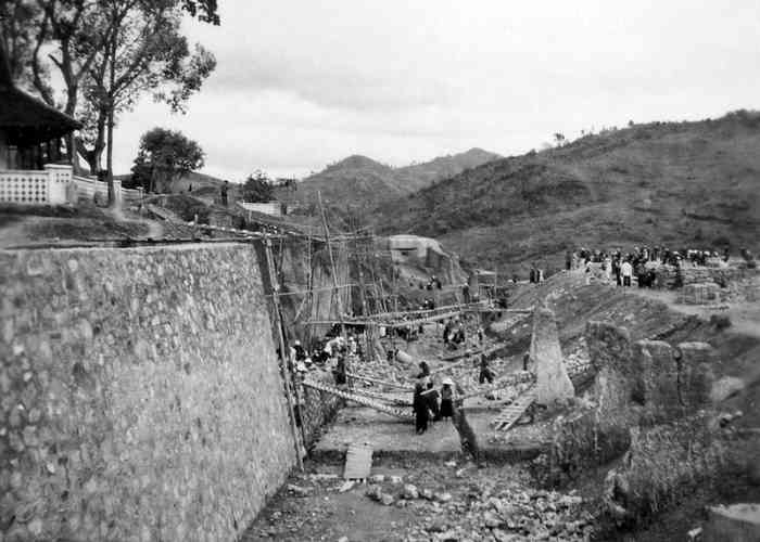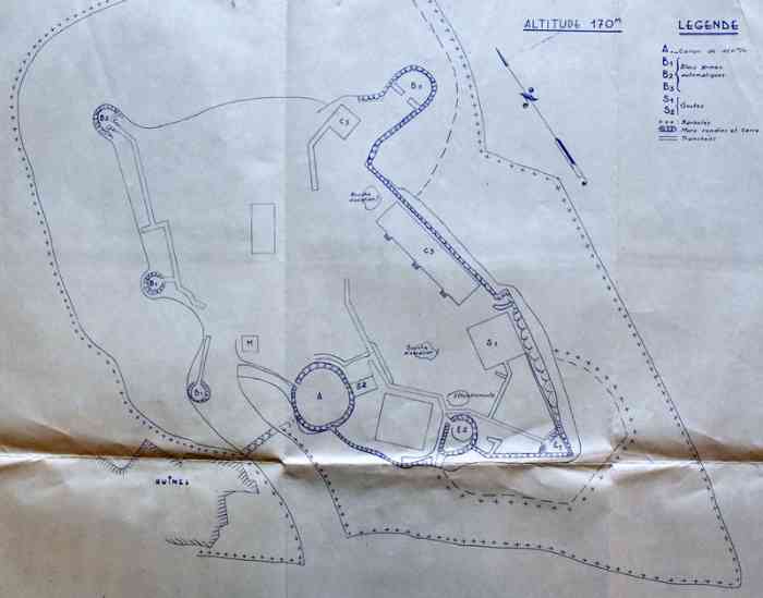 Lao Kay. Il s’agit de l’un des deux ouvrages modernes, rĂ©alisĂ©s entre 1942 et 1945 pour la dĂ©fense de Lao Kay. Il porte le nom du gĂ©nĂ©ral ThĂ©ophile Pennequin (1849-1916), ancien commandant supĂ©rieur des troupes de l’Indochine, et promoteur de l’idĂ©e d’« armĂ©e jaune ». SituĂ© sur la rive gauche du Fleuve Rouge, l’ouvrage comprend une enceinte maçonnĂ©e, de 400 mètres de dĂ©veloppement, flanquĂ©e par des casemates en bĂ©ton pour mitrailleuses. Son infrastructure souterraine, comprenant entre autres installations un casernement pour deux compagnies, est reliĂ©e Ă des casemates en bĂ©ton, situĂ©es sur les dessus, dont une est armĂ©e d’un canon de 75 sur affĂ»t Mle 1916. On estime que sa rĂ©alisation a nĂ©cessitĂ© 40 000 mÂł de terrassements, 5 000 mÂł de maçonnerie de moellons et 8 200 mÂł de bĂ©ton. Le 9 mars 1945, il n’est pas terminĂ©. Il est dĂ©fendu par la 7e compagnie du II/1er rĂ©giment de tirailleurs tonkinois, sous les ordres du capitaine Descratoulet. AttaquĂ© par surprise Ă 22 heures 30, il tombe quatre heures après, malgrĂ© une belle rĂ©sistance, les Japonais ayant rĂ©ussi Ă s’infiltrer Ă l’aide des Ă©chafaudages et de la passerelle du chantier du casernement de sĂ»retĂ©, en cours de rĂ©alisation sur les dessus. L’ouvrage est partiellement dĂ©truit par les troupes chinoises, avant leur dĂ©part, en 1946. En mai 1950, l’armĂ©e française envisage de rĂ©utiliser les parties souterraines, en relativement bon Ă©tat, comme abri et dĂ©pĂ´t de matĂ©riels divers. Il est mĂŞme envisagĂ© de remettre en Ă©tat les casemates faisant face Ă la Chine. Les Ă©vĂ©nements ne laisseront pas la possibilitĂ© de dĂ©velopper ces projets. Es handelt sich um eines der beiden modernen Werke, die zwischen 1942 und 1945 fĂĽr die Verteidigung von Lao Kay errichtet wurden. Es trägt den Namen von General ThĂ©ophile Pennequin (1849-1916), ehemaliger Oberbefehlshaber der Truppen Indochinas und Förderer der Idee einer „gelben Armee“. Am linken Ufer des Roten Flusses gelegen, umfasst das Werk eine gemauerte Umwallung von 400 Metern Länge, flankiert von Betonkasematten fĂĽr Maschinengewehre. Seine unterirdische Infrastruktur, die unter anderem eine Kaserne fĂĽr zwei Kompanien umfasst, ist mit Betonkasematten auf den Oberflächen verbunden, von denen eine mit einer 75-mm-Kanone auf Lafette Mle 1916 bewaffnet ist. Schätzungsweise erforderten seine AusfĂĽhrung 40 000 mÂł Erdbewegungen, 5 000 mÂł Bruchsteinmauerwerk und 8 200 mÂł Beton. Am 9. März 1945 ist es nicht fertiggestellt. Es wird von der 7. Kompanie des II/1. Tonkin-SchĂĽtzenregiments unter dem Befehl von Hauptmann Descratoulet verteidigt. Um 22:30 Uhr ĂĽberraschend angegriffen, fällt es vier Stunden später, trotz tapferen Widerstands, da die Japaner es mit Hilfe von GerĂĽsten und der BaubrĂĽcke der im Bau befindlichen Sicherheitskaserne auf den Oberflächen geschafft haben, einzudringen. Das Werk wird 1946 von chinesischen Truppen vor ihrem Abzug teilweise zerstört. Im Mai 1950 erwägt die französische Armee, die relativ gut erhaltenen unterirdischen Teile als Unterstand und Depot fĂĽr diverses Material wiederzuverwenden. Es wird sogar erwogen, die nach China ausgerichteten Kasematten wieder instand zu setzen. Die Ereignisse werden keine Möglichkeit geben, diese Projekte zu entwickeln. Het betreft een van de twee moderne werken, gerealiseerd tussen 1942 en 1945 voor de verdediging van Lao Kay. Het draagt de naam van generaal ThĂ©ophile Pennequin (1849-1916), voormalig opperbevelhebber van de troepen in Indochina en promoter van het idee van een „gele leger“. Gelegen op de linkeroever van de Rode Rivier, omvat het werk een gemetselde omwalling van 400 meter lengte, geflankeerd door betonnen kazematten voor mitrailleurs. Zijn ondergrondse infrastructuur, die onder andere een kazerne voor twee compagnieĂ«n omvat, is verbonden met betonnen kazematten op de bovenzijden, waarvan er één is bewapend met een 75 mm-kanon op affuit Mle 1916. Geschat wordt dat de realisatie 40 000 mÂł grondverzet, 5 000 mÂł puinsteenmetselwerk en 8 200 mÂł beton heeft gevergd. Op 9 maart 1945 is het niet voltooid. Het wordt verdedigd door de 7e compagnie van het II/1e regiment Tonkinse scherpschutters, onder bevel van kapitein Descratoulet. Om 22:30 uur verrassend aangevallen, valt het vier uur later, ondanks mooi verzet, omdat de Japanners erin zijn geslaagd binnen te dringen met behulp van steigers en de bouwbrug van de in aanbouw zijnde veiligheidskazerne op de bovenzijden. Het werk wordt in 1946 gedeeltelijk verwoest door Chinese troepen, voor hun vertrek. In mei 1950 overweegt het Franse leger de relatief goede ondergrondse delen opnieuw te gebruiken als schuilplaats en depot voor divers materiaal. Er wordt zelfs overwogen de naar China gerichte kazematten te herstellen. De gebeurtenissen zullen geen mogelijkheid bieden deze projecten te ontwikkelen. This is one of the two modern works built between 1942 and 1945 for the defence of Lao Kay. It bears the name of General ThĂ©ophile Pennequin (1849-1916), former senior commander of the troops of Indochina, and promoter of the idea of a “yellow army”. Located on the left bank of the Red River, the work comprises a masonry enceinte 400 metres in length, flanked by concrete machine gun casemates. Its underground infrastructure, including among other installations barracks for two companies, is connected to concrete casemates located on the tops, one of which is armed with a 75 mm gun on mounting Mle 1916. It is estimated that its construction required 40,000 mÂł of earthworks, 5,000 mÂł of rubble masonry and 8,200 mÂł of concrete. On 9 March 1945, it is not finished. It is defended by the 7th company of the II/1st Tonkinese Rifle Regiment, under the command of Captain Descratoulet. Attacked by surprise at 22:30 hours, i