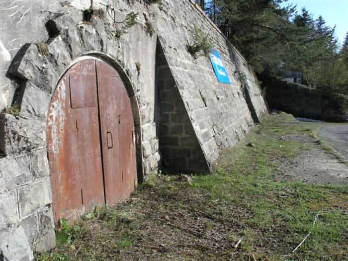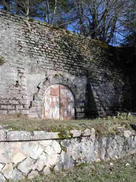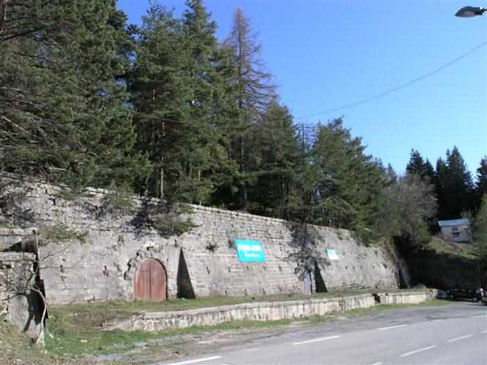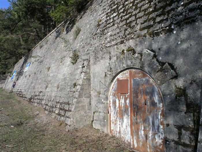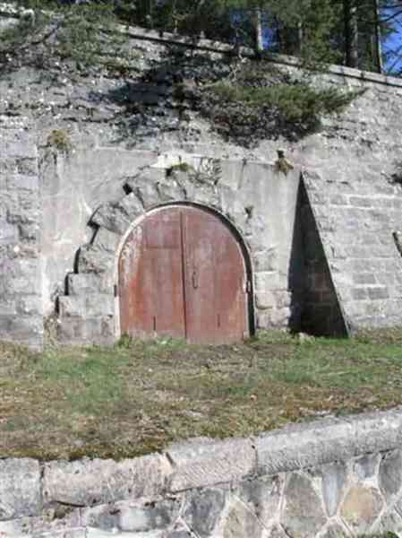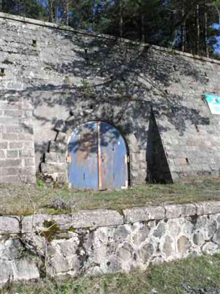 North-eastern avancées of Nice, 7,400 m north-north-west of Sospel, Authion massif. 1,430 m/alt. Important mountain barracks, erected between 1876 and 1887 behind the Authion massif and its fortified works. The Crénan barracks (by its name Boulanger), although sadly abandoned, still has a proud appearance, notwithstanding its sheet metal roofs. Occupied until 1940 by alpine troops, many children played there during holiday camps after the second war. Essential element of the village, this barracks seems forgotten by all, it is just if Internet sites dealing with the village deign to grant it a line, and even less a photo. In Peïra Cava, a barracks is dying…. Five hundred meters north of this barracks, facing a parking lot (1,445 m/alt), another element has on its part downright fallen into oblivion. If our wanderings had not led us to the site (05/2008), let us bet that we could not have mentioned it because no written trace of it was found. It is a rock magazine with three entrances. The latter, aligned along a facade approaching 35 m in length, are not equidistant, doors 2 and 3 being further apart from each other than 1 and 2. The facade has a rather pronounced batter in which each access appears as notched. Each gallery has a width of two meters and is closed by metal doors allowing little distinction of the interior. We estimated the length of the galleries at about fifteen meters. In each of them, beautiful distances of umbrella in galvanized sheets are visible. At mid-length, galleries 1 and 3 show a beginning of a gallery heading perpendicularly both towards gallery no. 2. The villagers designate the place as being the ammunition depot of the barracks, but no one knew who had the key(s). It is obvious that such infrastructure was far too important for the storage of infantry ammunition, so this is probably the central magazine of the Authion fortifications.