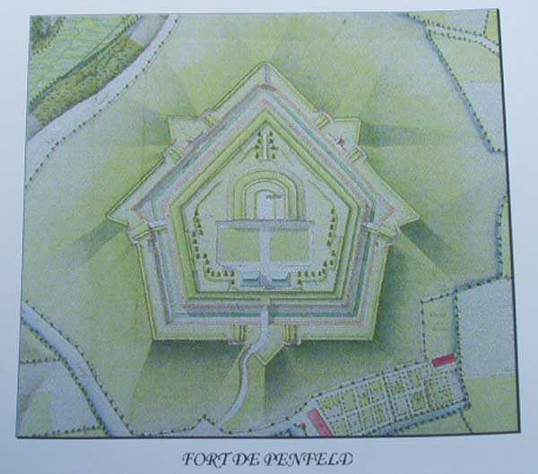 Place de Brest, nord de la ville, 1777-1782. 42 m/alt. Un des forts détachés dus au marquis de Langeron, le fort de Penfeld affecte la forme d'un pentagone. Bombardé en 1944 et quasiment inoccupé depuis, sa visite est intéressante. Bien qu'il n'ait plus servi en tant qu'ouvrage d'artillerie dans la période couverte par cet index, il y entre de plain pied en raison de la modification d'une de ses poudrières en magasin modèle 1874. La pièce de stockage, de 9,5 x 6 m, possède trois créneaux à lampe. L'aménagement d'un sas d'entrée a débordé dans le couloir en capitale. Un rapport de 1914 considère le fort comme « solide » et un document daté du 26 janvier 1911 prévoit de l'armer avec 4 canons de 90 c. Notons d'ailleurs que les plans d'armement de 1901 et de 1905 lui attribuaient respectivement 4 x 16 c + 4 canons de 7 et 4 x 16 c + 4 x 90 mm. On peut y voir de superbes galeries de contrescarpe, un casernement dont la façade entière accuse un fruit assez important et un très beau puits d'eau potable. Propriété de la Marine, sa visite doit faire l'objet d'une demande d'autorisation. Localement appelé fort de Villeneuve.