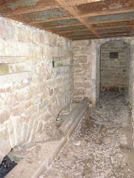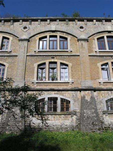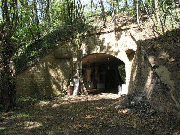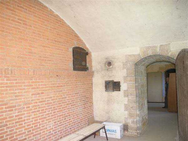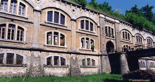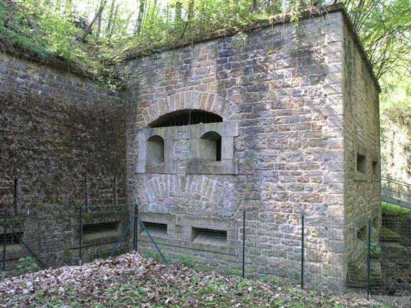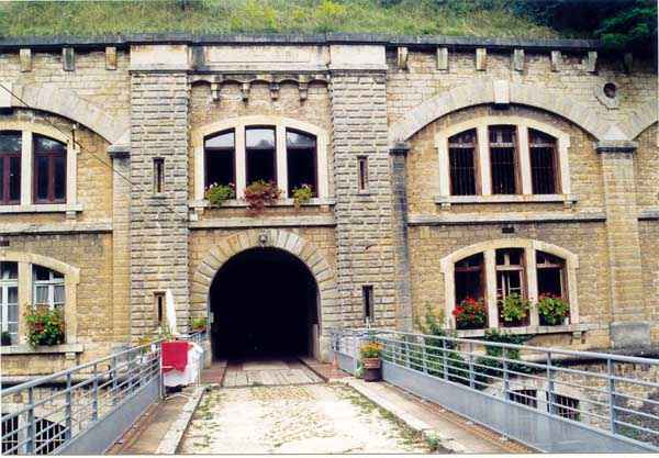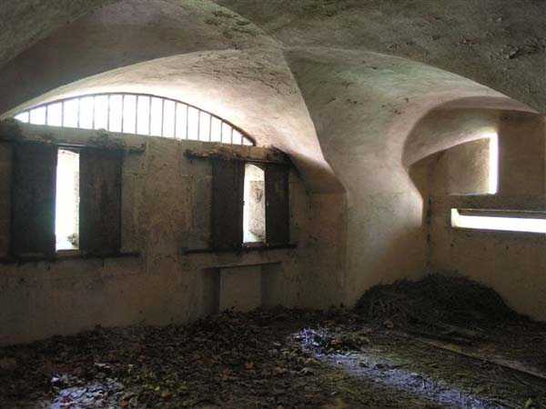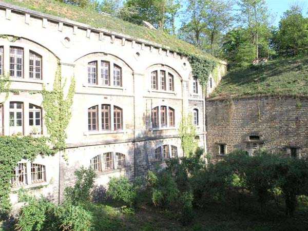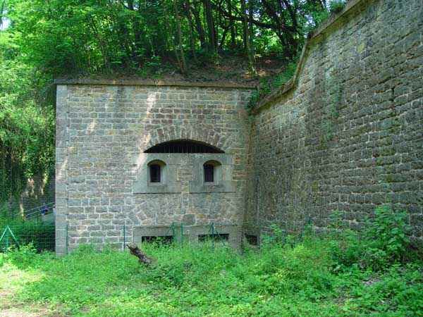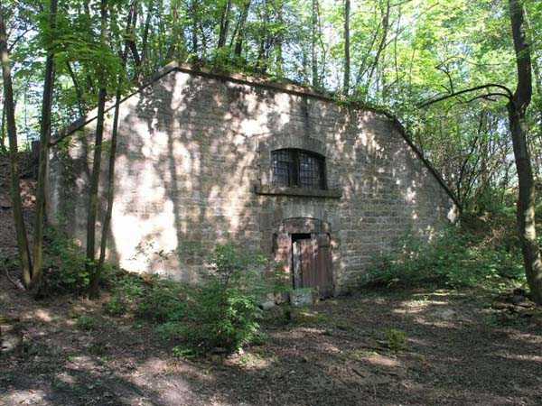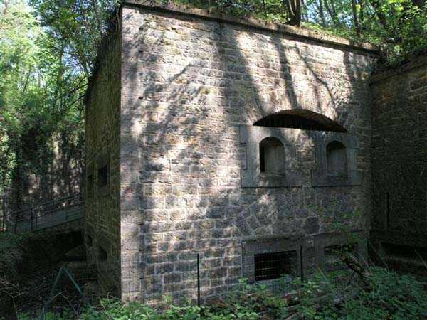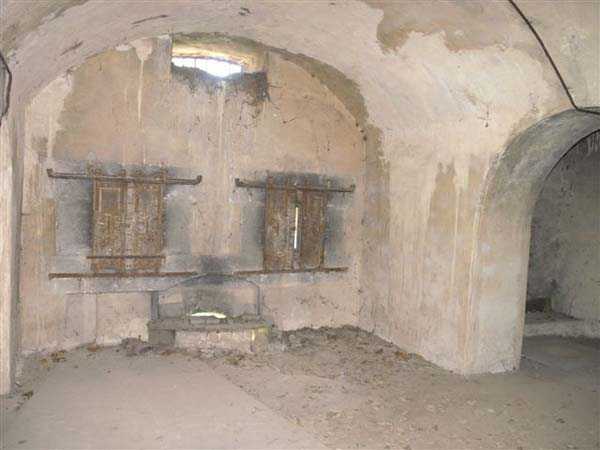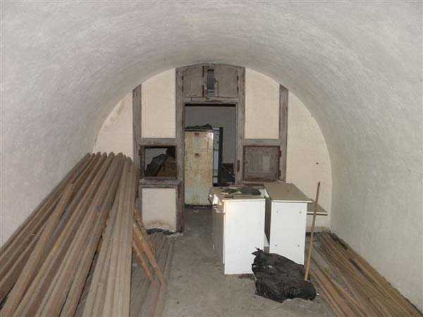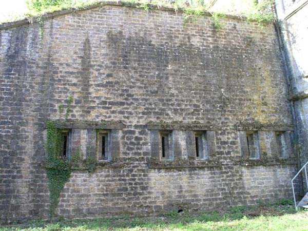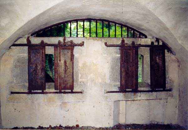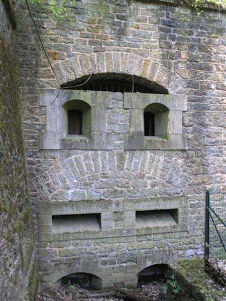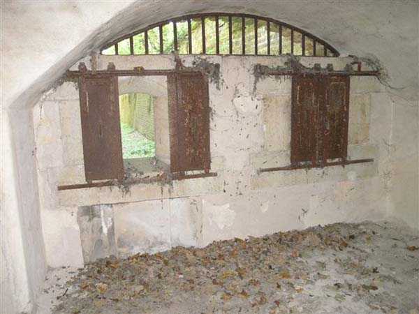 Fortress of Lyon, north-west of the city, 1883-1886. 380 m above sea level. About 300 men and about twenty artillery pieces. It monitored the road coming from Bourges. Before any description, it should be noted that we have here an exceptional fort in every way. Not only is it full of peculiarities, but of all French forts for the period 1874-1886, it is the one that has preserved the most original elements. To avoid repeating many times, let the reader know that each time an asterisk appears, the indicated element is to be considered extremely rare or even unique. It is a pentagonal fort whose perimeter has an outgrowth forming a sixth salient in the extension of the right counterscarp casemate*. Consequently having a sixth front, about forty meters long, it was deemed appropriate to defend it with a 12 breech-loading cannon installed in the extension of a corridor forming a gun cellar perpendicular* to that of the right counterscarp casemate. The embrasures of these counterscarp casemates are particular and different from one casemate to another*. The left counterscarp casemate has six embrasures for musketry fire, while the right one had in its center a casemate housing a 12 breech-loading cannon and, probably, a revolver cannon beside it, a casemate framed by two small lodges each containing only one rifle embrasure*. Behind the outer lodge is, as the enameled plate attests, a small magazine for projectiles and cartridges with its complete fittings*. The entrance is protected by a small ravelin on the glacis. Majestic, with a festooned pediment, the entrance opens in the center of the barracks which comprises, over seven bays + two halves, no less than three levels occupying the entire depth of the gorge curtain*. The basement is a real journey through time. One can contemplate an intact bread oven there, just waiting to return to service. Behind this oven, an extension creates an ideal space for letting dough rise*. Not far away are the kitchens. These still have their original tables* as well as two François-Vaillant stoves model 1886*. One has a capacity of 500 liters in 4 cauldrons of 125 liters and the second, smaller, has two cauldrons of 50 liters, namely one of cast iron and the other riveted*. A well topped with a pump of brand Livet, Model 1904*, adjoins a washroom that has retained its plumbing including a robust tap*. The circulation corridor of this basement runs along a 500 m³ cistern whose accesses are from the ground floor. In the basement corridor, one can still observe the gauge of this cistern with its float*. The ground floor houses a second water pump, drawing from the aforementioned cistern. Also of brand Livet, it bears a plate indicating 1885* as the year of manufacture. This level shows two pretty stairwells leading to the upper floor and officers' latrines that have retained their enameled plate*. On the first floor, on the left, an artillery magazine includes lamp hatches of a probably non-regulation model, with an evacuation orifice for combustion gases*. An ironwork staircase* allows access to the infantry sally port at the top of the barracks. From there, it is easy to notice the many original skylights which, for the most part, have their lightning rod devices*. The barracks probably have 95% of their original fittings, solid doors, lattice doors, interior and exterior windows, including locks, latches, bolts, window catches, bolts, etc. Also numerous are the enameled plates with indications of the purposes of the rooms. The powder magazine, with a capacity of 51 tons, is installed to the left of the barracks. If there had not been at least one iconoclast within the local shooting club to misdirect, more or less unfortunately, a few bullets into the tempered glass panes, the latter would be intact, as would the flameproof grids of the various ventilations. On the other hand, fittings and hardware in both iron and bronze are present, as well as the floor and its rafters at the bottom of the partitions*. In the extension of the entrance porch, the main tunnel, with its segmental arch vault, shows a paved roadway bordered by sidewalks. Before reaching the rampart street, we find on the left and right a room with sliding doors suspended from a rail. The left room bears an enameled plate indicating the forge*. The rampart street between salients I and V describes an almost perfect semicircle. This street runs alternately along an enveloped traverse, followed by a rooted traverse. However, in the center and behind front III-IV, there is a two-level traverse. This one has the peculiarity of having not a basement, but indeed a first floor*! The latter also has a large window overlooking the rampart street. The rooted traverses also have a floor, but by force of circumstance, it has no window. In all four cases, the floors are reached by elegant staircases with superbly adjusted steps and provided with their original railings*. Is it necessary to specify that here too, the fittings are complete, including the trapdoor flaps that allow the passage of material or ammunition from the ground floor to the first floor? The enveloped traverses mostly have their original doors opening under the vault occupied by fixed shutters*. From the end of each rooted traverse, one gains access via a shaft either to a wing (salients II and IV) or to the double caponier (salient III). A third wing, at salient V, is reached via a shaft running along the left side of the last enveloped traverse of the rampart street. We were unable to access this last defensive organ, so the following comment concerns only those of salients II, III and IV. The curves of the vaulted passages and rooms of the caponiers give no hint of their singular exterior appearance, parallelepiped, almost Bauhaus. The segmental arches of the embrasures lacking visors contribute much less to breaking these right angles than the spur buttresses* reinforcing the base of the piers of their faces. These spur buttresses