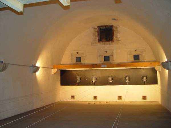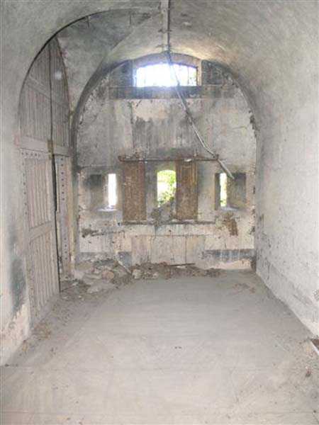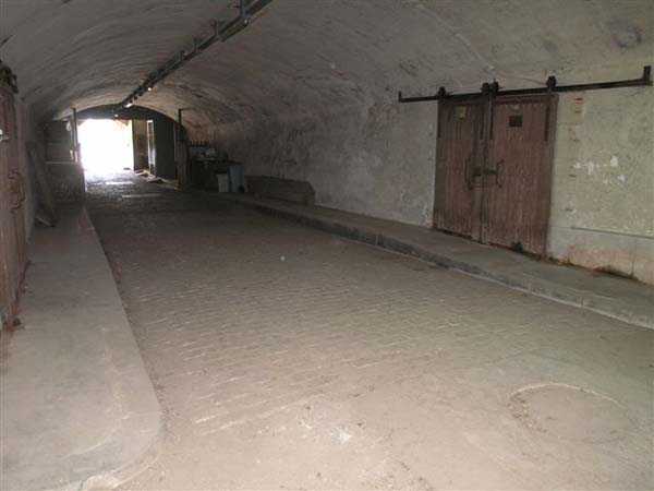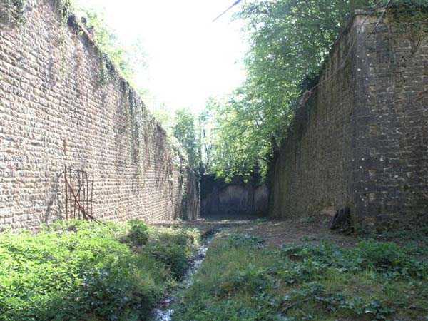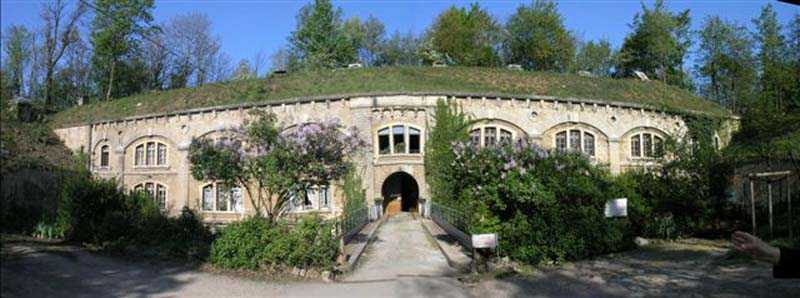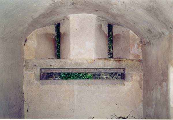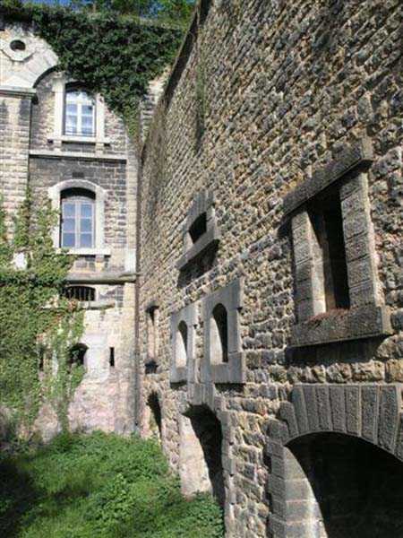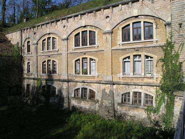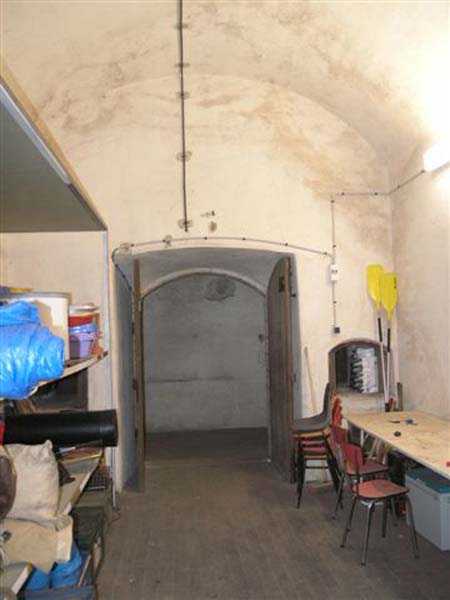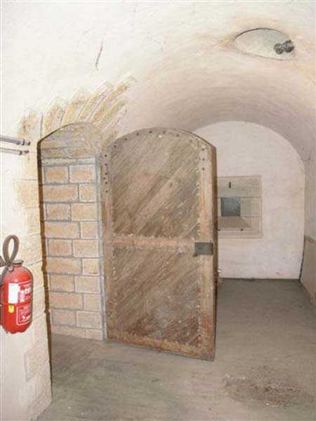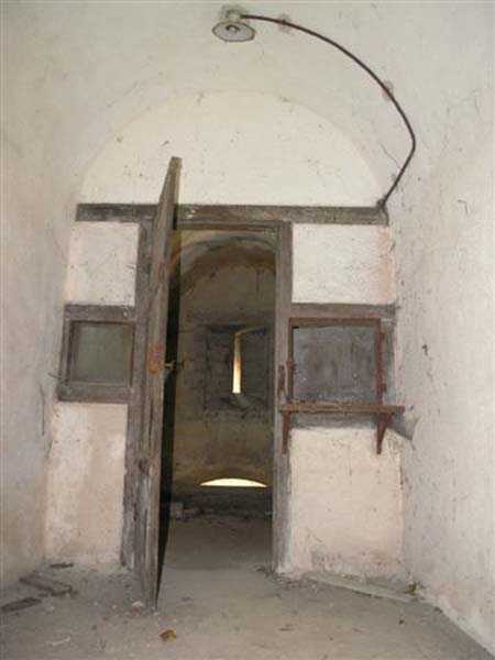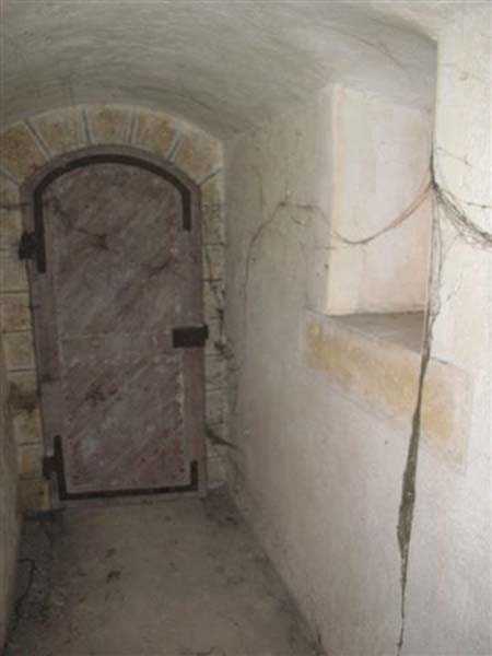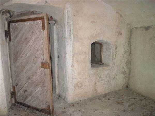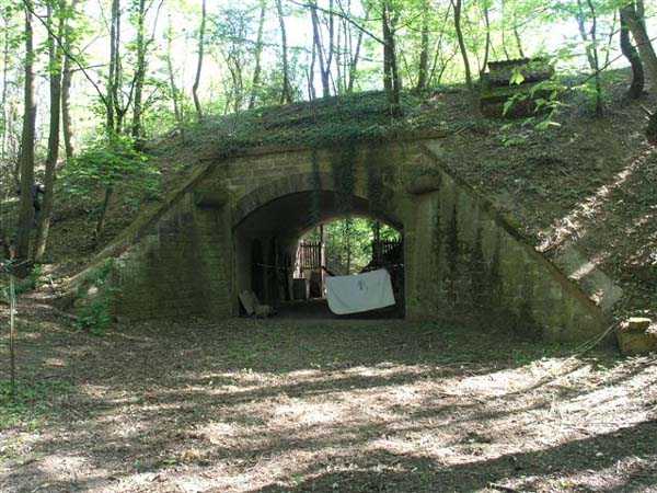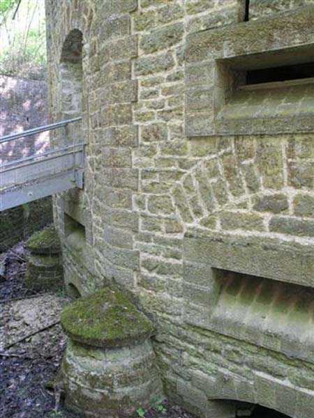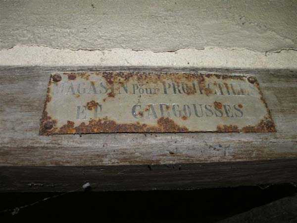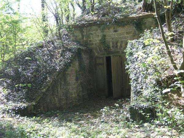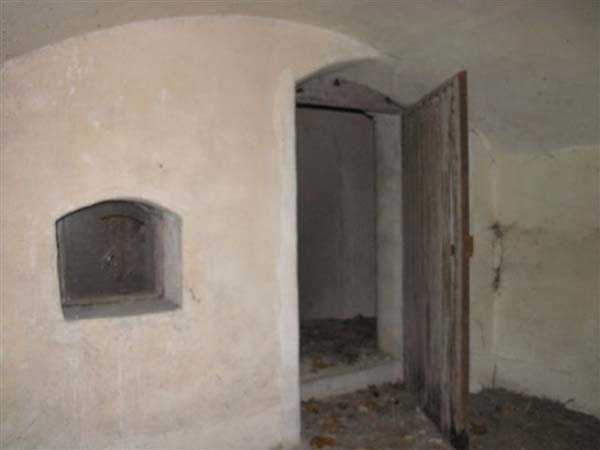 Fortress of Lyon, north-west of the city, 1883-1886. 380 m above sea level. About 300 men and about twenty artillery pieces. It monitored the road coming from Bourges. Before any description, it should be noted that we have here an exceptional fort in every way. Not only is it full of peculiarities, but of all French forts for the period 1874-1886, it is the one that has preserved the most original elements. To avoid repeating many times, let the reader know that each time an asterisk appears, the indicated element is to be considered extremely rare or even unique. It is a pentagonal fort whose perimeter has an outgrowth forming a sixth salient in the extension of the right counterscarp casemate*. Consequently having a sixth front, about forty meters long, it was deemed appropriate to defend it with a 12 breech-loading cannon installed in the extension of a corridor forming a gun cellar perpendicular* to that of the right counterscarp casemate. The embrasures of these counterscarp casemates are particular and different from one casemate to another*. The left counterscarp casemate has six embrasures for musketry fire, while the right one had in its center a casemate housing a 12 breech-loading cannon and, probably, a revolver cannon beside it, a casemate framed by two small lodges each containing only one rifle embrasure*. Behind the outer lodge is, as the enameled plate attests, a small magazine for projectiles and cartridges with its complete fittings*. The entrance is protected by a small ravelin on the glacis. Majestic, with a festooned pediment, the entrance opens in the center of the barracks which comprises, over seven bays + two halves, no less than three levels occupying the entire depth of the gorge curtain*. The basement is a real journey through time. One can contemplate an intact bread oven there, just waiting to return to service. Behind this oven, an extension creates an ideal space for letting dough rise*. Not far away are the kitchens. These still have their original tables* as well as two François-Vaillant stoves model 1886*. One has a capacity of 500 liters in 4 cauldrons of 125 liters and the second, smaller, has two cauldrons of 50 liters, namely one of cast iron and the other riveted*. A well topped with a pump of brand Livet, Model 1904*, adjoins a washroom that has retained its plumbing including a robust tap*. The circulation corridor of this basement runs along a 500 m³ cistern whose accesses are from the ground floor. In the basement corridor, one can still observe the gauge of this cistern with its float*. The ground floor houses a second water pump, drawing from the aforementioned cistern. Also of brand Livet, it bears a plate indicating 1885* as the year of manufacture. This level shows two pretty stairwells leading to the upper floor and officers' latrines that have retained their enameled plate*. On the first floor, on the left, an artillery magazine includes lamp hatches of a probably non-regulation model, with an evacuation orifice for combustion gases*. An ironwork staircase* allows access to the infantry sally port at the top of the barracks. From there, it is easy to notice the many original skylights which, for the most part, have their lightning rod devices*. The barracks probably have 95% of their original fittings, solid doors, lattice doors, interior and exterior windows, including locks, latches, bolts, window catches, bolts, etc. Also numerous are the enameled plates with indications of the purposes of the rooms. The powder magazine, with a capacity of 51 tons, is installed to the left of the barracks. If there had not been at least one iconoclast within the local shooting club to misdirect, more or less unfortunately, a few bullets into the tempered glass panes, the latter would be intact, as would the flameproof grids of the various ventilations. On the other hand, fittings and hardware in both iron and bronze are present, as well as the floor and its rafters at the bottom of the partitions*. In the extension of the entrance porch, the main tunnel, with its segmental arch vault, shows a paved roadway bordered by sidewalks. Before reaching the rampart street, we find on the left and right a room with sliding doors suspended from a rail. The left room bears an enameled plate indicating the forge*. The rampart street between salients I and V describes an almost perfect semicircle. This street runs alternately along an enveloped traverse, followed by a rooted traverse. However, in the center and behind front III-IV, there is a two-level traverse. This one has the peculiarity of having not a basement, but indeed a first floor*! The latter also has a large window overlooking the rampart street. The rooted traverses also have a floor, but by force of circumstance, it has no window. In all four cases, the floors are reached by elegant staircases with superbly adjusted steps and provided with their original railings*. Is it necessary to specify that here too, the fittings are complete, including the trapdoor flaps that allow the passage of material or ammunition from the ground floor to the first floor? The enveloped traverses mostly have their original doors opening under the vault occupied by fixed shutters*. From the end of each rooted traverse, one gains access via a shaft either to a wing (salients II and IV) or to the double caponier (salient III). A third wing, at salient V, is reached via a shaft running along the left side of the last enveloped traverse of the rampart street. We were unable to access this last defensive organ, so the following comment concerns only those of salients II, III and IV. The curves of the vaulted passages and rooms of the caponiers give no hint of their singular exterior appearance, parallelepiped, almost Bauhaus. The segmental arches of the embrasures lacking visors contribute much less to breaking these right angles than the spur buttresses* reinforcing the base of the piers of their faces. These spur buttresses