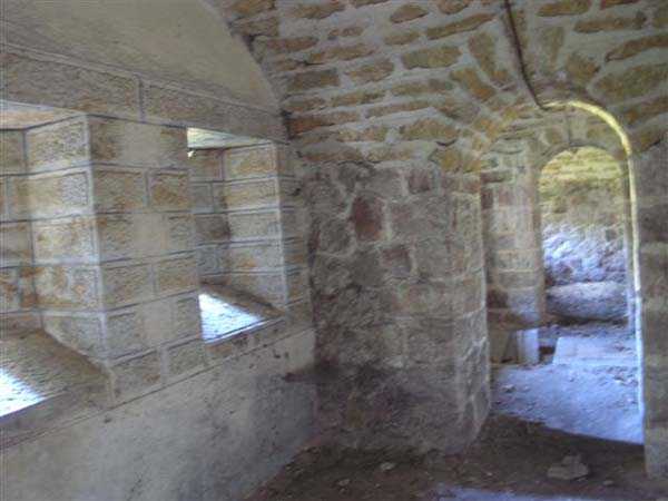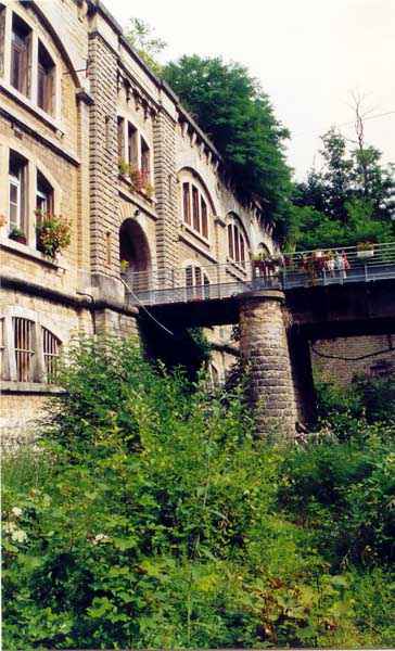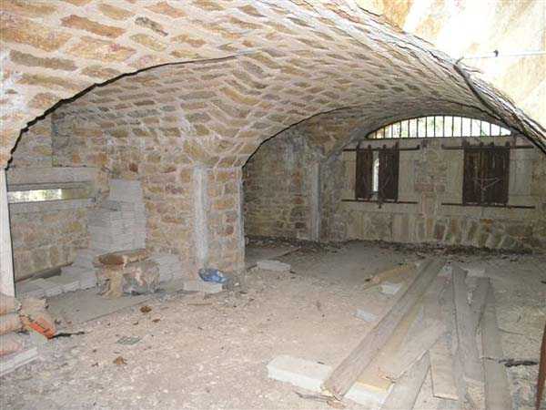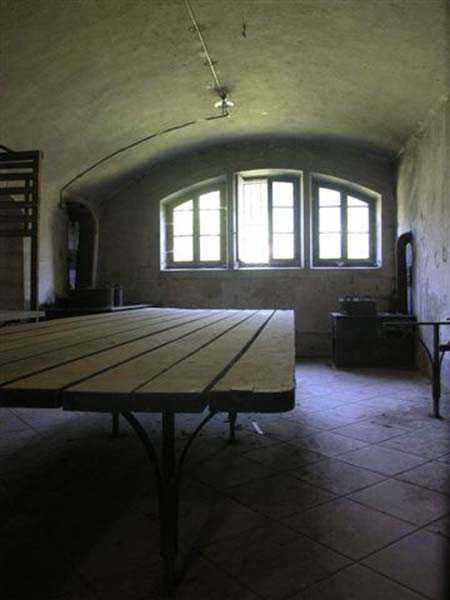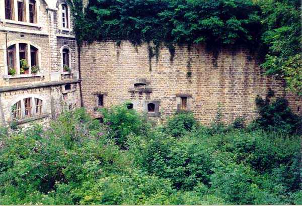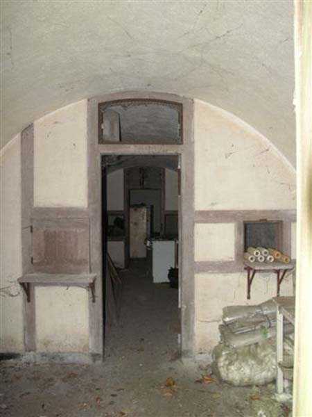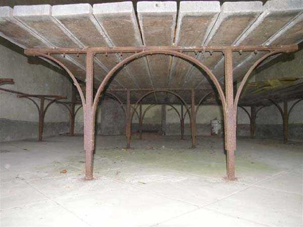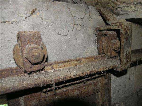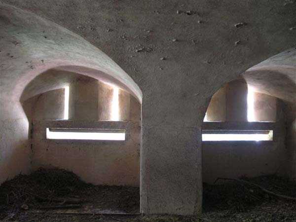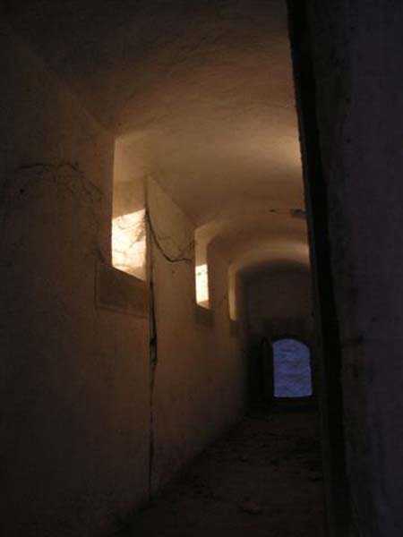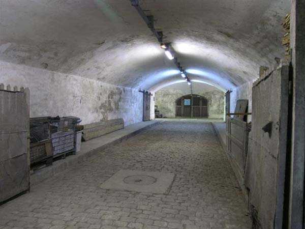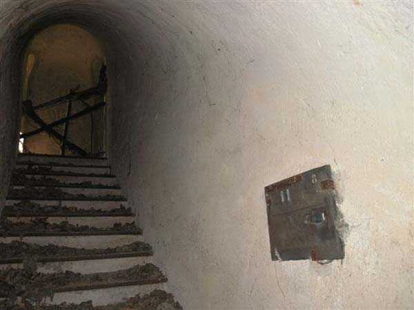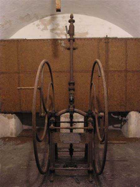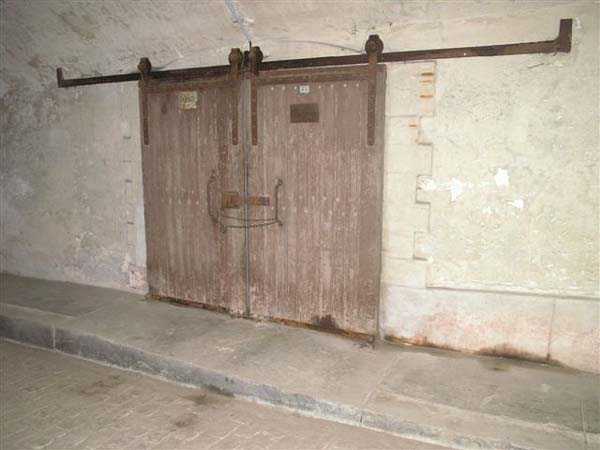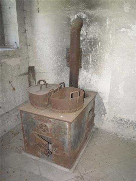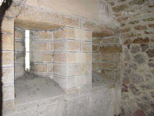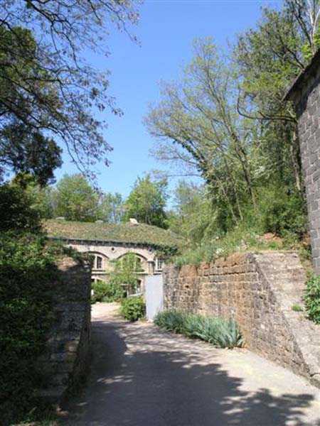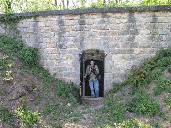 Fortress of Lyon, north-west of the city, 1883-1886. 380 m above sea level. About 300 men and about twenty artillery pieces. It monitored the road coming from Bourges. Before any description, it should be noted that we have here an exceptional fort in every way. Not only is it full of peculiarities, but of all French forts for the period 1874-1886, it is the one that has preserved the most original elements. To avoid repeating many times, let the reader know that each time an asterisk appears, the indicated element is to be considered extremely rare or even unique. It is a pentagonal fort whose perimeter has an outgrowth forming a sixth salient in the extension of the right counterscarp casemate*. Consequently having a sixth front, about forty meters long, it was deemed appropriate to defend it with a 12 breech-loading cannon installed in the extension of a corridor forming a gun cellar perpendicular* to that of the right counterscarp casemate. The embrasures of these counterscarp casemates are particular and different from one casemate to another*. The left counterscarp casemate has six embrasures for musketry fire, while the right one had in its center a casemate housing a 12 breech-loading cannon and, probably, a revolver cannon beside it, a casemate framed by two small lodges each containing only one rifle embrasure*. Behind the outer lodge is, as the enameled plate attests, a small magazine for projectiles and cartridges with its complete fittings*. The entrance is protected by a small ravelin on the glacis. Majestic, with a festooned pediment, the entrance opens in the center of the barracks which comprises, over seven bays + two halves, no less than three levels occupying the entire depth of the gorge curtain*. The basement is a real journey through time. One can contemplate an intact bread oven there, just waiting to return to service. Behind this oven, an extension creates an ideal space for letting dough rise*. Not far away are the kitchens. These still have their original tables* as well as two François-Vaillant stoves model 1886*. One has a capacity of 500 liters in 4 cauldrons of 125 liters and the second, smaller, has two cauldrons of 50 liters, namely one of cast iron and the other riveted*. A well topped with a pump of brand Livet, Model 1904*, adjoins a washroom that has retained its plumbing including a robust tap*. The circulation corridor of this basement runs along a 500 m³ cistern whose accesses are from the ground floor. In the basement corridor, one can still observe the gauge of this cistern with its float*. The ground floor houses a second water pump, drawing from the aforementioned cistern. Also of brand Livet, it bears a plate indicating 1885* as the year of manufacture. This level shows two pretty stairwells leading to the upper floor and officers' latrines that have retained their enameled plate*. On the first floor, on the left, an artillery magazine includes lamp hatches of a probably non-regulation model, with an evacuation orifice for combustion gases*. An ironwork staircase* allows access to the infantry sally port at the top of the barracks. From there, it is easy to notice the many original skylights which, for the most part, have their lightning rod devices*. The barracks probably have 95% of their original fittings, solid doors, lattice doors, interior and exterior windows, including locks, latches, bolts, window catches, bolts, etc. Also numerous are the enameled plates with indications of the purposes of the rooms. The powder magazine, with a capacity of 51 tons, is installed to the left of the barracks. If there had not been at least one iconoclast within the local shooting club to misdirect, more or less unfortunately, a few bullets into the tempered glass panes, the latter would be intact, as would the flameproof grids of the various ventilations. On the other hand, fittings and hardware in both iron and bronze are present, as well as the floor and its rafters at the bottom of the partitions*. In the extension of the entrance porch, the main tunnel, with its segmental arch vault, shows a paved roadway bordered by sidewalks. Before reaching the rampart street, we find on the left and right a room with sliding doors suspended from a rail. The left room bears an enameled plate indicating the forge*. The rampart street between salients I and V describes an almost perfect semicircle. This street runs alternately along an enveloped traverse, followed by a rooted traverse. However, in the center and behind front III-IV, there is a two-level traverse. This one has the peculiarity of having not a basement, but indeed a first floor*! The latter also has a large window overlooking the rampart street. The rooted traverses also have a floor, but by force of circumstance, it has no window. In all four cases, the floors are reached by elegant staircases with superbly adjusted steps and provided with their original railings*. Is it necessary to specify that here too, the fittings are complete, including the trapdoor flaps that allow the passage of material or ammunition from the ground floor to the first floor? The enveloped traverses mostly have their original doors opening under the vault occupied by fixed shutters*. From the end of each rooted traverse, one gains access via a shaft either to a wing (salients II and IV) or to the double caponier (salient III). A third wing, at salient V, is reached via a shaft running along the left side of the last enveloped traverse of the rampart street. We were unable to access this last defensive organ, so the following comment concerns only those of salients II, III and IV. The curves of the vaulted passages and rooms of the caponiers give no hint of their singular exterior appearance, parallelepiped, almost Bauhaus. The segmental arches of the embrasures lacking visors contribute much less to breaking these right angles than the spur buttresses* reinforcing the base of the piers of their faces. These spur buttresses