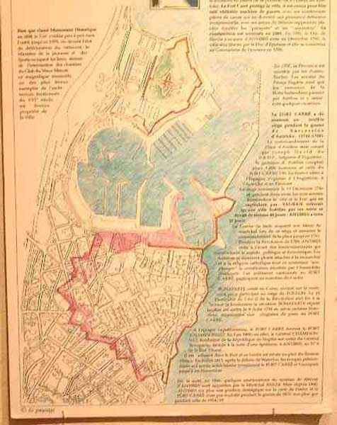 Festung von Antibes. 26 M ü M (der Wehrgang ist auf 43 M ü M). Bezeichnet als Fort Championnet. Sein Ursprung geht auf 1553 zurück, als ein runder Turm auf Befehl Heinrichs II. fertiggestellt wurde. Zwischen 1565 und 1585 wird eine bastionierte Umwallung um den Turm errichtet. Die Bastionen sind sehr schlank, durch Kurtinen getrennt, die kleiner sind als die Facen der Bastionen, und die Basis der Escarpe weist eine starke Böschung auf. Seine Garnison in Friedenszeiten betrug etwa 50 Mann, eine Zahl, die in Kriegszeiten vervierfacht wurde. Unter Ludwig XIII., dann Ludwig XIV., wird außerhalb des Forts eine bastionierte Front zur Landseite errichtet. Das Fort wird 1888 zur Außerdienststellung vorgeschlagen unter dem Vorbehalt, der im Text des Artikels über die Festung Antibes des vorliegenden Index übernommen wurde. 1906 als historisches Denkmal klassifiziert, ist es seit 1998 für die Öffentlichkeit zugänglich.
