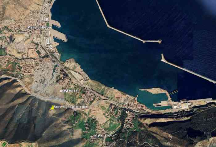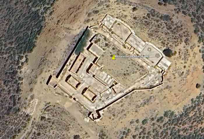 Oran. Batterie établie entre Oran et Mers el Kébir, à l’altitude moyenne de 225 mètres, et armée de 4 mortiers G de 270 Mle 1889 sur affût G à châssis circulaire. Les pièces sont regroupées par deux dans des alvéoles en béton armé, séparées et encadrées par des magasins de combat Mle 1901. Ces derniers sont ravitaillés à partir de magasins bétonnés, au moyen d’un circuit de voie de 40, formant une boucle complète. L’ouvrage est protégé, à la gorge et sur ses flancs, par un mur bastionné. Il est désarmé au cours de la Première Guerre mondiale, et ses matériels renvoyés en métropole. Il n’est pas réutilisé par la suite. Les vues satellitaires le montrent apparemment en bon état de conservation. JJM 10/08/2008