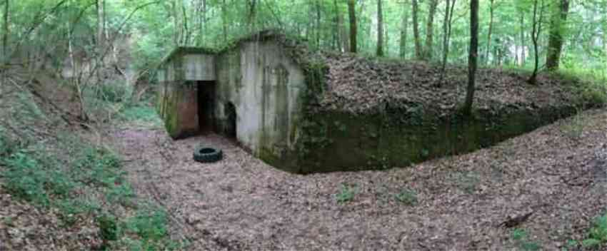 Befestigtes Lager Belfort, nordöstlich des Platzes, 1906. ± 430 m ü. M. Dieser rechts der Militärstraße, die zum Fort Roppe hinaufführt, neben zahlreichen Batterien und Verschanzungen errichtete Kampfbunker war für eine halbe Kompanie konzipiert. Zu diesem Zweck besteht er aus zwei Baracken, die jeweils über eine große Feuerstelle verfügen, die typisch für die Kampfbunker von Belfort ist. Die Pfosten der Fassade bestehen aus schönem Mauerwerk aus rosafarbenem Vogesensandstein, das mit der unvermeidlichen Betondecke abgedeckt ist. Die Latrinen befinden sich im rechten Flügel und bestehen aus zwei gegenüberliegenden Hocktoiletten. Links von den Baracken sollte ein 2 x 2 m großer Raum als Küche dienen. Direkt neben dem Bunker, links, ist trotz des Erdrutschs noch eine Nische in der Trockenmauer zu erkennen. Ihre genaue Funktion muss noch definiert werden. Im Fassadenkorridor rechts von der Kaserne befindet sich der Inspektionsraum für die Zisterne, die sich offenbar unter diesem Korridor befindet (wir konnten nicht hinuntergehen). Der Bunker und seine Kaserne wurden von allen Metallteilen befreit, sind aber insgesamt noch recht gut erhalten und kaum beschädigt. Er ist sehr gut vor äußeren Einflüssen geschützt, befindet sich in einer eigens dafür vorgesehenen Mulde und ist frei zugänglich (Stand: 06/2010).