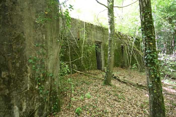 Befestigtes Lager Verdun, südöstlich der Stadt (Bereich Rozellier- Saint-Symphorien 2), 1900-1901. 360 m ü. M. Dieser 200 Meter nordöstlich des Saint-Symphorien-Bauwerks gelegene Unterstand diente einer Kompanie. Er wurde höchstwahrscheinlich zur gleichen Zeit wie sein Nachbar SSH-1 errichtet, dem er in jeder Hinsicht ähnelt. In der hervorragenden Arbeit von Barros, Berger und Brolli über Kampfbunker (siehe Bibliographie) können wir auf Seite 66 lesen: In den Bunkern RSS-2 und SSH-1 ist die Zisterne an der Seite des Bunkers vergraben, am Ausgang des Korridors gegenüber den Latrinen. Ihr Schutz gegen Granaten ist daher recht schwach. Wir haben kein Dokument gefunden, aus dem wir wissen könnten, ob diese Zisternen aus der Zeit des Baus der Bunker stammen oder später hinzugefügt wurden (…). Tatsächlich befindet sich außen links am Bunker eine fast kubische Betonnische mit etwa 100 cm Seitenlänge, unter der eine Vertiefung zu sehen ist. Handelt es sich dabei tatsächlich um eine Zisterne? Tatsache ist, dass sich im Bunker keine befindet. Zwischen 1909 und 1911 wurde in einem Vorsprung gegenüber den in der Wand des rechten Flügels eingebauten Latrinen eine kleine Küche einbetoniert. Abgesehen von einer Schmetterlingsluke in der Küche und den Halterungen für die Schornsteine in derselben Küche wurde dieser Unterstand vollständig von seinen Metallelementen befreit. Ansonsten sind seine Wände trocken und frei von Graffiti (05/2011). Wie lange schon? Beachten Sie, dass auf dem Dach des Unterstands ein über zwei Meter langer Metallschornstein steht, der in einer Astgabel aus Sträuchern lehnt und schwer zu datieren ist. Er ist allen Winden ausgesetzt.
