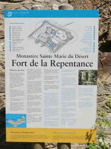 Vesting van Toulon, Hyères-eilanden, noord-noordoost van het eiland Porquerolles, 1882-1884. 114 m/alt. Toen de vooruitgang van de artillerie de verdedigingen van het eiland, zowel wat hun doeltreffendheid als hun aantal betreft, verouderd hadden gemaakt, werd besloten de bescherming van het eiland en zijn toegangen op één enkele site te concentreren. Een kennisgeving van de Commissie voor Kustverdediging, gedateerd 23 juni 1881 en goedgekeurd op 24 augustus daaropvolgend, wijst op een wil om "op de gelijknamige uitloper" een werk bewapend met 9 kanonnen 19 cm te vestigen. Waarschijnlijk is het dus niet aangewezen te beweren dat het door gevangenen werd gebouwd als… boetedoening. Het schijnt dat de intentie om een fort op deze hoogte te bouwen contemporain was met de commissie voorgezeten door Séré de Rivières, vanaf 1874. Een opmeting van de terreinen werd uitgevoerd in 1880, maar het zou duren tot 1882 om met de werken te beginnen en 1884 voor hun voltooiing. De geografie van de plaats maakte de vestiging van een werk voldoende groot voor de voorziene bewapening lastig. Uiteindelijk opteerde men voor twee werken die in een eerste tijd als centrumbatterij en noordbatterij werden aangeduid. De eerste zou het fort worden en de tweede wordt behandeld in een afzonderlijk artikel; zie: Repentance (aanvullende batterijen van het fort). In tegenstelling tot het fort van de Éminence op Port-Cros was het terrein hier vrij van eerdere constructies. Zelfs als zijn omtrek vrij bewogen is door de door het reliëf opgelegde grenzen, heeft het fort globaal een rechthoekige, bijna vierkante vorm. Het wordt omringd door een droge gracht waarvan de verdediging verzekerd werd vanaf de borstwering van de half-afzonderlijke escarpe evenals door een enkele, dubbele caponnière, geplaatst links van de ingang, op een kam van het terrein die de westelijke tak van de keelgracht een indrukwekkende duik oplegt. De contrescarpe is, op het niveau van deze caponnière, in ontladingsbogen. Drie grote slaapzalen grenzen aan de ingang aan weerszijden. Deze laatste bezitten, elk, drie geweersleuven gericht op de glacis van de keel en overwelfd door een verlichtingsvenster. In de circulatiegang vinden we evenveel lichtputten als er slaapzalen zijn, maar deze putten openen zich in de top van het tongewelf eerder dan in de dikte van de muur, en zijn wijd uitlopend in hun onderste deel. De ingang van het fort, in tunnel, laat niet meer toe zich rekenschap te geven van het type ophaalbrug dat het uitgerust had. Eigenaardig genoeg, in zijn tussengedeelte, neemt deze ingangstunnel de vorm aan van een hoefijzer, vorm die we zullen terugvinden in de toegangsgang tot de keelcaponnière. Deze is bijzonder om meer dan één reden. Inderdaad, op straffe van een te belangrijke dode hoek, heeft de helling van het terrein het naar voren schuiven van de geweersleuven bestrijkend de saillant I opgelegd, wat niet kon gebeuren dan door het voorzien van een uitkraging in de westelijke flank. Het is, voor zover wij weten, een uniek geval en wat eveneens uniek is, is dat in de loop van het eerste decennium van de 21e eeuw, de bewoner van de plaats, vader Séraphin, orthodoxe anachoretische monnik, de plaats getransformeerd heeft in kapel. Men moet het zien om het te geloven en, door het hier te beschrijven, ontneem ik, helaas, de lezer de verrassing die de mijne was bij het ontdekken van deze pracht, zonder er in het minst op te hebben gerekend. In de zuiverste orthodoxe stijl, vol franjes en polychromie, af en toe geholpen door enkele jonge religieuzen op retraite in het fort, heeft vader Séraphin een ware pracht gecreëerd die, we koesteren er de minste twijfel niet over, ooit ingeschreven zal worden als belangrijk erfgoed van het eiland. Van de muurfresco's tot de fijn gesneden meubels, alles werd met de hand gedaan. Zijn ontdekking en zowel de aanwezigheid als de verklaringen van de auteur-initiator van deze metamorfose zullen voor mij een van de grootste momenten blijven van het avontuur dat de IFF vertegenwoordigt. Tegenover de kazernering, op een lager niveau, bevinden zich, zij aan zij, twee broodovens waarvan we de capaciteit schatten op ongeveer 300 zelfs 350 rantsoenen elk. Helaas, de metalen delen zijn verdwenen maar ze waren van vrij eenvoudige conceptie. De bezetting van het fort was nochtans slechts 194 man. Misschien moet men in deze overcapaciteit het spoor zien van de initiële wil om hier een authentiek reduit te creëren voorzien van een bezetting van 900 man? Op de tegenoverliggende muur, blijven de sporen van een waterpomp. De tunnel van de ingang komt praktisch uit tegenover een enorme holle traverse die het hoofd van de goederenlift van het rotsmagazijn herbergt dat in 1893 zal worden uitgegraven. Binnenin deze laatste, kan men twee lage zijelijke landhoofden nabij de ingang opmerken, maar deze zonder opening naar de buitenkant, ware het een eenvoudige barbacane. Men kan het dus niet gelijkstellen aan het Model 1879. Op de grond, de plaatsen van de rails van een dubbelspoor van 40 cm voor de bevoorrading van de schietplaatsen met munitie zijn altijd zichtbaar. Deze traverse bevindt zich in het centrum van de frontkop, georiënteerd naar het noord-noordwest. Zij scheidt twee paren schietplaatsen voor evenveel G kanonnen 24 cm Model 1876 op P.C.-affuit. Op een ervan, werd een klokkenspel van vijf klokken met een klavier op zijn minst ambachtelijk en origineel gemonteerd. Achter de meest linkse schietplaats, vinden we drie ingangen van ondergrondse gangen. Een keert terug naar de keel en, dalend, geeft toegang tot het initiële kruitmagazijn, met een capaciteit van 76 ton en tegen de linkerkant van de kazernering aangebouwd, een niveau lager echter. Een andere geeft toegang tot de borstwering van het westfront, en de derde tot het rotsmagazijn. Dit laatste, proper maar gesloopt op enkele zeer verroeste elementen van de goederenlift na, omvat de gebruikelijke laadwerkplaats en een lokaal voor opslag van kruiden. W