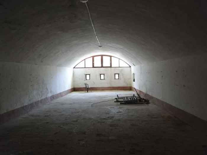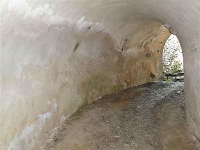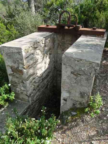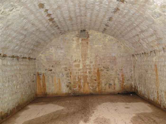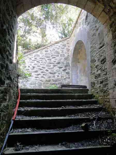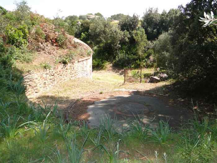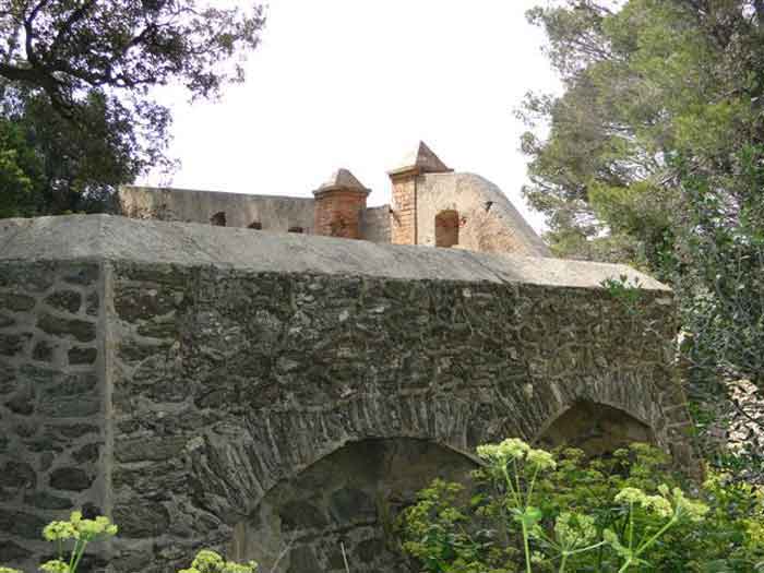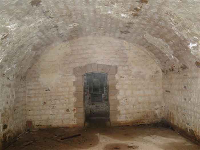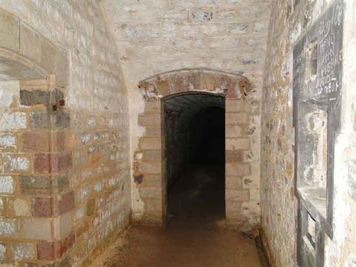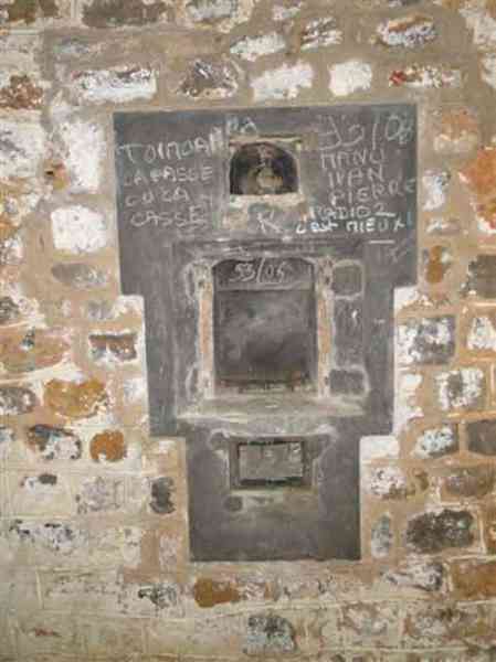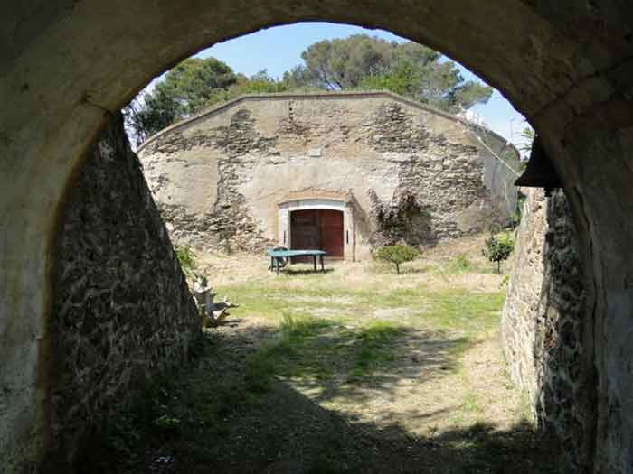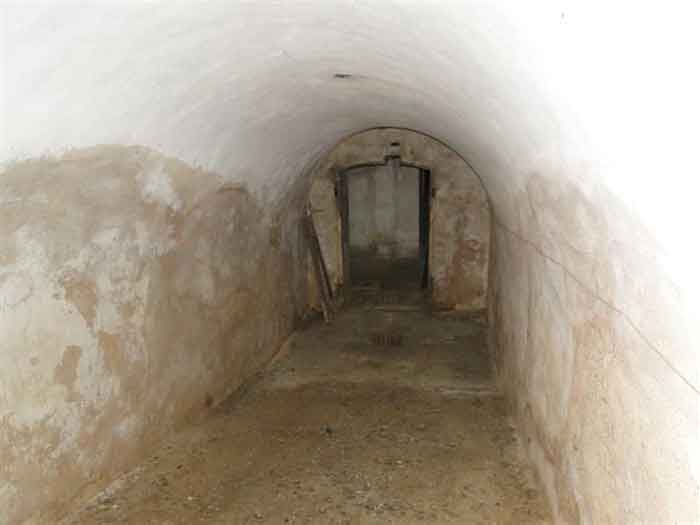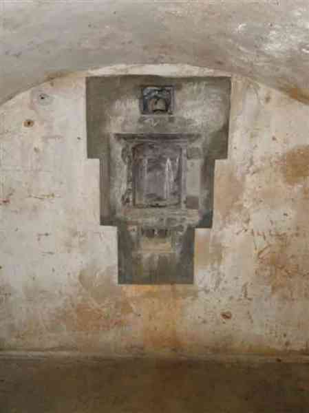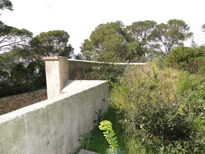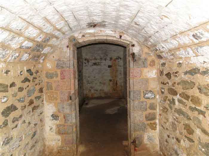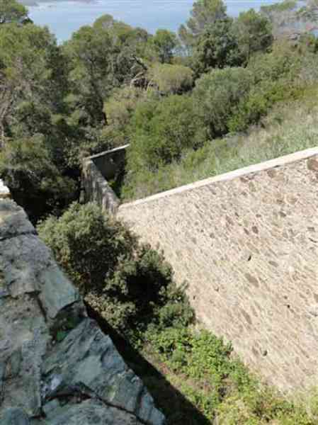 Fortress of Toulon, Hyères islands, north-northeast of the island of Porquerolles, 1882-1884. 114 m/alt. When the progress of artillery had made the island's defenses obsolete, both in terms of their efficiency and their number, it was decided to concentrate the protection of the island and its approaches in a single site. A notice from the Coastal Defense Commission, dated June 23, 1881 and approved on August 24 following, indicates a desire to establish "on the buttress of that name", a work armed with 9 19 cm guns. It is therefore probably not appropriate to claim that it was built by prisoners as... repentance. It seems that the intention to build a fort on this height was contemporary with the commission chaired by Séré de Rivières, from 1874. A survey of the land was carried out in 1880, but it would take until 1882 to begin work and 1884 for their completion. The geography of the place made the establishment of a work sufficiently vast for the envisaged armament difficult. In the end, two works were chosen which were initially designated center battery and north battery. The first was to become the fort and the second is treated in a separate article; see: Repentance (auxiliary batteries of the fort). Unlike the fort of Éminence on Port-Cros, the terrain here was free of any prior construction. Even if its perimeter is quite tormented due to the limits imposed by the relief, the fort overall assumes a rectangular, almost square shape. It is surrounded by a dry ditch whose defense was ensured from the parapet wall of the semi-detached scarp as well as by a single, double caponier, placed to the left of the entrance, on a ridge of the terrain imposing an impressive plunge on the western branch of the gorge ditch. The counterscarp is, at the level of this caponier, in relieving arches. Three large quarters adjoin the entrance on either side. The latter each have three rifle embrasures aimed at the glacis of the gorge and surmounted by a lighting window. In the circulation corridor, we find as many light wells as there are quarters, but these wells open in the top of the barrel vault rather than in the thickness of the wall, and are flared in their lower part. The entrance to the fort, in a tunnel, no longer allows one to ascertain the type of drawbridge that equipped it. Singularly, in its intermediate section, this entrance tunnel assumes the shape of a horseshoe, a shape that we will find again in the access corridor to the gorge caponier. The latter is particular for more than one reason. Indeed, under penalty of having too large a dead angle, the slope of the terrain imposed advancing the rifle embrasures sweeping saliant I, which could only be done by providing a machicolation in the western flank. It is, to our knowledge, a unique case and what is equally unique is that during the first decade of the 21st century, the occupant of the place, Father Séraphin, an Orthodox anchorite monk, transformed the place into a chapel. One must see it to believe it and, by describing it here, I unfortunately deprive the reader of the surprise that was mine when discovering this splendor, without having expected it in the least. In the purest Orthodox style, all in flourishes and polychromy, occasionally helped by some young religious come on retreat to the fort, Father Séraphin created a true splendor which, we do not nourish the slightest doubt in this regard, will one day be registered as major heritage of the island. From the wall frescoes to the finely carved furniture, everything was done by hand. Its discovery and both the presence and the explanations of the author-initiator of this metamorphosis will remain for me one of the greatest moments of the adventure that the IFF represents. Opposite the barracks, at a lower level, are found, side by side, two bread ovens whose capacity we estimate at about 300 even 350 rations each. Alas, the metallic parts have disappeared but they were of quite simple conception. The garrison of the fort was however only 194 men. Perhaps one should see in this overcapacity the trace of the initial will to create here an authentic reduit endowed with a garrison of 900 men? On the opposite wall, remain the traces of a water pump. The tunnel of the entrance emerges practically facing an enormous hollow traverse sheltering the head of the hoist of the rock magazine that would be dug in 1893. Inside the latter, one can notice two low lateral abutments near the entrance, but these without opening to the exterior, be it a simple barbican. One cannot therefore assimilate it to the Model 1879. On the ground, the locations of the rails of a double track of 40 cm for the supply of the firing platforms with ammunition are always visible. This traverse is situated at the center of the head front, oriented to the north-northwest. It separates two pairs of firing platforms for as many G guns 24 cm Model 1876 on P.C. mount. On one of them, a carillon of five bells with a keyboard at the very least artisanal and original was mounted. Behind the leftmost firing platform, we find three entrances to underground passages. One returns towards the gorge and, descending, gives access to the initial powder magazine, with a capacity of 76 tons and adjoining the left of the barracks, one level lower however. Another gives access to the parapet wall of the west front, and the third to the rock magazine. The latter, clean but scrapped with the exception of some very rusted elements of the hoist, comprises the usual loading workshop and a storage room for powders. We also note two large niches devoid of traces of hinges, which would lead us to think that wooden and zinc cabinets were pushed there for the storage of artifices. Nevertheless, the fact of finding one of the two on the intermediate landing of the access staircase does not plead for this option. We will note the usual (for coastal batteries) gutter collecting condensation water and cut in the rock, as well as a sort of