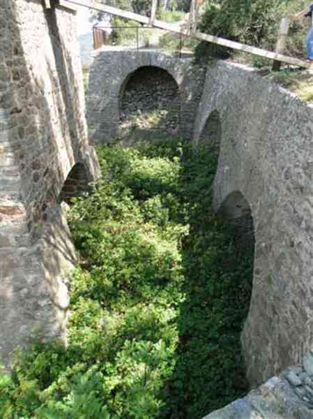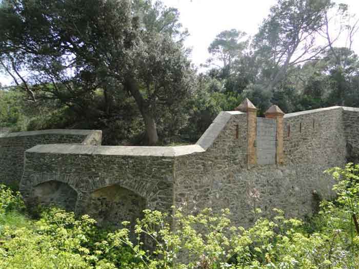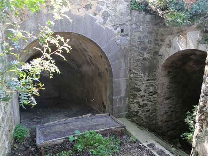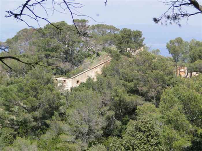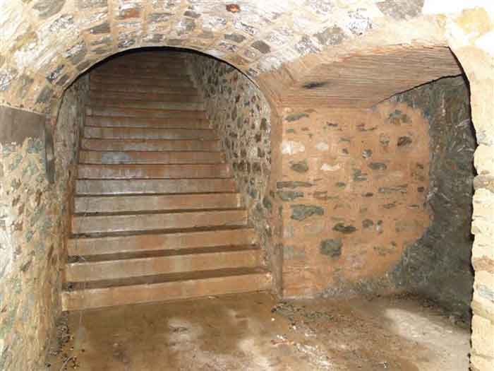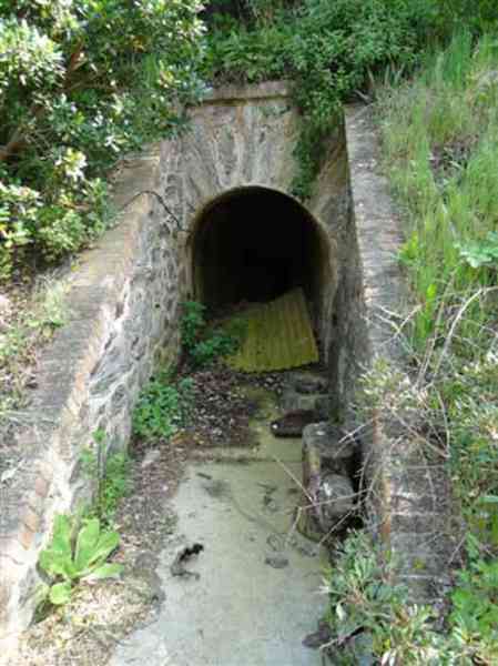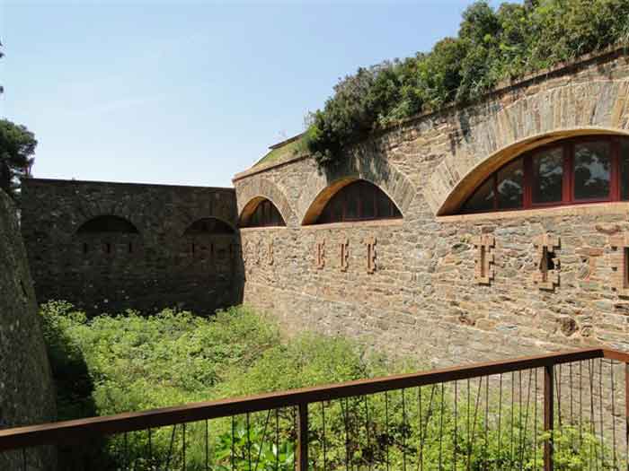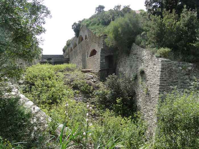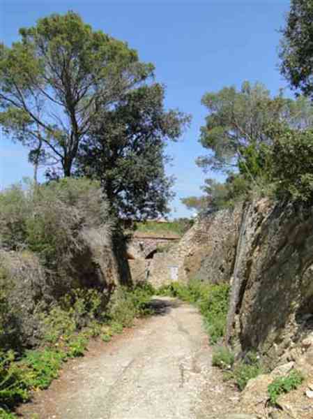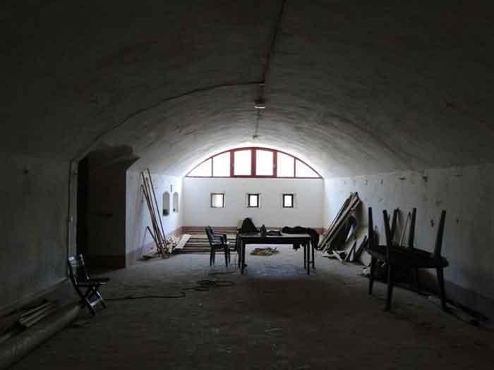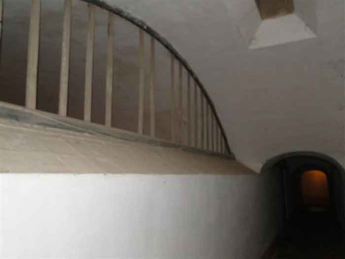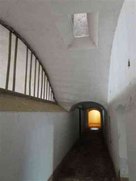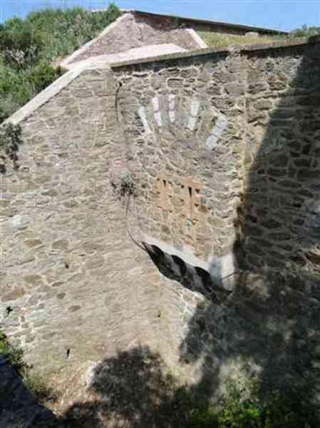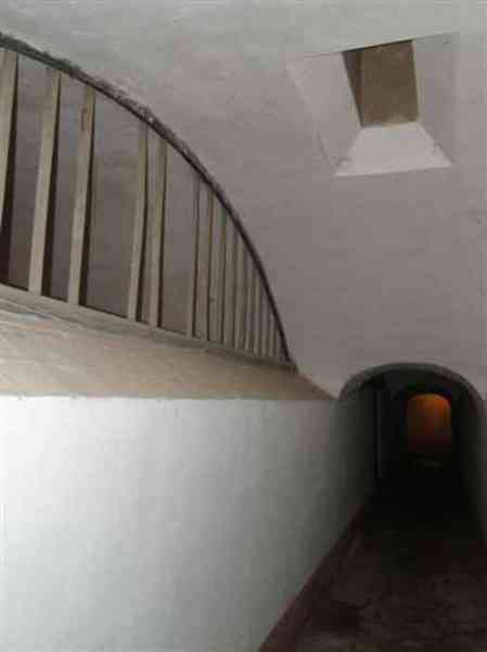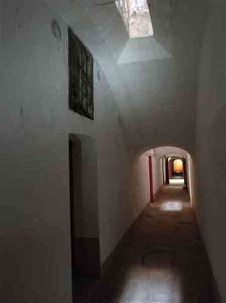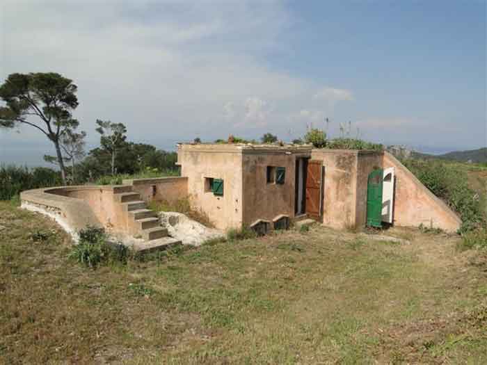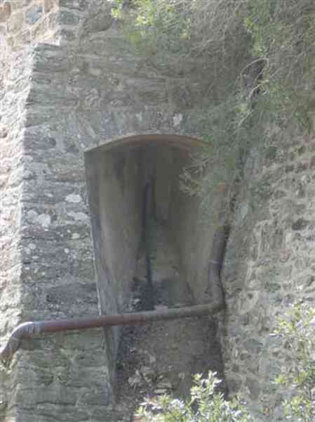 Fortress of Toulon, Hyères islands, north-northeast of the island of Porquerolles, 1882-1884. 114 m/alt. When the progress of artillery had made the island's defenses obsolete, both in terms of their efficiency and their number, it was decided to concentrate the protection of the island and its approaches in a single site. A notice from the Coastal Defense Commission, dated June 23, 1881 and approved on August 24 following, indicates a desire to establish "on the buttress of that name", a work armed with 9 19 cm guns. It is therefore probably not appropriate to claim that it was built by prisoners as... repentance. It seems that the intention to build a fort on this height was contemporary with the commission chaired by Séré de Rivières, from 1874. A survey of the land was carried out in 1880, but it would take until 1882 to begin work and 1884 for their completion. The geography of the place made the establishment of a work sufficiently vast for the envisaged armament difficult. In the end, two works were chosen which were initially designated center battery and north battery. The first was to become the fort and the second is treated in a separate article; see: Repentance (auxiliary batteries of the fort). Unlike the fort of Éminence on Port-Cros, the terrain here was free of any prior construction. Even if its perimeter is quite tormented due to the limits imposed by the relief, the fort overall assumes a rectangular, almost square shape. It is surrounded by a dry ditch whose defense was ensured from the parapet wall of the semi-detached scarp as well as by a single, double caponier, placed to the left of the entrance, on a ridge of the terrain imposing an impressive plunge on the western branch of the gorge ditch. The counterscarp is, at the level of this caponier, in relieving arches. Three large quarters adjoin the entrance on either side. The latter each have three rifle embrasures aimed at the glacis of the gorge and surmounted by a lighting window. In the circulation corridor, we find as many light wells as there are quarters, but these wells open in the top of the barrel vault rather than in the thickness of the wall, and are flared in their lower part. The entrance to the fort, in a tunnel, no longer allows one to ascertain the type of drawbridge that equipped it. Singularly, in its intermediate section, this entrance tunnel assumes the shape of a horseshoe, a shape that we will find again in the access corridor to the gorge caponier. The latter is particular for more than one reason. Indeed, under penalty of having too large a dead angle, the slope of the terrain imposed advancing the rifle embrasures sweeping saliant I, which could only be done by providing a machicolation in the western flank. It is, to our knowledge, a unique case and what is equally unique is that during the first decade of the 21st century, the occupant of the place, Father Séraphin, an Orthodox anchorite monk, transformed the place into a chapel. One must see it to believe it and, by describing it here, I unfortunately deprive the reader of the surprise that was mine when discovering this splendor, without having expected it in the least. In the purest Orthodox style, all in flourishes and polychromy, occasionally helped by some young religious come on retreat to the fort, Father Séraphin created a true splendor which, we do not nourish the slightest doubt in this regard, will one day be registered as major heritage of the island. From the wall frescoes to the finely carved furniture, everything was done by hand. Its discovery and both the presence and the explanations of the author-initiator of this metamorphosis will remain for me one of the greatest moments of the adventure that the IFF represents. Opposite the barracks, at a lower level, are found, side by side, two bread ovens whose capacity we estimate at about 300 even 350 rations each. Alas, the metallic parts have disappeared but they were of quite simple conception. The garrison of the fort was however only 194 men. Perhaps one should see in this overcapacity the trace of the initial will to create here an authentic reduit endowed with a garrison of 900 men? On the opposite wall, remain the traces of a water pump. The tunnel of the entrance emerges practically facing an enormous hollow traverse sheltering the head of the hoist of the rock magazine that would be dug in 1893. Inside the latter, one can notice two low lateral abutments near the entrance, but these without opening to the exterior, be it a simple barbican. One cannot therefore assimilate it to the Model 1879. On the ground, the locations of the rails of a double track of 40 cm for the supply of the firing platforms with ammunition are always visible. This traverse is situated at the center of the head front, oriented to the north-northwest. It separates two pairs of firing platforms for as many G guns 24 cm Model 1876 on P.C. mount. On one of them, a carillon of five bells with a keyboard at the very least artisanal and original was mounted. Behind the leftmost firing platform, we find three entrances to underground passages. One returns towards the gorge and, descending, gives access to the initial powder magazine, with a capacity of 76 tons and adjoining the left of the barracks, one level lower however. Another gives access to the parapet wall of the west front, and the third to the rock magazine. The latter, clean but scrapped with the exception of some very rusted elements of the hoist, comprises the usual loading workshop and a storage room for powders. We also note two large niches devoid of traces of hinges, which would lead us to think that wooden and zinc cabinets were pushed there for the storage of artifices. Nevertheless, the fact of finding one of the two on the intermediate landing of the access staircase does not plead for this option. We will note the usual (for coastal batteries) gutter collecting condensation water and cut in the rock, as well as a sort of