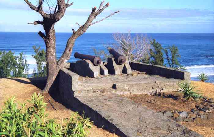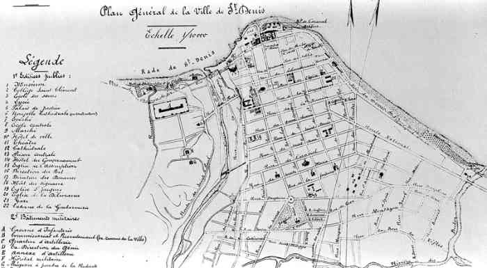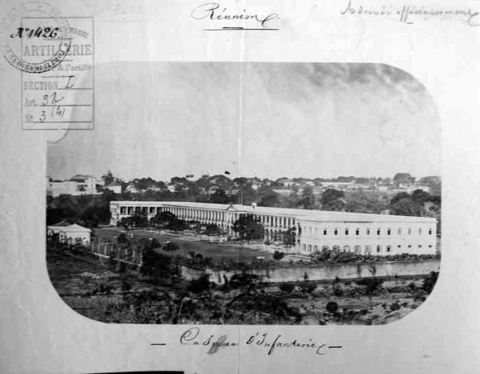 Die Insel Réunion, ursprünglich Île Bourbon genannt, ist seit 1638 französisch. Es hat nicht an der Installation von Verteidigungsanlagen gefehlt, und das schon seit sehr langer Zeit. In Saint-Leu zeugen noch heute die beiden Kanonen der Batterie Sans-Culotte, die im Jahr 3 (1794) in Ruelle gegossen wurden, davon. Genau wie diejenigen der Redoute Quatre canons, oberhalb von Saint-Denis in den ersten Kehren der RD 41 ausgestellt. 1859 erarbeitet die Küstenverteidigungskommission ein Programm zur Errichtung und Modernisierung der Batterien. 1866 plant man die Installation von 60 Kanonen und 17 Mörsern, verteilt auf 14 Batterien, zu einem geschätzten Kostenaufwand von 750 000 Francs. Dieses Programm wird 1868 und 1869 geändert und 1872 ist die Situation der Küstenbatterien, als provisorisch bezeichnet, für Saint-Denis wie folgt: