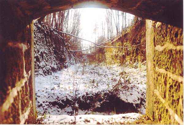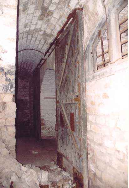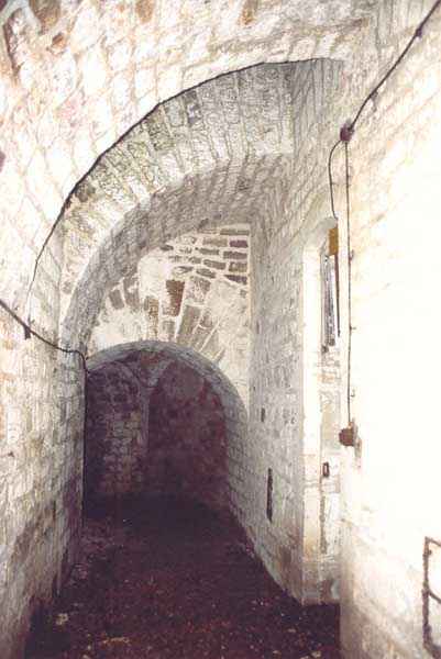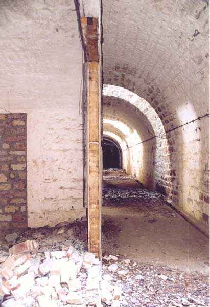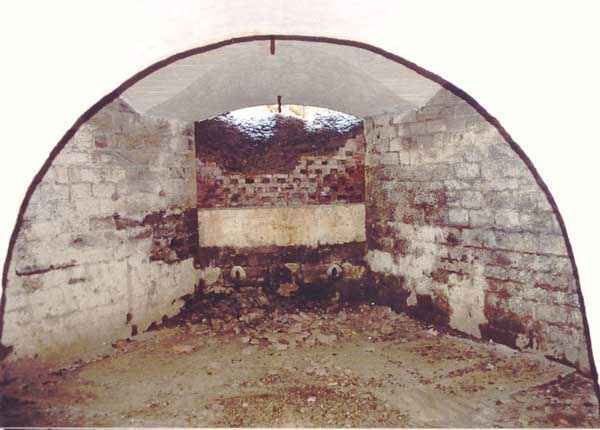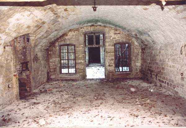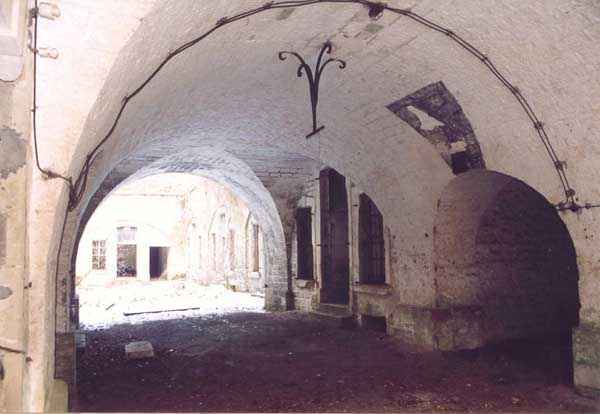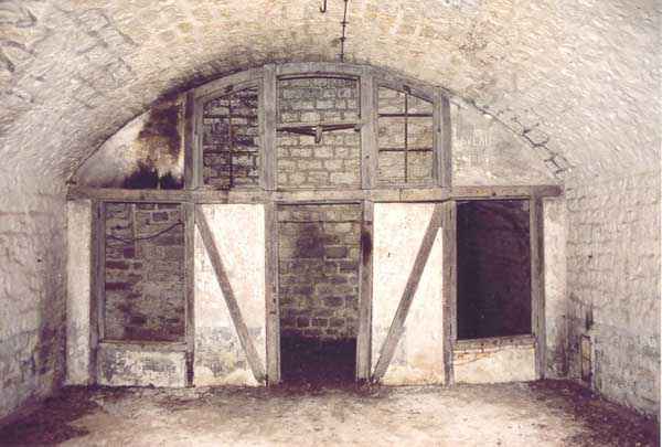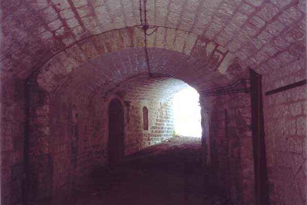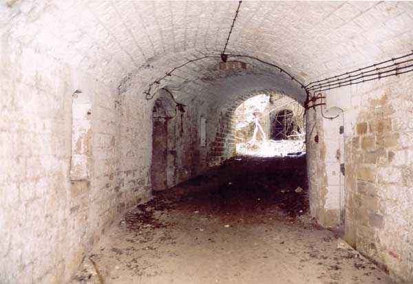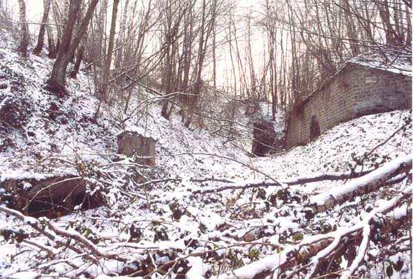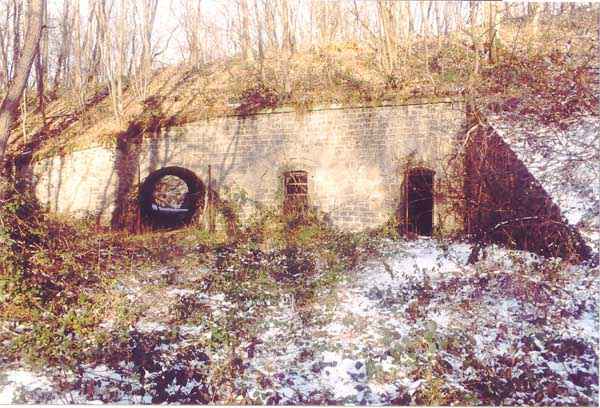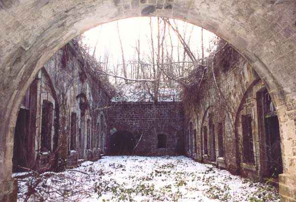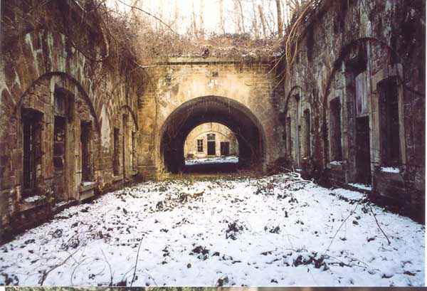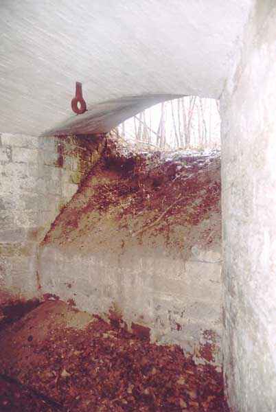 Entrenched camp of Épinal, east of the city, 1876-1878. 468 m/alt. Called fort Éblé. 369 men and 33 guns including five machine guns originally intended for flanking. The perimeter of this fort takes the form of an irregular pentagon while its fronts are of approximately equal length. The defense of the ditches is entrusted to a double caponier (salient III) and three ailerons (salients II, IV and V). The counterscarp is made of relief arches. The entrance opens in a recess, at the bottom of a small curtain wall whose sides are perpendicular and not oblique to the scarp line. Before reaching it, on the counterscarp, one must pass between two small pilasters still clad with their defensive grille. The entrance to the scarp was equipped with a laterally retractable rolling bridge. The entire mechanism has disappeared, but on the other hand, the two high sliding doors on wheels are in very good condition. The entrance tunnel, with its segmental arch vault, slopes upward and forms a bend before emerging into the open air, where the two ends of the rampart street meet. This includes seven rooted passages and each of the five fronts is equipped with shelter traverses. Fronts II-III and III-IV have three and the others two; the defense could therefore be carried out in all directions as in a stopping fort. Note that most of the shelter traverses have an abnormally long front wall. Facing the entrance tunnel outlet, the capital gallery enters under the central massif to arrive under a semicircular vaulted passageway separating the two light-filled courtyards of the barracks. These oppose four bays on a single level to as many magazines. The line of casemates in the right courtyard has a fifth barracks, but whose facade opens onto a covered passage. The magazines and barracks had a rare shutter system with removable rails. In some barracks, one can still distinguish maxims and names of Napoleonic battles painted directly on the walls. Many of the door frames remain, as does the bread oven (200 rations), which seems capable of being repaired. A spiral metal staircase, which should no longer be trusted too much, allowed access to the infantry position overlooking the barracks. At the ends of the barracks, beyond the circulation corridor, there are two indirect fire casemates. Their smoke evacuation shafts are as spectacular for their diameter as for their inclination. The left-hand casemate has a visor made of attached rails. To the far right of the magazines, the gunpowder shaft, ogival, is lined with a thin brick partition and is similar to that of the fort of La Mouche. Indeed, it also has the particularity of having a deflector in the light shaft, which was adjusted by a set of pulleys located in the storage room and controlled from the lamp room. The stone frame of the lamp battlements, on the storage room side, is more flared than usual both towards the top and the bottom. The powder capacity was 68,400 kg. The caponiers are generally in good condition. The walls in front of the 12-pounder gun platforms are fitted with machine gun foot mounts. The oxygen bottle positions are well defined (floor housing, support arch, etc.) and some searchlight crenels have their tiled covering intact. The latrines, at salient II, have undergone some modifications. Two of them have a valve system like those found at the battery of the Éperon. The fort also has a drinking water well without a coping and has retained many of its skylights. During our visit in February 2004, we noted the good condition of the masonry and the little damage, graffiti or other. This fort could be restored with a minimum of effort. The place already has two remarkably restored, we must admit that we cannot do everything; That being said, a municipality could very well use its premises for community purposes. The entrance is now alternately walled and pierced, but the fort is indeed abandoned. Unfortunately, the gorge serves as a dump for old tires. Sometimes preceded by the contracted article "du".