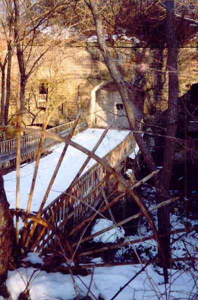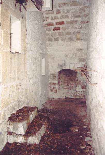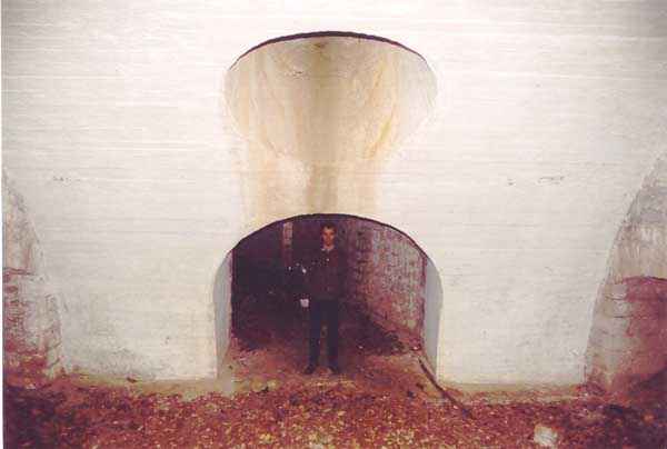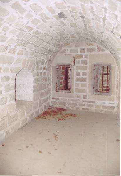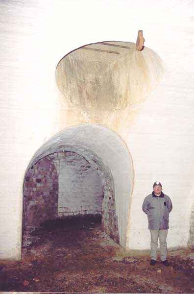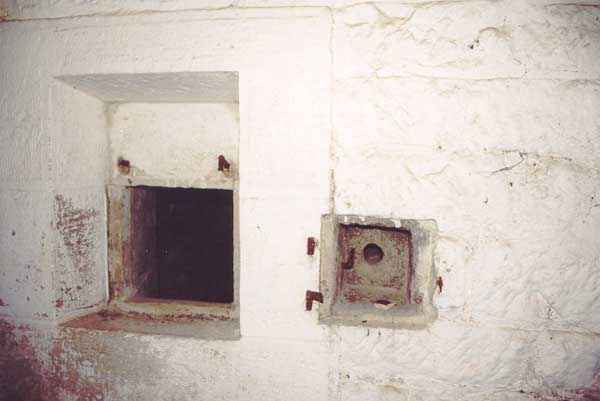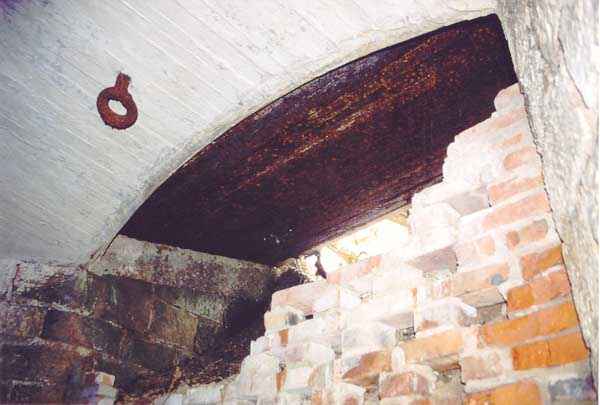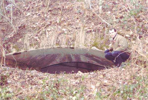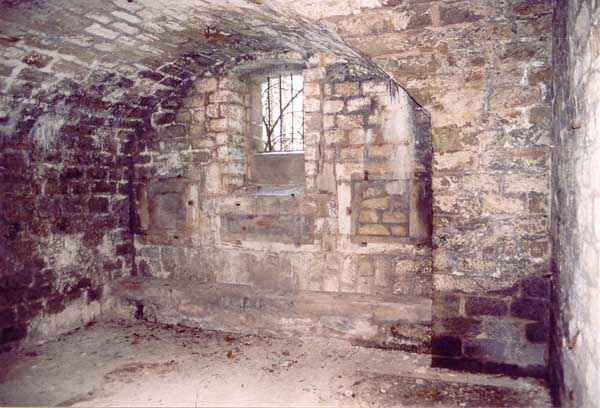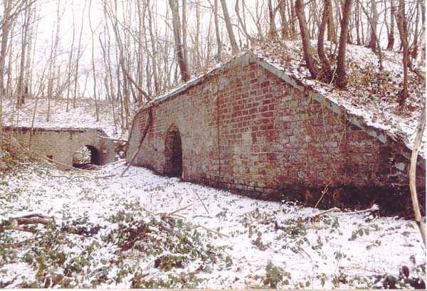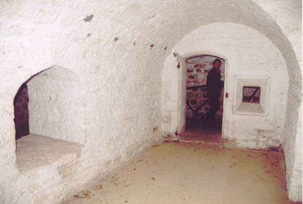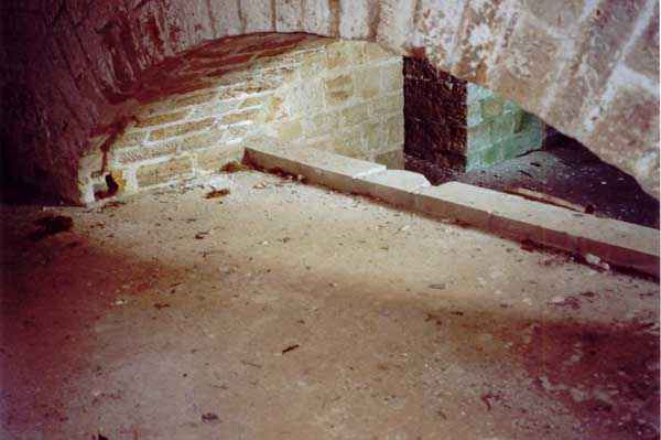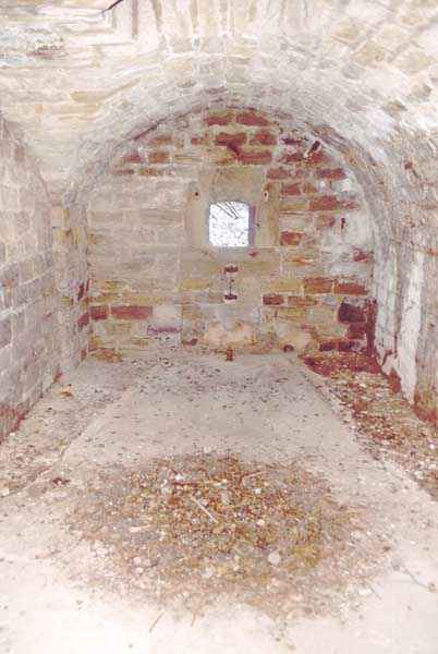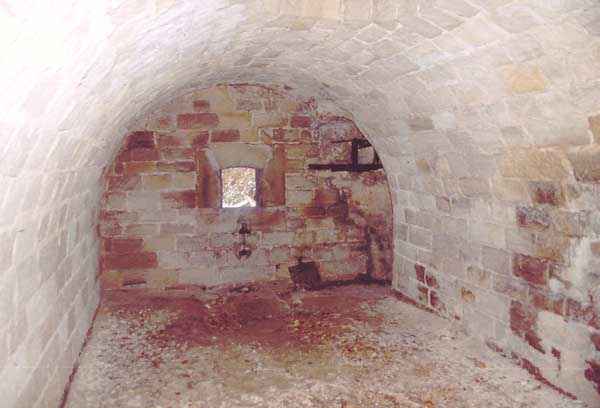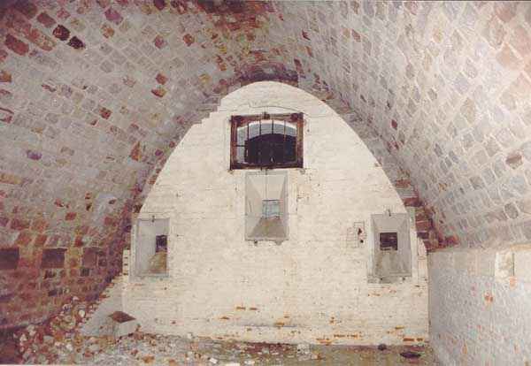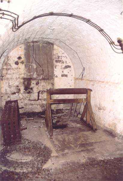Entrenched camp of Épinal, east of the city, 1876-1878. 468 m/alt. Called fort Éblé. 369 men and 33 guns including five machine guns originally intended for flanking. The perimeter of this fort takes the form of an irregular pentagon while its fronts are of approximately equal length. The defense of the ditches is entrusted to a double caponier (salient III) and three ailerons (salients II, IV and V). The counterscarp is made of relief arches. The entrance opens in a recess, at the bottom of a small curtain wall whose sides are perpendicular and not oblique to the scarp line. Before reaching it, on the counterscarp, one must pass between two small pilasters still clad with their defensive grille. The entrance to the scarp was equipped with a laterally retractable rolling bridge. The entire mechanism has disappeared, but on the other hand, the two high sliding doors on wheels are in very good condition. The entrance tunnel, with its segmental arch vault, slopes upward and forms a bend before emerging into the open air, where the two ends of the rampart street meet. This includes seven rooted passages and each of the five fronts is equipped with shelter traverses. Fronts II-III and III-IV have three and the others two; the defense could therefore be carried out in all directions as in a stopping fort. Note that most of the shelter traverses have an abnormally long front wall. Facing the entrance tunnel outlet, the capital gallery enters under the central massif to arrive under a semicircular vaulted passageway separating the two light-filled courtyards of the barracks. These oppose four bays on a single level to as many magazines. The line of casemates in the right courtyard has a fifth barracks, but whose facade opens onto a covered passage. The magazines and barracks had a rare shutter system with removable rails. In some barracks, one can still distinguish maxims and names of Napoleonic battles painted directly on the walls. Many of the door frames remain, as does the bread oven (200 rations), which seems capable of being repaired. A spiral metal staircase, which should no longer be trusted too much, allowed access to the infantry position overlooking the barracks. At the ends of the barracks, beyond the circulation corridor, there are two indirect fire casemates. Their smoke evacuation shafts are as spectacular for their diameter as for their inclination. The left-hand casemate has a visor made of attached rails. To the far right of the magazines, the gunpowder shaft, ogival, is lined with a thin brick partition and is similar to that of the fort of La Mouche. Indeed, it also has the particularity of having a deflector in the light shaft, which was adjusted by a set of pulleys located in the storage room and controlled from the lamp room. The stone frame of the lamp battlements, on the storage room side, is more flared than usual both towards the top and the bottom. The powder capacity was 68,400 kg. The caponiers are generally in good condition. The walls in front of the 12-pounder gun platforms are fitted with machine gun foot mounts. The oxygen bottle positions are well defined (floor housing, support arch, etc.) and some searchlight crenels have their tiled covering intact. The latrines, at salient II, have undergone some modifications. Two of them have a valve system like those found at the battery of the Éperon. The fort also has a drinking water well without a coping and has retained many of its skylights. During our visit in February 2004, we noted the good condition of the masonry and the little damage, graffiti or other. This fort could be restored with a minimum of effort. The place already has two remarkably restored, we must admit that we cannot do everything; That being said, a municipality could very well use its premises for community purposes. The entrance is now alternately walled and pierced, but the fort is indeed abandoned. Unfortunately, the gorge serves as a dump for old tires. Sometimes preceded by the contracted article "du".