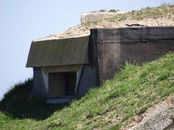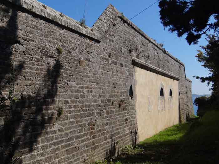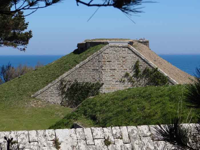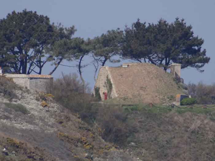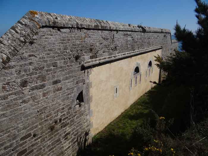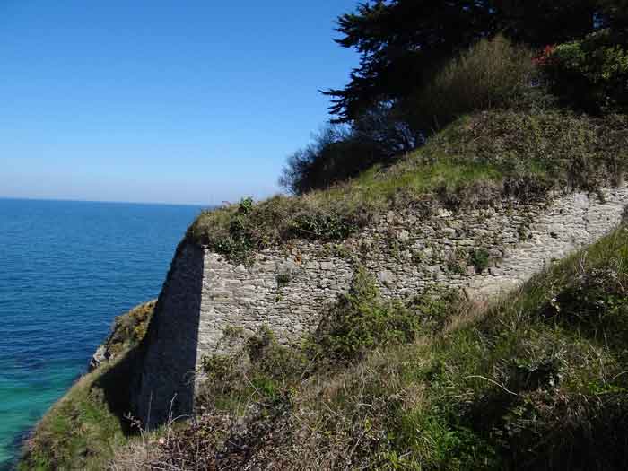 Fortress of Lorient, Belle-Île, southeast of Palais. Barely 500 meters southeast of the urban enclosure of Palais, a rocky spur was chosen as early as 1692 to establish a battery there. This one will undergo several modifications until becoming, in 1778, a battery protected on its entire perimeter either by a ditch (gorge side) or by a rock-cut scarp (head front). It is reported, in 1788, 1803 and 1810, armed with 4 cannons including two of 36 and two of 24 as well as a mortar of 12 inches. In 1793, a reverberatory furnace is built there while it is recommended, in 1814, to surround it with wolf pits. In 1847, a new reorganization is admitted, but it will only be in 1861 that a guardhouse model 1846 no. 3 for 20 men with a battery of 4 pieces will be built. Following the progress of rifled artillery, it will be modernized again from 1877 to 1881, in accordance with a decision of the coast defense commission of July 11, 1874. Its guardhouse will be decapitated, covered with a thick mattress of earth, and surrounded by a vaulted gallery in half barrel. Only its land-side face will retain openings in a ditch carefully carved into the rock. In the extension of this facade, an enclosure wall with entrance shifted to the left, followed by a falling branch, will make the rocky point an authentic barred spur. The entrance of the battery, provided with a drawbridge below, is a carriage gate surmounted by the date 1882 today (04/2012) very faded. The gorge scarp is defended by a non-crenellated small bastion located to the left of the entrance. In the capital of the head front, an imposing hollow traverse will be raised. This traverse has the particularity of being an isosceles triangle with a truncated point; the horizontal summit part of its facade being less than the width of the shelter. This traverse was an integral part of the rampart. The armament then planned was 4 cannons of 19 cm. On May 27, 1889, it is still classified in second importance due to its strategic position. It crossed its fires with the fort of Taillefer, thus prohibiting anchoring in front of Le Palais, but also with the pieces of the point of Gros Rocher, 2,250 m to the southeast, thus covering the approaches to the beach of Bordardoué. It is reputed to have still been operational in 1914, which we doubt. Indeed, if that had been the case, it would have undergone some concreting and, at least, the excavation of shell-proof magazines, under rock. But that was not the case. On the other hand, according to the local Historical Society, field cannons of 95 mm would have been stored there. It must be notably those intended for the annex battery of Gros Rocher, but it cannot be excluded that it was planned to arm the point of Ramonette with them until… 1914. What happened to the tubes of 19 cm? Were they effectively installed? In the current state of our research, nothing allows to affirm it. During the Second World War, the Germans will enlarge a small house built within the fort enclosure and build two casemates one of which still exists, incorporated into the summit part of the traverse. In May 1945, the fort still possessed two cannons of 75 mm and a quadruple anti-aircraft mounting of 20 mm. Sold by the Domains in 1954, the fort has since been a private property, passed through several hands. One of the owners completely leveled the firing parapet which allowed to discover the back of the traverse and to arrange two windows with sea view there. Despite many attempts, we could not get in touch with the owners so much so that during our Belle-Île journey, in April 2012, we could not push further our investigations. Seen from the outside, apart from the disappearance of the parapet and the absence of any trace of the earlier batteries, the ensemble appears very well preserved. The flank of the guardhouse facing the ditch as well as the parapet surmounting it are in perfect condition. Like the other model 1846 constructions of the island, Ramonette is registered in the inventory of Historical Monuments since October 30, 2000. Sometimes spelled « Ramonet ». Private property.