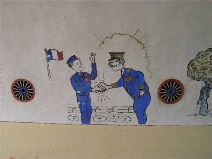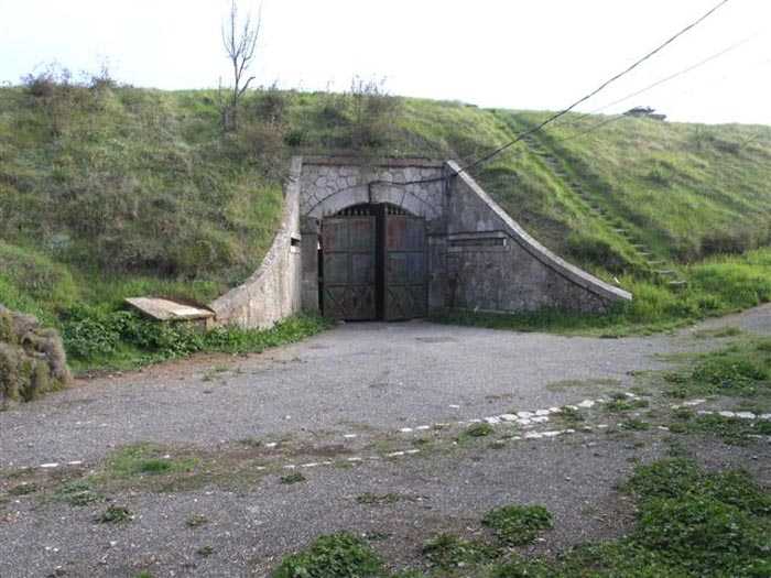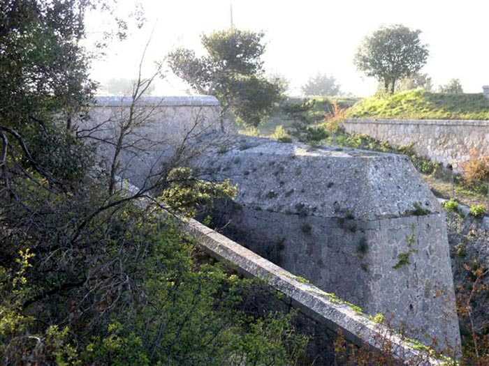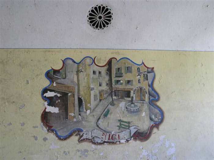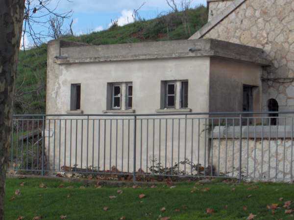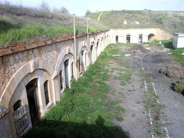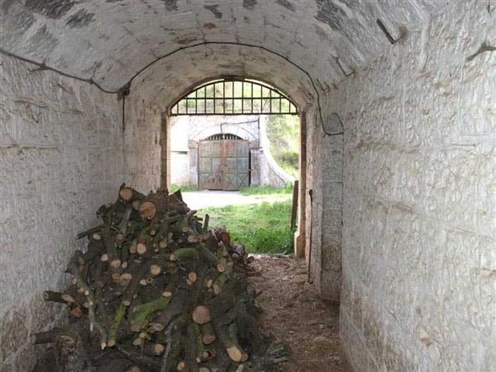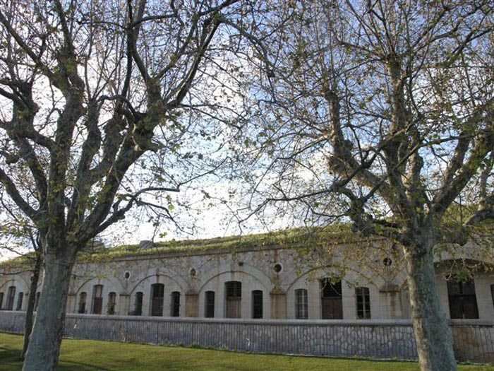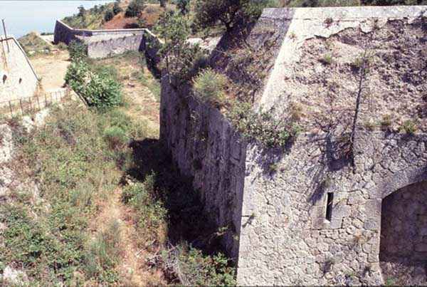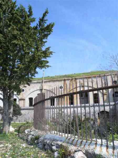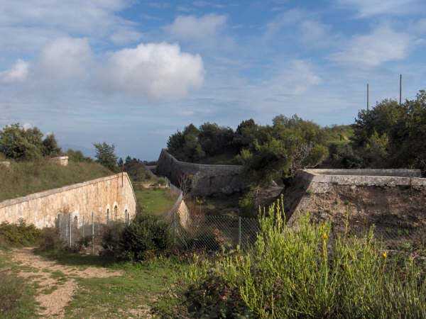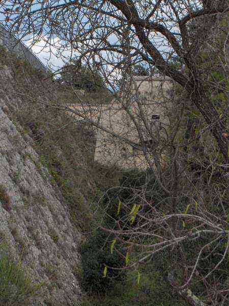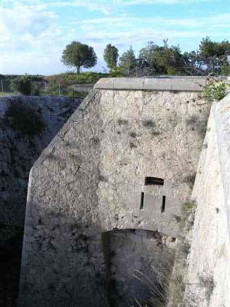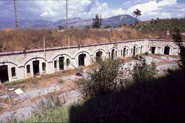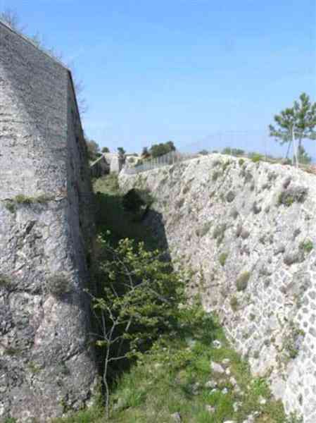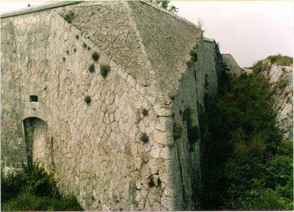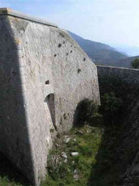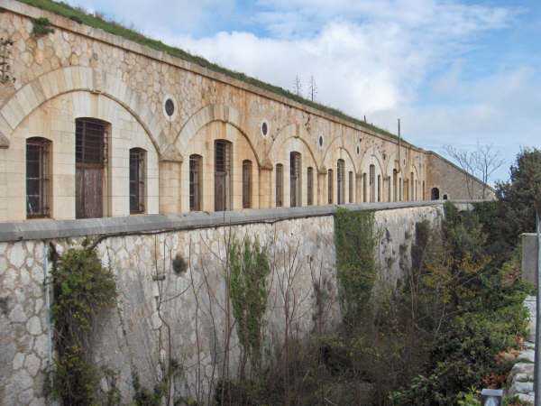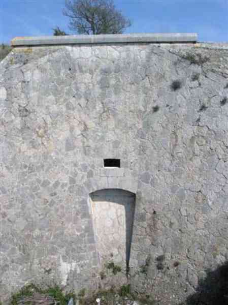 Fortress of Nice, east-northeast of the city, 1882-1885. 696 m/alt at the entrance threshold. Named fort Anselme. Fort de la Revère is entirely surrounded by a dry ditch; occupying a plateau (or terrain leveled by rock removal), its perimeter is less determined than that of the other forts of the place by the torments of slopes and other precipices. Overall, we are dealing with a trapezoid whose right third breaks by a few degrees facing northeast, while widening both on the head front and the gorge front sides. This break, compensated by a widening of the head front ditch, on the contrary determines a small front V-VI at the gorge. The latter, occupying as it should front VI-I, finds itself devoid of defense and outside the field of action of the caponiers of salients II and IV. The barracks, on a single level (eight bays on the right and seven on the left), faces the gorge while being preceded by a terrace. This arrangement is rarely encountered (Vaux in Verdun, Friches and Uxegney in Épinal, Montlandon in Langres, Lestal in Albertville, La Pompelle in Reims, …), but never over such a length which makes the gorge of Fort de la Revère one of the most exceptional. The parapet wall of this terrace thus crowns the escarp wall. Barely one meter high, it cannot claim to really aid the defender; in addition, the ditch preceding it, very shallow (± 350 cm), does not constitute an insurmountable obstacle especially since, unless modifications have been made, the tops of this barracks are not (any longer?) organized as a firing step. The openings of the barracks have been modified and if there was any armor device, it no appears today. The gorge ditch was deepened by digging a pit in front of the entrance, under the movable deck of the bascule drawbridge with assisted movement, a bridge of which a good part of the mechanism has come down to us. The right part of this barracks still houses an imposing kitchen stove with its hood. Underneath, a small electric motor assisted a fan. This stove ran on fuel oil, as evidenced by the injectors and the tank in the adjacent room. It can only be contemporary with the many humorous sketches decorating the walls of three of the barracks rooms. Three barracks rooms, three distinct styles, the same willingness to testify to the reality of the life of conscripts under the flag, not without a certain humor by the way. On the reverse of two of the entrance doors of these barracks rooms, one can read, on one, "section Guynemer" with a war cross drawn directly on the wood and, on the other, "section E. Marin la Meslée". Edmond Marin la Meslée was an ace of the French fighter arm in 1940 and his name remains attached to B.A. 112 in Reims. On this door, a pennant of the famous Stork squadron was sketched under an aircraft rarely represented, and for good reason, it never went into series production. It is an SE 5000 Baroudeur, a tactical support aircraft that had the particularity of taking off on a trolley and landing on skids. As the tests were carried out from 1953 to 1956, this sketch can reasonably be attributed to those years. In the left part of the barracks, it is three large paintings, two of which depict a neighborhood of Nice and the third one of another locality (P…?), that attract attention. Let us note, a thing rare except in Dijon, that the barracks rooms respect the directive according to which the height on the façade must be greater than that on the corridor side, for lighting reasons. It seems that the officers had their quarters in the last four bays of this left wing. Most of the original door and window frames are present. The entrance porch, provided with a plaque justifying the name Boulanger, opens onto the courtyard between two enveloping walls following the piers grooved for the placement of eventual armor that would have extended the protection of the passage. Facing this courtyard, a line of eight casemates framed by two narrower ones, all on a single level, turns its back to the head front. Smaller than the barracks rooms of the gorge, these casemates seemed devoted especially to the storage of everything that may be necessary for life in the fort. In one of them is part of the defensive grilles of the fort. On the right and parallel to front III-IV, we find the artillery rooms including the powder magazine. The latter, with a capacity of about sixty tons, shows a barrel vault and flanks furnished with corbels. It has, besides its floor, miraculously preserved the closing shutters of all its openings, including lamp embrasures. Is it necessary to specify the extreme rarity of the thing? The thick panes of the three aligned embrasures did not have this luck. The other artillery rooms form an ensemble rather disconcerting in its configuration by the multiplicity of its partitions firstly, by a storage room covering several cartridge depots secondly. It is exactly as if, in the extension of the powder magazine, a second one had been built with partitioned ground floor and a floor, at the level of the vault springing, covering the whole in one piece. A tunnel passage separates perpendicularly these two magazines, allowing the passage from the large courtyard to a second, more modest one, onto which three asymmetric hollow traverses open. The fort counts only five hollow traverses, all different. Here we are dealing with nos. 3 to 5, of a model with front abutments (Mle 1879). Their dimensions vary greatly. Nos. 3 and 4 are abnormally wide, no. 5 corresponds more to the standards in this matter. No. 3 has only one arm in which one can still read the inscription "Pièce n°5 de 155". At the end of this same traverse, the access gallery to the gun emplacement of salient III opens laterally. No. 4 possesses two arms, just like no. 5 with which it also shares the fact of having the entrance slightly askew relative to the shelter body. These three hollow traverses are framed by simple platforms including one angled (behind salient III) 