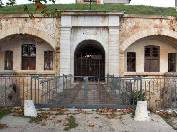 Festung von Nice, Ost-Nordost der Stadt, 1882-1885. 696 M/ü M an der Eingangsschwelle. Genannt Fort Anselme. Das Fort de la Revère ist vollständig von einem trockenen Graben umgeben; da es ein Plateau einnimmt (oder ein durch Felsabtrag eingeebnetes Gelände), wird sein Umfang weniger als der der anderen Werke des Platzes durch die Unregelmäßigkeiten der Hänge und anderen Abgründe bestimmt. Insgesamt haben wir es mit einem Trapez zu tun, dessen rechtes Drittel sich um einige Grad nach Nordosten bricht, während es sich sowohl zur Kehl- als auch zur Hauptfrontseite hin verbreitert. Dieser Bruch, der durch eine Verbreiterung des Grabens der Hauptfront ausgeglichen wird, bestimmt hingegen eine kleine Front V-VI an der Kehle. Letztere, die wie üblich die Front VI-I einnimmt, bleibt ohne Verteidigung und außerhalb des Wirkungsbereichs der Kaponnieren der Bollwerke II und IV. Die Kaserne, auf einer einzigen Ebene (acht Joche rechts und sieben links), gibt zur Kehle hin aus, während sie von einer Terrasse vorgelagert ist. Diese Anordnung ist selten anzutreffen (Vaux in Verdun, Friches und Uxegney in Épinal, Montlandon in Langres, Lestal in Albertville, La Pompelle in Reims, …), aber niemals in einer solchen Länge, was die Kehle des Forts de la Revère zu einer der außergewöhnlichsten macht. Die Brustwehr dieser Terrasse krönt also die Eskarpenmauer. Kaum einen Meter hoch, kann sie nicht wirklich zur Hilfe des Verteidigers beitragen; darüber hinaus stellt der davor liegende, sehr flache Graben (± 350 cm) kein unüberwindliches Hindernis dar, zumal, falls es keine Änderungen gegeben hat, die Oberseiten dieser Kaserne nicht (mehr?) als Schießbank organisiert sind. Die Öffnungen der Kaserne wurden verändert und wenn es eine Panzerungsvorrichtung gab, ist sie heute nicht mehr sichtbar. Der Kehlgraben wurde durch das Ausheben einer Grube vor dem Eingang vertieft, unter der beweglichen Fahrbahn der Wippzugbrücke mit unterstützter Bewegung, eine Brücke, von der ein Großteil des Mechanismus uns erhalten geblieben ist. Der rechte Teil dieser Kaserne beherbergt immer noch einen imposanten Küchenherd mit seiner Haube. Darunter unterstützte ein kleiner Elektromotor einen Ventilator. Dieser Herd funktionierte mit Heizöl, wie die Einspritzdüsen und der Tank im Nachbarraum bezeugen. Er kann nur zeitgleich mit den vielen humorvollen Skizzen sein, die die Wände von drei der Mannschaftsräume schmücken. Drei Mannschaftsräume, drei verschiedene Stile, derselbe Wille, die Realität des Lebens der Wehrpflichtigen unter der Fahne zu bezeugen, nicht ohne einen gewissen Humor übrigens. Auf der Rückseite von zwei der Eingangstüren dieser Mannschaftsräume kann man auf der einen "section Guynemer" mit einem direkt in das Holz gezeichneten Kriegskreuz und auf der anderen "section E. Marin la Meslée" lesen. Edmond Marin la Meslée war 1940 ein Ass der französischen Jagdflieger und sein Name bleibt mit der B.A. 112 in Reims verbunden. Auf dieser Tür wurde unter einem selten dargestellten Flugzeug, aus gutem Grund, es ging nie in Serienproduktion, ein Wimpel der berühmten Störschwader skizziert. Es handelt sich um einen SE 5000 Baroudeur, ein taktisches Unterstützungsflugzeug, das die Besonderheit hatte, auf einem Wagen zu starten und auf Kufen zu landen. Da die Tests von 1953 bis 1956 durchgeführt wurden, kann diese Skizze vernünftigerweise diesen Jahren zugeschrieben werden. Im linken Teil der Kaserne sind es drei große Gemälde, von denen zwei ein Viertel von Nizza und das dritte eines eines anderen Ortes (P…?) darstellen, die die Aufmerksamkeit auf sich ziehen. Wir stellen fest, was außer in Dijon selten ist, dass die Mannschaftsräume der Richtlinie entsprechen, nach der die Höhe an der Fassade größer sein muss als die auf der Korridorseite, und zwar aus Gründen der Beleuchtung. Es scheint, dass die Offiziere ihre Quartiere in den letzten vier Jochen dieses linken Flügels hatten. Der größte Teil der originalen Tür- und Fensterrahmen ist vorhanden. Das Eingangsportal, versehen mit einer Plakette, die den Namen Boulanger rechtfertigt, mündet auf den Hof zwischen zwei Einfassungsmauern, die den mit Nuten für die Platzierung einer eventuellen Panzerung versehenen Pfosten folgen, die den Schutz des Durchgangs verlängert hätte. Zur diesem Hof hin öffnet sich eine Reihe von acht Kasematten, die von zwei schmaleren eingerahmt werden, alles auf einer Ebene, mit dem Rücken zur Hauptfront. Kleiner als die Mannschaftsräume der Kehle, schienen diese Kasematten vor allem der Lagerung all dessen gewidmet zu sein, was für das Leben im Fort notwendig sein kann. In einer von ihnen befindet sich ein Teil der defensiven Gitter des Forts. Rechts und parallel zur Front III-IV finden wir die Räume der Artillerie, einschließlich des Pulvermagazins. Letzteres, mit einer Kapazität von etwa sechzig Tonnen, zeigt ein Tonnengewölbe und mit Kragsteinen versehene Flanken. Es hat, neben seinem Boden, auf wundersame Weise die Verschlussläden all seiner Öffnungen, einschließlich der Lampenscharten, bewahrt. Muss man die extreme Seltenheit dieser Sache betonen? Die dicken Scheiben der drei ausgerichteten Scharten hatten nicht dieses Glück. Die anderen Räume der Artillerie bilden ein in seiner Konfiguration ziemlich verwirrendes Ensemble, zunächst durch die Vielzahl seiner Trennwände, dann durch einen Lagerraum, der mehrere Kartuschendepots überdeckt. Es ist genau so, als ob man in Verlängerung des Pulvermagazins ein zweites mit unterteiltem Erdgeschoss und einer Etage auf der Höhe des Gewölbeansatzes gebaut hätte, das das Ganze in einem Stück bedeckt. Ein Tunneldurchgang trennt diese beiden Magazine senkrecht und ermöglicht den Durchgang vom großen Hof zu einem zweiten, bescheideneren, auf den drei asymmetrische Hohltraversen öffnen. Das Fort zählt nur fünf Hohltraversen, alle unterschiedlich. Hier haben wir es mit den Nr. 3 bis 5 zu tun, von einem Modell mit Stirnseit