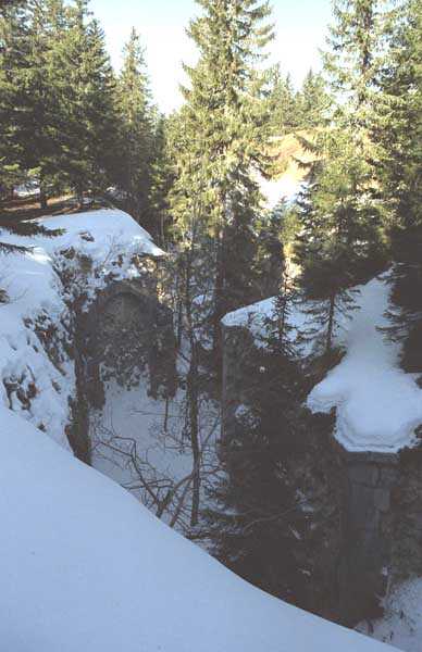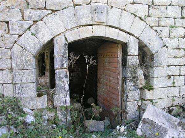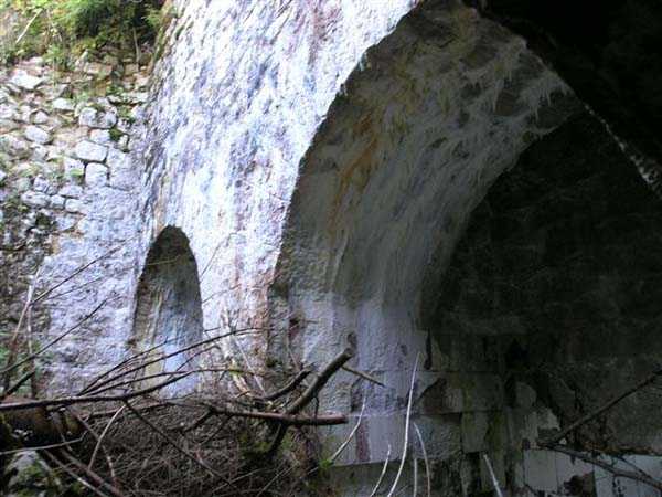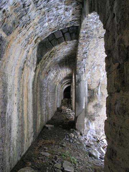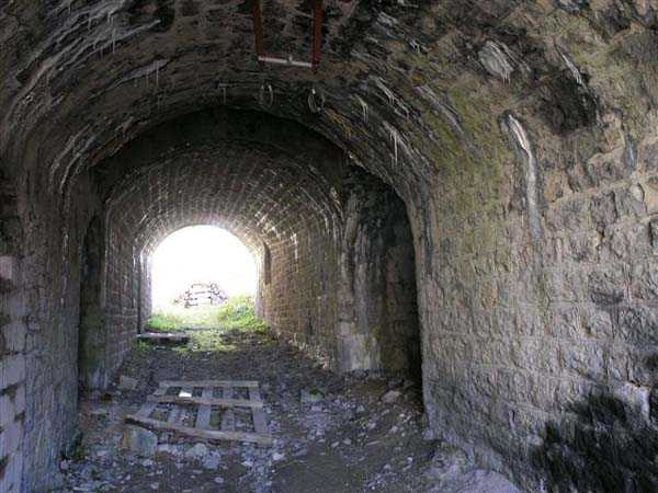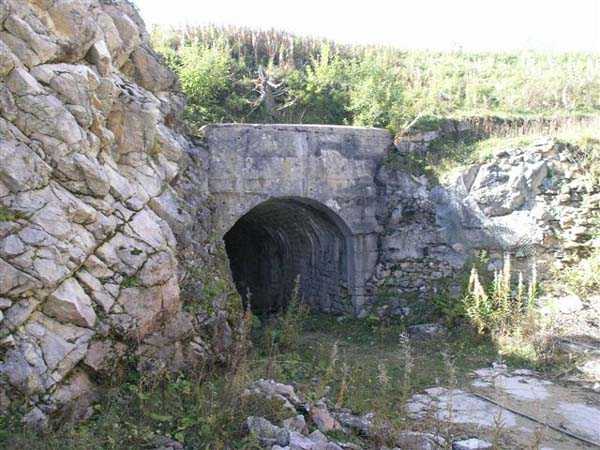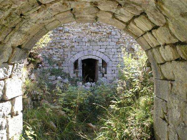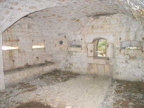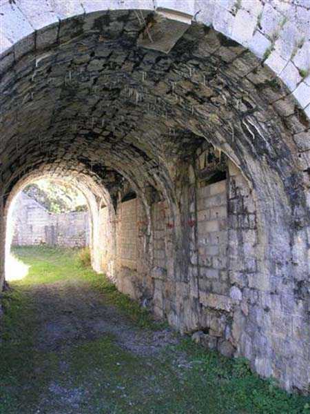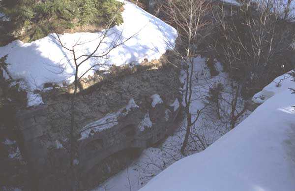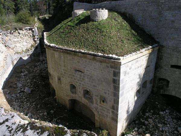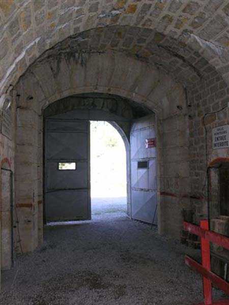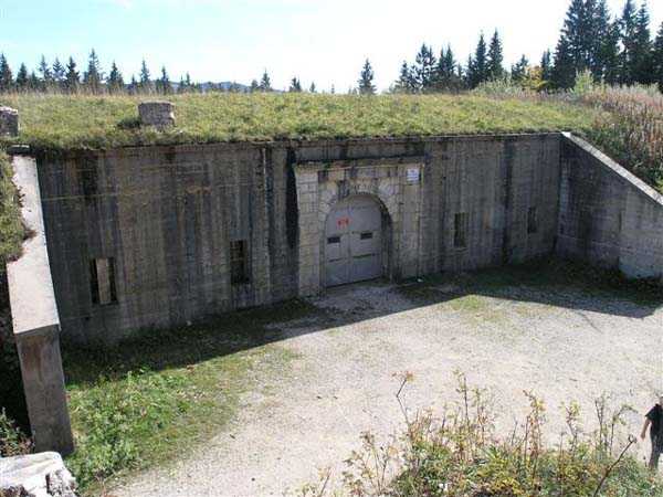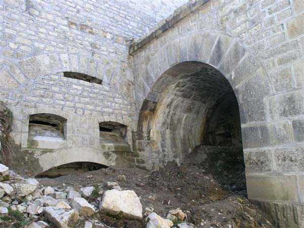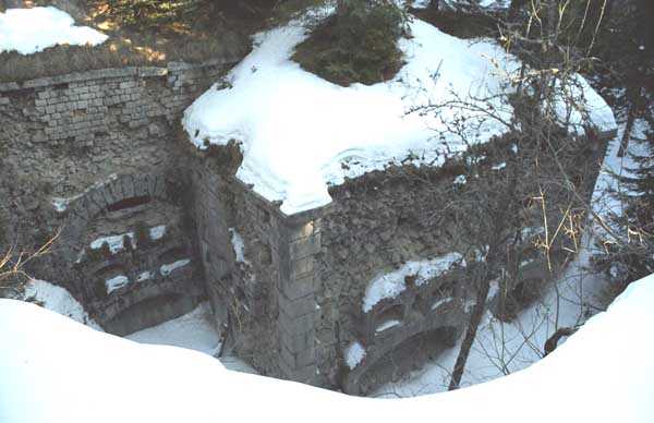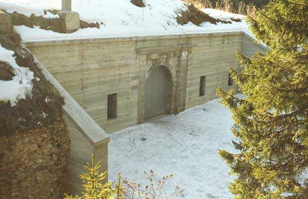 Jura Curtain, fortress of Les Rousses, 1880-1884. 1273 m/alt. Approximately 400 men and 16 guns. Named Fort Guyot. It is an irregular pentagon built 3 km north of Fort Les Rousses, which it monitored and protected. 2 double caponiers and 1 single caponier. The gorge ditch and its small curtain wall are filled in. 1 optical post with 1 single embrasure directed towards Fort Les Rousses. 90% of the rooms are or were lined internally with hollow bricks. 3 small rock shelters, including 1 under the counterscarp, were excavated, but only the one connected to the descent shaft to the caponier of salient I is accessible. Note also the particular access, via a path in front of the fire crest, to the caponier of salient III and the presence of an annex magazine for this caponier. This fort served long after the Second World War for tests in the handling of explosives. The caponiers, two of which are collapsed, had circular openings 20 cm in diameter to sweep the dead angles with grenades. The counterscarp at salient III includes large relieving arches. Some fine door and window fittings remain here and there, especially in the caponier shafts. Although in rather poor condition and with many rooms blocked up, the town hall of Les Rousses, current owner (10/2006), released funds that allowed the perfect restoration of the double caponier of salient I. Interest in this fort seems to be growing and we can only rejoice in this. Visit possible with authorisation from the town hall.