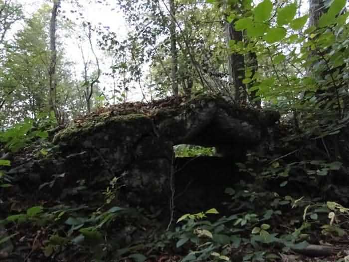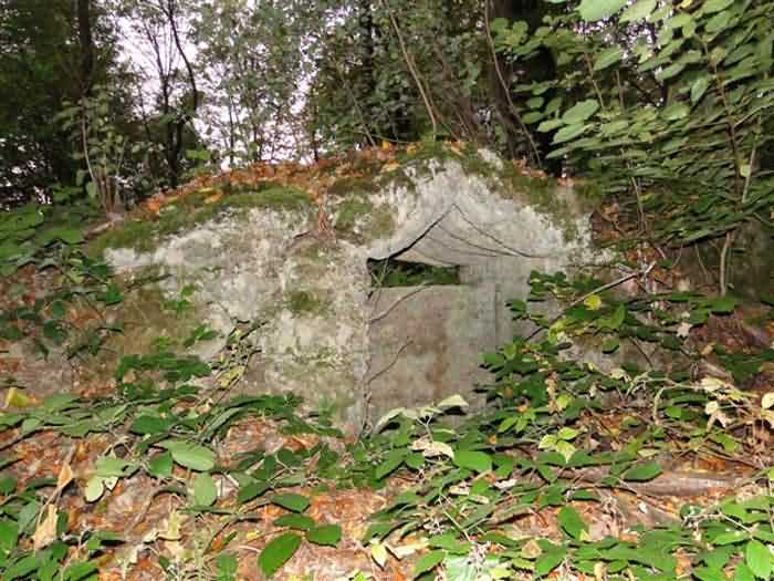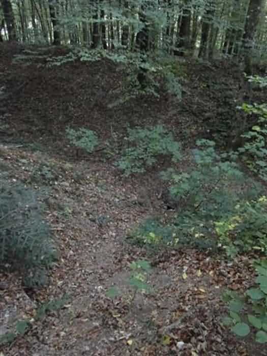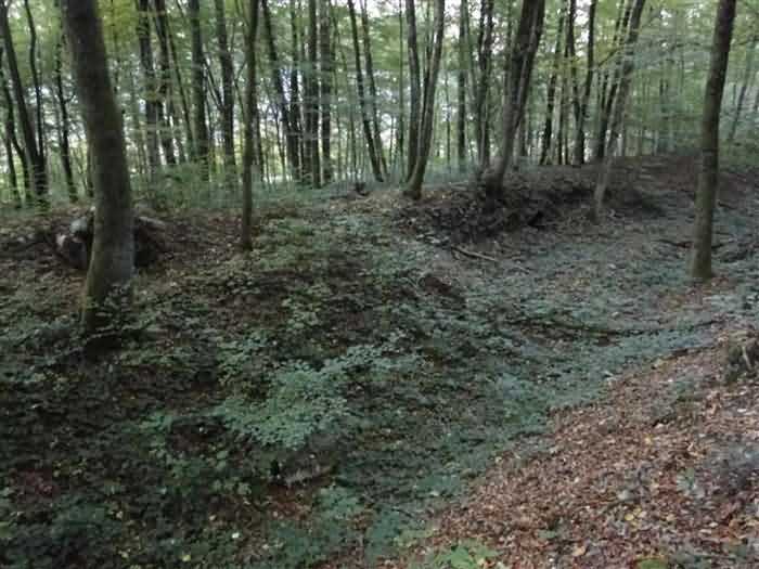 Belfort fortified camp, northwest of the town, 1890-1891. 470 m alt. Small terraced infantry fortification, 450 m southwest of the village of Salbert, at the foot of the mountain of the same name. Like its neighbors at Haut d'Évette and La Forêt, it includes masonry parapets, about ten meters long and including an ammunition niche in their center. However, these parapets are only two in number here, framed by two observation posts whose roofs are made of moistened cement bags. It is an almost elongated structure, about a hundred meters long. Roughly in its center, an intermittent stream required the construction of an underground pipe passing under the parapet. Sometimes referred to simply as the "Salbert work", it is quite degraded and freely accessible (10/2010).