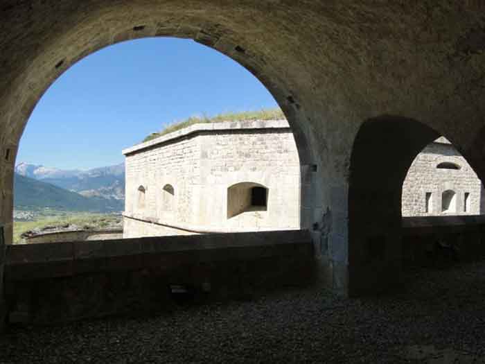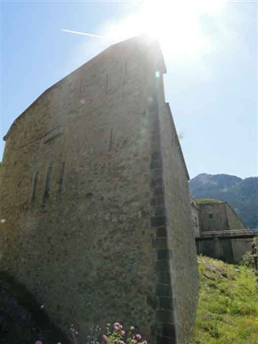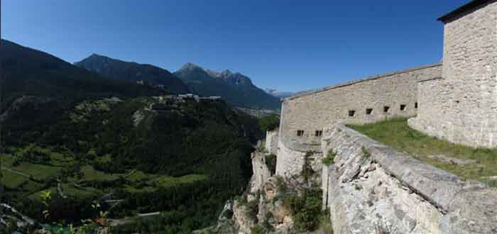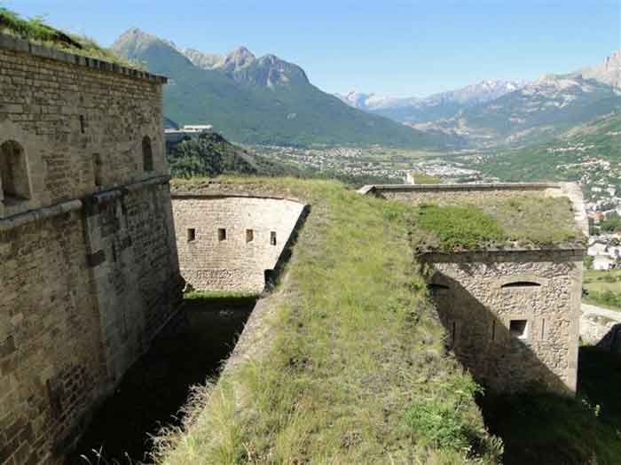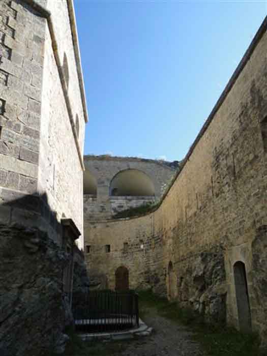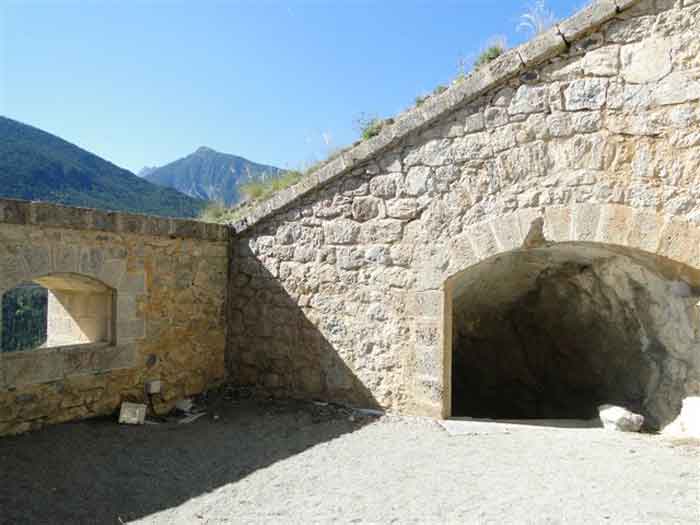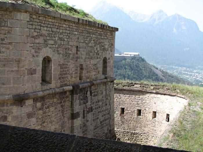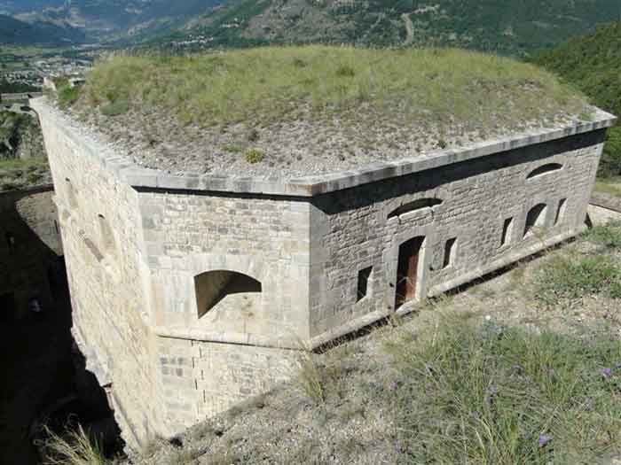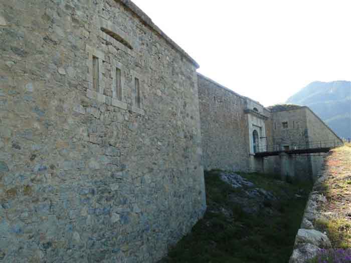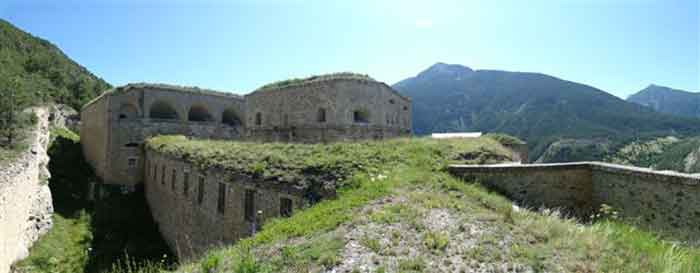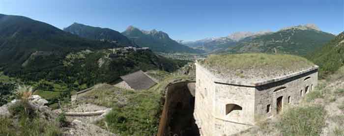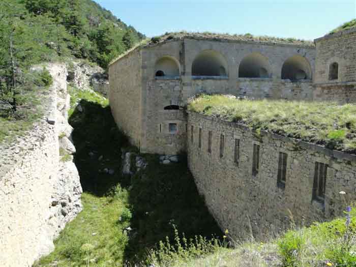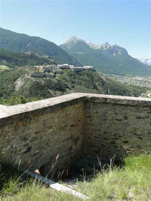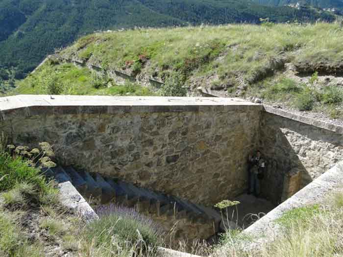 Fortress of Briançon, north-north-west of the city. 1,450 m altitude. A tower with cut corners was built on this site as early as 1709. In 1815, following an enlargement, this tower became the redoubt of the work, which would be further transformed from 1830 to 1854. Militarily occupied until after 1870. A powder magazine with an airlock and lateral galleries is nestled in the hollow of the bastion to the right of the entrance. It defended the RN 94 (national road), coming from Italy.