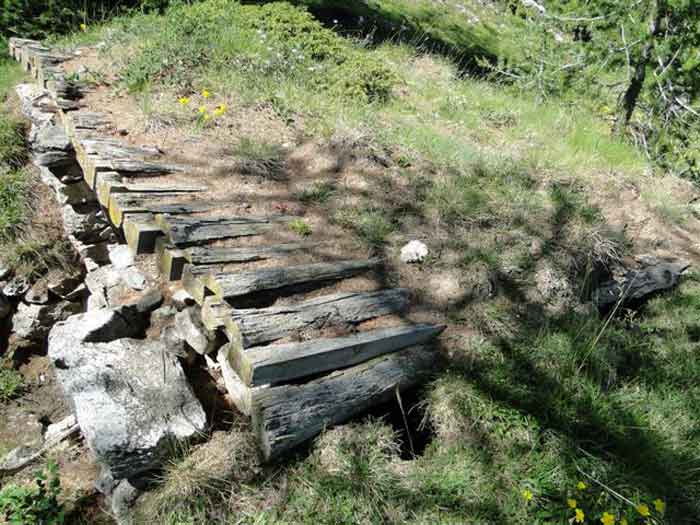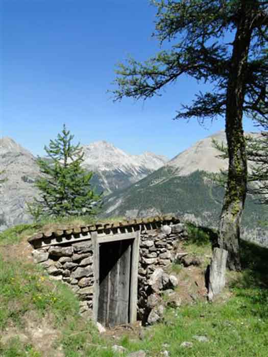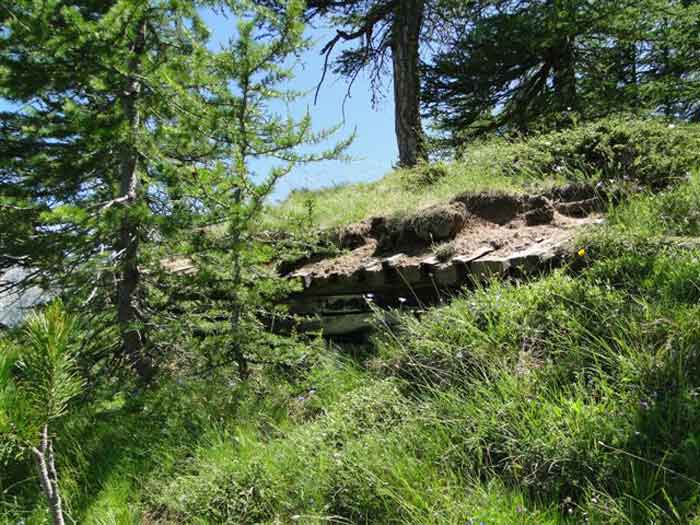 Fortress of Briançon, 10,000 m north of the city. We do not know in which year this work was established, but it is probable that it is contemporary with Olive fort (1891-93). 2,170 m altitude. Located on the upper edge of the rocky bar that flanks the right bank of the Clarée valley, on the border of the access road to Olive fort, 1,200 m south-south-east of the latter. Work for four pieces (120L/78?) firing on the exits of the Col des Acles and the eponymous valley; complementary mission to that of Olive fort, which earns it the usual designation of "annex battery" of the latter. Devoid of a defensive perimeter, it is accessed via a branch of the strategic road of Olive. A trench path leads to the ammunition magazine which consists of a shelter in rubble masonry, with a barrel vault, internal dimensions ± 5 × 2.5 m. Carefully covered, it has preserved the two leaves of its armoured door. This shelter has no ventilation chimney. A few tens of metres in front of this magazine, that is to say on the east side, are the firing steps: two double platforms separated by a mass of natural terrain. The parapets are of crumbling earth, no ammunition niches are discernible; on the other hand, the gun emplacements are still clearly visible. The platforms are oriented to the east-north-east, towards the Col des Acles (2,212 m); however, the position also allows covering both the bottom of the Clarée valley and its left bank. The only notable modification dating from the Interwar period is the construction of a field observatory made of logs on the edge of the rocky bar. Today (06/2007), although abandoned, the battery remains in a surprising state of preservation. Free access.