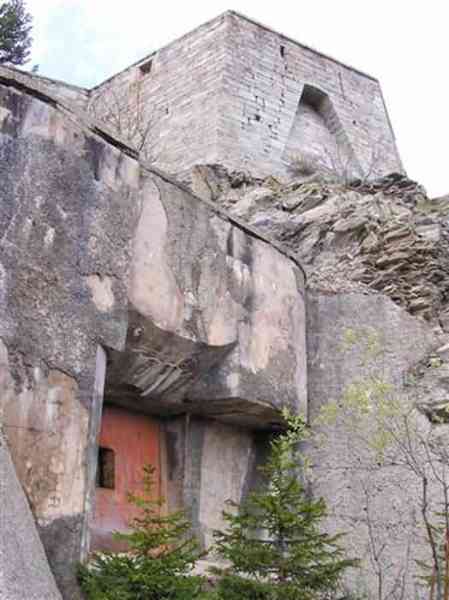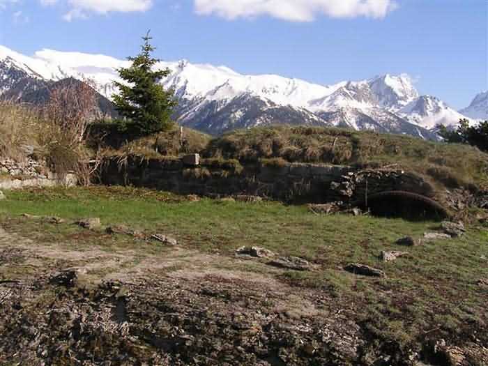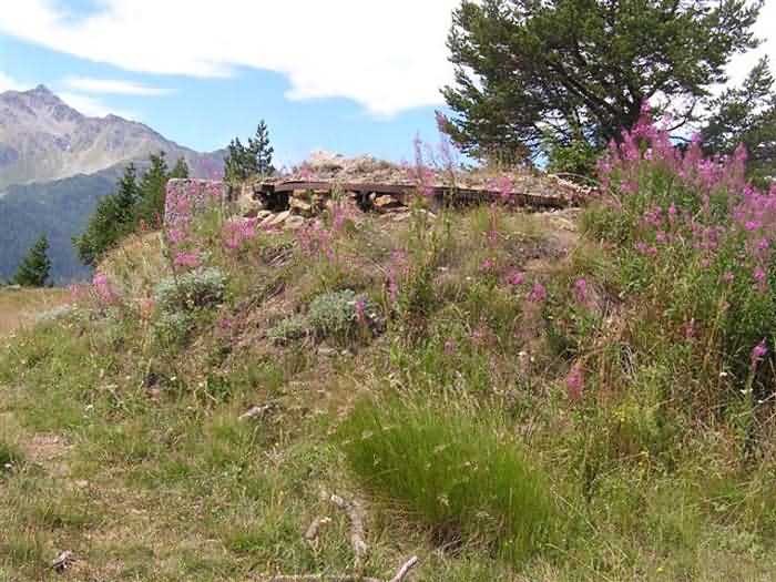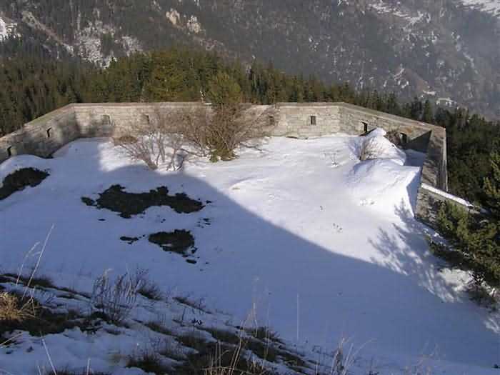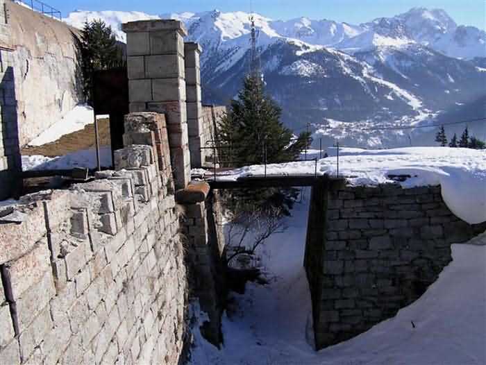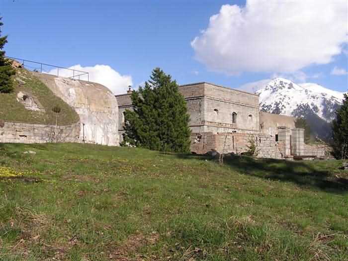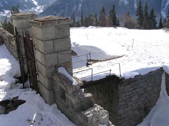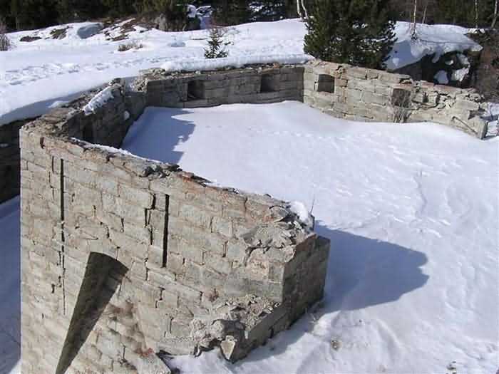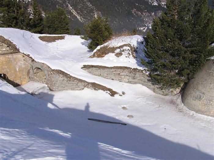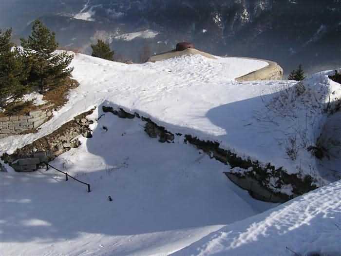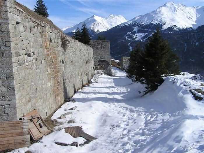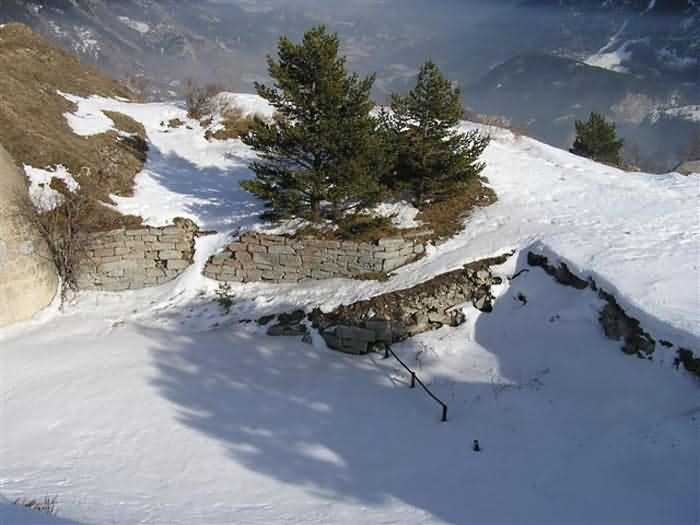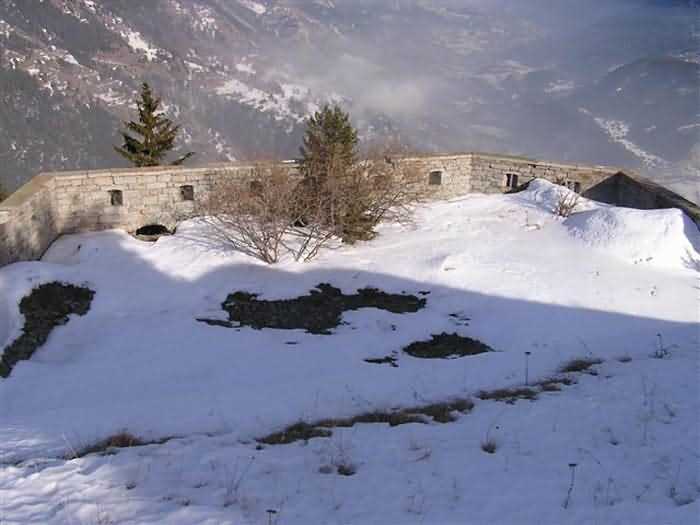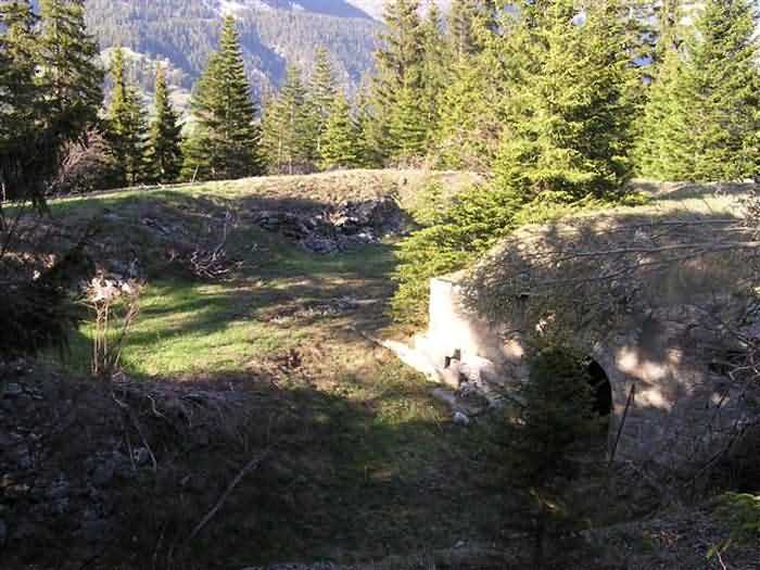 Fortress of Modane, 1600 m west of the town, 1886-1892; reorganized in 1913-1916 and left unfinished. 1737 m/alt. 202 men + ? officers. Twelve 155L de Bange Mle 77 guns, including four in annexes, to which are added the four guns of the rock casemates; no guns intended for flanking nor curved-fire guns are listed. Work for the protection of Replaton fort, it plays this role both by its overlooking position and its counter-battery capabilities. Located on a secondary summit of mont du Sapey (the slightly higher main summit is occupied by the homonymous redoubt), it occupies a highly strategic position in the heart of Maurienne, being capable of covering all dangerous directions. Indeed, it benefits from clear 360° views while dominating the valley by 700 m; it is particularly well positioned facing the penetration axes; covers the Haute Maurienne and the exits of Mont Cenis pass, dominates the Fréjus tunnel, and finally faces the passes south of Modane. Fort Sapey is one of the rare, if not the only, mountain fort of the central massif type. Its perimeter presents as an irregular heptagon, adapted to the terrain. The scarp is surmounted by a crenellated wall and preceded by a ditch with unreveted counterscarp, except to the north and east where the rocky escarpment constitutes an obstacle of certain value. The perimeter, with seven salients, is defended by four bastionets. No. 1 is located at one-third of the gorge front to flank the drawbridge. Each of these bastionets is equipped with vertical rifle loopholes and foot loopholes. Bastionet 5, facing Haute Maurienne, appears largely oversized compared to the others. Access to the work is by crossing an under-pivoting drawbridge, similar to that of Replaton fort. Past this drawbridge, one enters the place d'armes. At its center rises a masonry building whose roof alone is covered with a layer of earth. This is the peacetime barracks; the quarters and functional rooms are distributed over two floors. In the basement of the western abutment, in other words the end adjacent to the ditch, a 175 m³ cistern is installed; above it remains a metal reservoir without its pump. The drinking water supply was provided by tapping a spring near the hamlet of Polset, the water was conveyed by a cast iron pipe about 4500 m long, emerging into the ditch through a perfectly visible rock-cut trench. The place d'armes is bordered by an inverted U-shaped building, entirely covered with a 2.5 m thick special concrete carapace. Unlike Replaton fort, the concrete carapace here is glued to the facade of the casemates; moreover, many openings have been blocked up, particularly the magazines on the ground floor. This is one of the first responses of engineers to the shell crisis, a crisis that occurred while construction was in full swing. This building, besides several magazines and workshops, houses an oven for 250 rations, a stable for three horses, and a watering trough. The two building corners are occupied by a magazine for assembled projectiles and a powder magazine with a capacity of 45 tonnes. As for the casemated war quarters, they partially occupy the floor of the central wing of the building. From the rear corridor, near the assembled ammunition magazine, opens a gallery leading to the optical post. The latter is installed under bastionet 3. The two embrasures are practically placed opposite each other in the flanks of the bastionet, their exits being in the field of fire of the foot loopholes. The right optical embrasure (towards west) is sharply inclined downwards, allowing communication with Loutraz barracks (right bank of Arc in Modane, detachment of the 99th RIA (Alpine Infantry Regiment) - then quarters of the 71st BAF from 1935, and of the 81st and 91st BAF (Alpine Fortress Battalion) following the 1939 mobilization). As for the left embrasure, it seems to correspond with Télégraphe fort. An inclined plane bypasses the building to the south; it is via this path that one accesses the artillery battery located in front of the building. This battery, whose front curve allowed treating all dangerous directions, comprises five platforms and two traverse-shelters distributed as follows: a double platform, a first traverse-shelter, two single platforms separated by a full traverse, a traverse-shelter, a triple broken platform in chevron, a full traverse and, finally, a single platform. Let us dwell for a moment on the traverse-shelters. The first, located in the northeast angle of the battery, has its entrance at an angle. As for the second, placed in the center of the battery, it is built exactly in the axis of Haute Maurienne; moreover, it has the particularity of being covered with a 2.5 m special concrete carapace, like the building, making it particularly visible. Both traverse-shelters are closed by metal doors still in place. To increase firepower in the two dangerous directions (to the east facing the exits of Mont Cenis pass, to the south facing the exits of the southern passes), two annex batteries are built and designated North and South annexes. The first, located north of the work, near salient III, comprises two single platforms separated by a traverse-shelter. The second, set back to the southwest, features a double platform bordered by a traverse-shelter perpendicular to the firing direction. In both annexes, the constructions are in masonry covered with earth; the traverse-shelters, equipped with arms, are again oriented facing east. If, at its completion in 1892, the work offered good guarantees for its occupants, it was quickly overtaken by artillery progress. Two factors come into play: the development and precision of time-fuze fire on one hand, and the development of mountain artillery on the other. The latter point deserves explanation: the creation of alpine troops, in France as in Italy, leads to the development of transportable artillery on muleback, i.e., capable of doing without a road network that was very limited at the 
