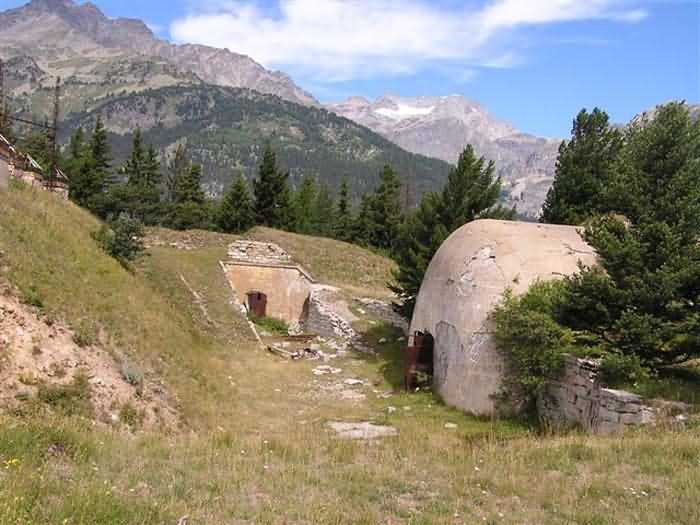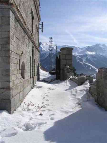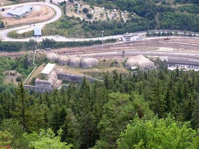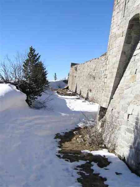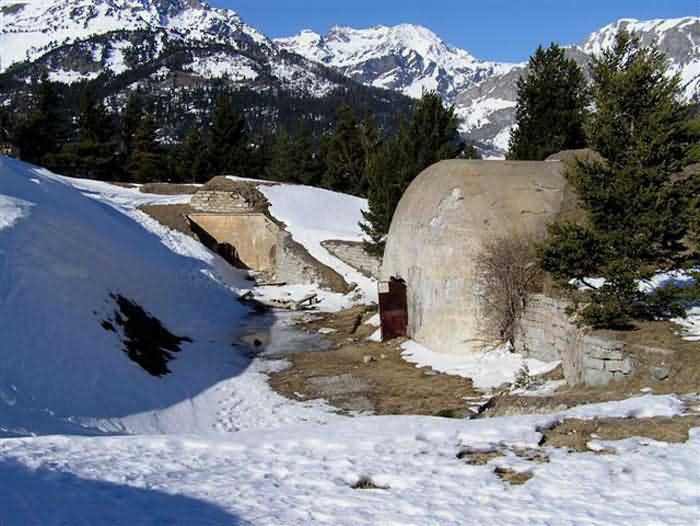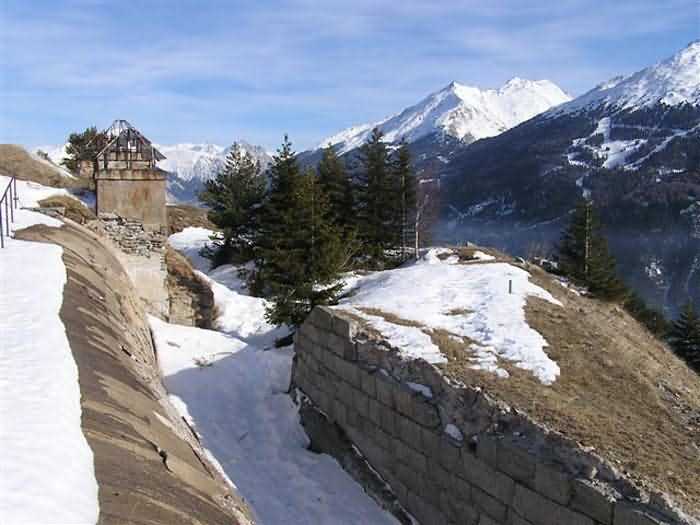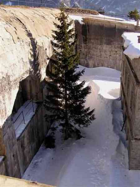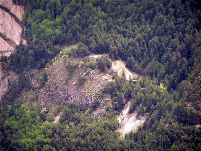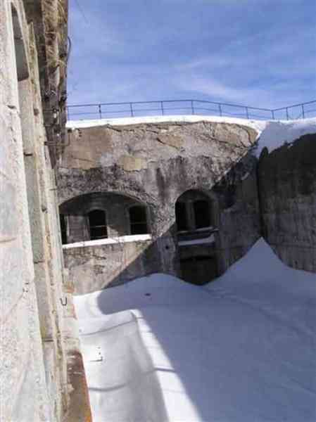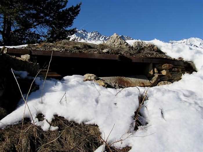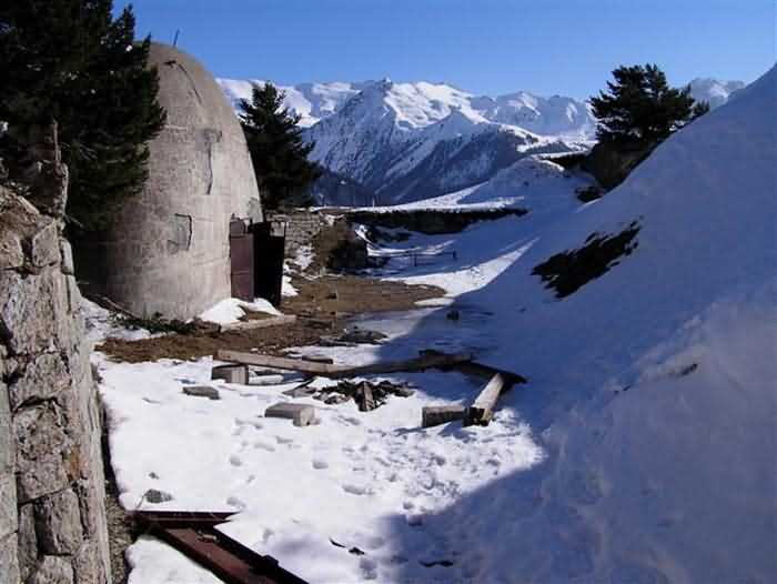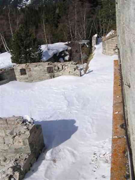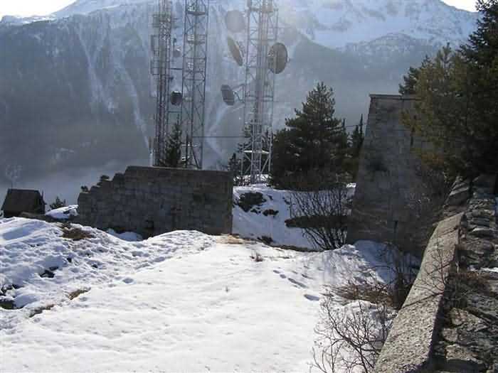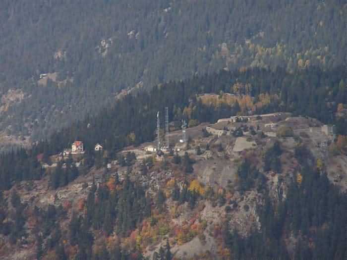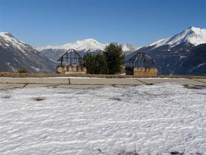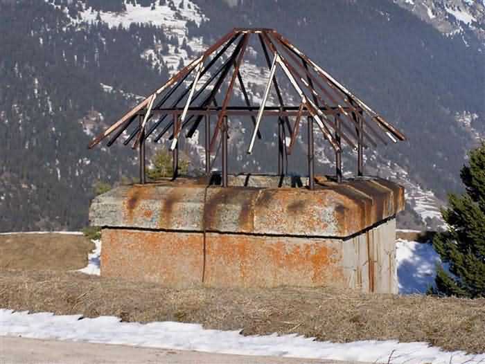 Fortress of Modane, 1600 m west of the town, 1886-1892; reorganized in 1913-1916 and left unfinished. 1737 m/alt. 202 men + ? officers. Twelve 155L de Bange Mle 77 guns, including four in annexes, to which are added the four guns of the rock casemates; no guns intended for flanking nor curved-fire guns are listed. Work for the protection of Replaton fort, it plays this role both by its overlooking position and its counter-battery capabilities. Located on a secondary summit of mont du Sapey (the slightly higher main summit is occupied by the homonymous redoubt), it occupies a highly strategic position in the heart of Maurienne, being capable of covering all dangerous directions. Indeed, it benefits from clear 360° views while dominating the valley by 700 m; it is particularly well positioned facing the penetration axes; covers the Haute Maurienne and the exits of Mont Cenis pass, dominates the Fréjus tunnel, and finally faces the passes south of Modane. Fort Sapey is one of the rare, if not the only, mountain fort of the central massif type. Its perimeter presents as an irregular heptagon, adapted to the terrain. The scarp is surmounted by a crenellated wall and preceded by a ditch with unreveted counterscarp, except to the north and east where the rocky escarpment constitutes an obstacle of certain value. The perimeter, with seven salients, is defended by four bastionets. No. 1 is located at one-third of the gorge front to flank the drawbridge. Each of these bastionets is equipped with vertical rifle loopholes and foot loopholes. Bastionet 5, facing Haute Maurienne, appears largely oversized compared to the others. Access to the work is by crossing an under-pivoting drawbridge, similar to that of Replaton fort. Past this drawbridge, one enters the place d'armes. At its center rises a masonry building whose roof alone is covered with a layer of earth. This is the peacetime barracks; the quarters and functional rooms are distributed over two floors. In the basement of the western abutment, in other words the end adjacent to the ditch, a 175 m³ cistern is installed; above it remains a metal reservoir without its pump. The drinking water supply was provided by tapping a spring near the hamlet of Polset, the water was conveyed by a cast iron pipe about 4500 m long, emerging into the ditch through a perfectly visible rock-cut trench. The place d'armes is bordered by an inverted U-shaped building, entirely covered with a 2.5 m thick special concrete carapace. Unlike Replaton fort, the concrete carapace here is glued to the facade of the casemates; moreover, many openings have been blocked up, particularly the magazines on the ground floor. This is one of the first responses of engineers to the shell crisis, a crisis that occurred while construction was in full swing. This building, besides several magazines and workshops, houses an oven for 250 rations, a stable for three horses, and a watering trough. The two building corners are occupied by a magazine for assembled projectiles and a powder magazine with a capacity of 45 tonnes. As for the casemated war quarters, they partially occupy the floor of the central wing of the building. From the rear corridor, near the assembled ammunition magazine, opens a gallery leading to the optical post. The latter is installed under bastionet 3. The two embrasures are practically placed opposite each other in the flanks of the bastionet, their exits being in the field of fire of the foot loopholes. The right optical embrasure (towards west) is sharply inclined downwards, allowing communication with Loutraz barracks (right bank of Arc in Modane, detachment of the 99th RIA (Alpine Infantry Regiment) - then quarters of the 71st BAF from 1935, and of the 81st and 91st BAF (Alpine Fortress Battalion) following the 1939 mobilization). As for the left embrasure, it seems to correspond with Télégraphe fort. An inclined plane bypasses the building to the south; it is via this path that one accesses the artillery battery located in front of the building. This battery, whose front curve allowed treating all dangerous directions, comprises five platforms and two traverse-shelters distributed as follows: a double platform, a first traverse-shelter, two single platforms separated by a full traverse, a traverse-shelter, a triple broken platform in chevron, a full traverse and, finally, a single platform. Let us dwell for a moment on the traverse-shelters. The first, located in the northeast angle of the battery, has its entrance at an angle. As for the second, placed in the center of the battery, it is built exactly in the axis of Haute Maurienne; moreover, it has the particularity of being covered with a 2.5 m special concrete carapace, like the building, making it particularly visible. Both traverse-shelters are closed by metal doors still in place. To increase firepower in the two dangerous directions (to the east facing the exits of Mont Cenis pass, to the south facing the exits of the southern passes), two annex batteries are built and designated North and South annexes. The first, located north of the work, near salient III, comprises two single platforms separated by a traverse-shelter. The second, set back to the southwest, features a double platform bordered by a traverse-shelter perpendicular to the firing direction. In both annexes, the constructions are in masonry covered with earth; the traverse-shelters, equipped with arms, are again oriented facing east. If, at its completion in 1892, the work offered good guarantees for its occupants, it was quickly overtaken by artillery progress. Two factors come into play: the development and precision of time-fuze fire on one hand, and the development of mountain artillery on the other. The latter point deserves explanation: the creation of alpine troops, in France as in Italy, leads to the development of transportable artillery on muleback, i.e., capable of doing without a road network that was very limited at the 
