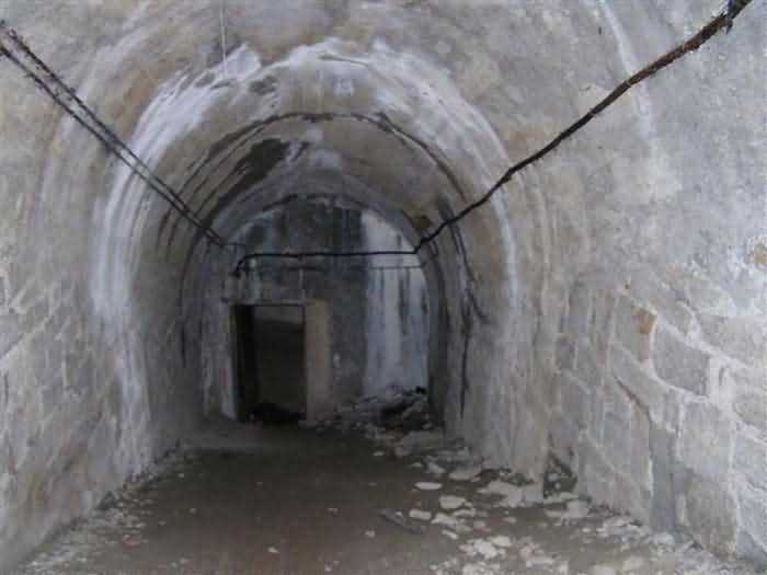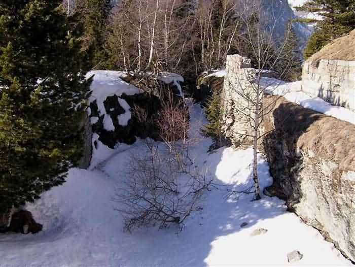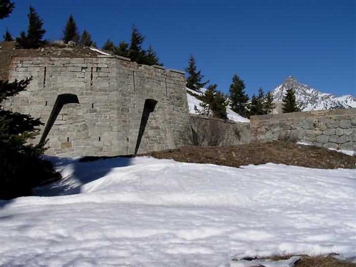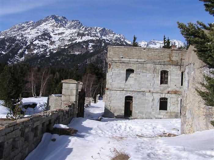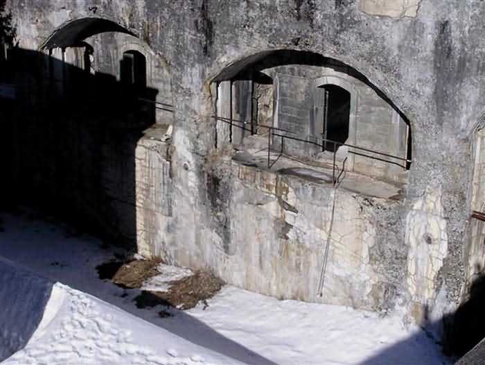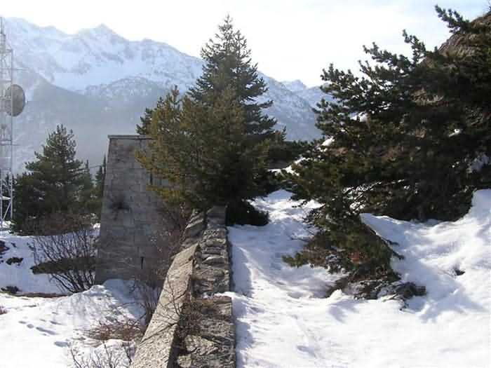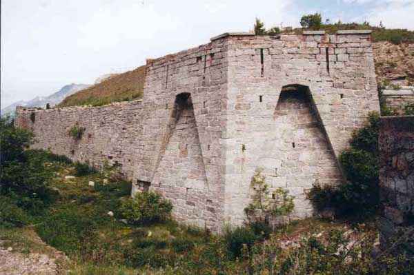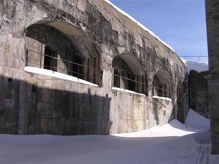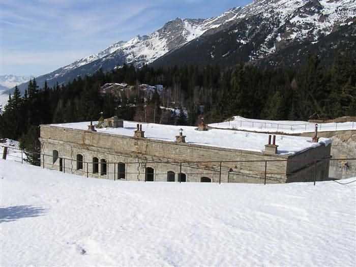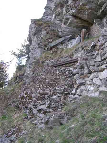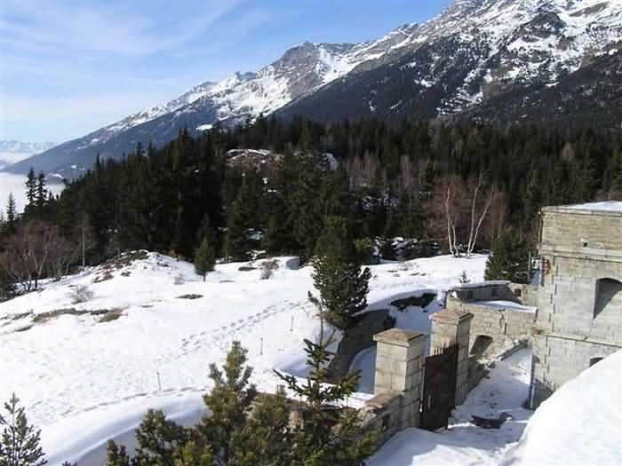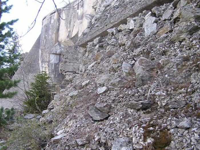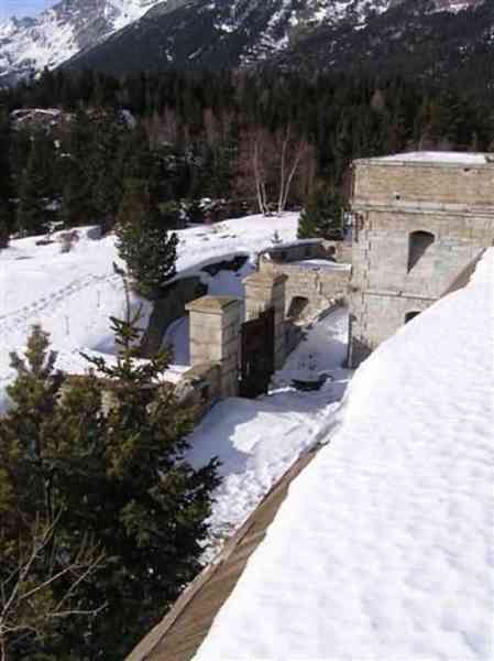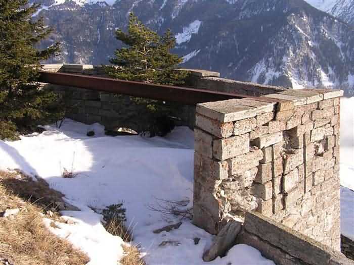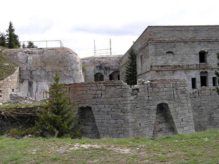 Fortress of Modane, 1600 m west of the town, 1886-1892; reorganized in 1913-1916 and left unfinished. 1737 m/alt. 202 men + ? officers. Twelve 155L de Bange Mle 77 guns, including four in annexes, to which are added the four guns of the rock casemates; no guns intended for flanking nor curved-fire guns are listed. Work for the protection of Replaton fort, it plays this role both by its overlooking position and its counter-battery capabilities. Located on a secondary summit of mont du Sapey (the slightly higher main summit is occupied by the homonymous redoubt), it occupies a highly strategic position in the heart of Maurienne, being capable of covering all dangerous directions. Indeed, it benefits from clear 360° views while dominating the valley by 700 m; it is particularly well positioned facing the penetration axes; covers the Haute Maurienne and the exits of Mont Cenis pass, dominates the Fréjus tunnel, and finally faces the passes south of Modane. Fort Sapey is one of the rare, if not the only, mountain fort of the central massif type. Its perimeter presents as an irregular heptagon, adapted to the terrain. The scarp is surmounted by a crenellated wall and preceded by a ditch with unreveted counterscarp, except to the north and east where the rocky escarpment constitutes an obstacle of certain value. The perimeter, with seven salients, is defended by four bastionets. No. 1 is located at one-third of the gorge front to flank the drawbridge. Each of these bastionets is equipped with vertical rifle loopholes and foot loopholes. Bastionet 5, facing Haute Maurienne, appears largely oversized compared to the others. Access to the work is by crossing an under-pivoting drawbridge, similar to that of Replaton fort. Past this drawbridge, one enters the place d'armes. At its center rises a masonry building whose roof alone is covered with a layer of earth. This is the peacetime barracks; the quarters and functional rooms are distributed over two floors. In the basement of the western abutment, in other words the end adjacent to the ditch, a 175 m³ cistern is installed; above it remains a metal reservoir without its pump. The drinking water supply was provided by tapping a spring near the hamlet of Polset, the water was conveyed by a cast iron pipe about 4500 m long, emerging into the ditch through a perfectly visible rock-cut trench. The place d'armes is bordered by an inverted U-shaped building, entirely covered with a 2.5 m thick special concrete carapace. Unlike Replaton fort, the concrete carapace here is glued to the facade of the casemates; moreover, many openings have been blocked up, particularly the magazines on the ground floor. This is one of the first responses of engineers to the shell crisis, a crisis that occurred while construction was in full swing. This building, besides several magazines and workshops, houses an oven for 250 rations, a stable for three horses, and a watering trough. The two building corners are occupied by a magazine for assembled projectiles and a powder magazine with a capacity of 45 tonnes. As for the casemated war quarters, they partially occupy the floor of the central wing of the building. From the rear corridor, near the assembled ammunition magazine, opens a gallery leading to the optical post. The latter is installed under bastionet 3. The two embrasures are practically placed opposite each other in the flanks of the bastionet, their exits being in the field of fire of the foot loopholes. The right optical embrasure (towards west) is sharply inclined downwards, allowing communication with Loutraz barracks (right bank of Arc in Modane, detachment of the 99th RIA (Alpine Infantry Regiment) - then quarters of the 71st BAF from 1935, and of the 81st and 91st BAF (Alpine Fortress Battalion) following the 1939 mobilization). As for the left embrasure, it seems to correspond with Télégraphe fort. An inclined plane bypasses the building to the south; it is via this path that one accesses the artillery battery located in front of the building. This battery, whose front curve allowed treating all dangerous directions, comprises five platforms and two traverse-shelters distributed as follows: a double platform, a first traverse-shelter, two single platforms separated by a full traverse, a traverse-shelter, a triple broken platform in chevron, a full traverse and, finally, a single platform. Let us dwell for a moment on the traverse-shelters. The first, located in the northeast angle of the battery, has its entrance at an angle. As for the second, placed in the center of the battery, it is built exactly in the axis of Haute Maurienne; moreover, it has the particularity of being covered with a 2.5 m special concrete carapace, like the building, making it particularly visible. Both traverse-shelters are closed by metal doors still in place. To increase firepower in the two dangerous directions (to the east facing the exits of Mont Cenis pass, to the south facing the exits of the southern passes), two annex batteries are built and designated North and South annexes. The first, located north of the work, near salient III, comprises two single platforms separated by a traverse-shelter. The second, set back to the southwest, features a double platform bordered by a traverse-shelter perpendicular to the firing direction. In both annexes, the constructions are in masonry covered with earth; the traverse-shelters, equipped with arms, are again oriented facing east. If, at its completion in 1892, the work offered good guarantees for its occupants, it was quickly overtaken by artillery progress. Two factors come into play: the development and precision of time-fuze fire on one hand, and the development of mountain artillery on the other. The latter point deserves explanation: the creation of alpine troops, in France as in Italy, leads to the development of transportable artillery on muleback, i.e., capable of doing without a road network that was very limited at the 