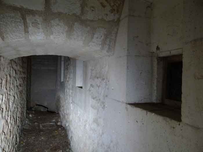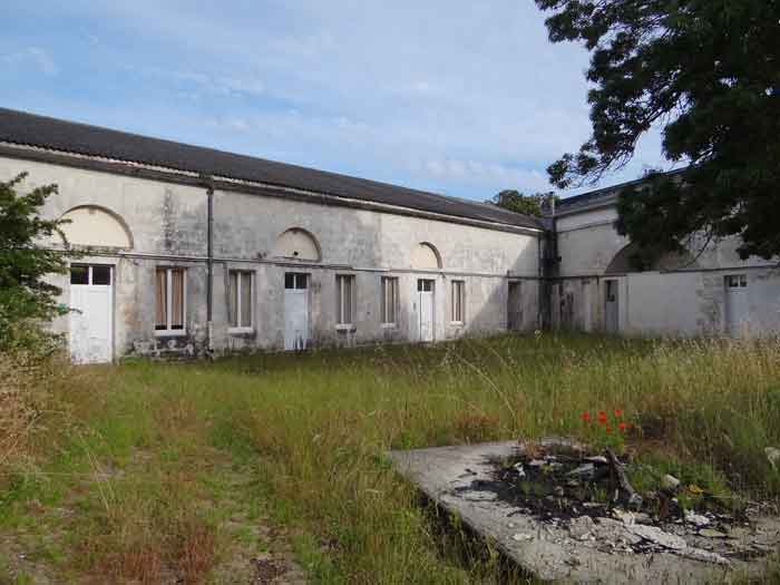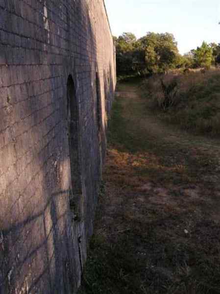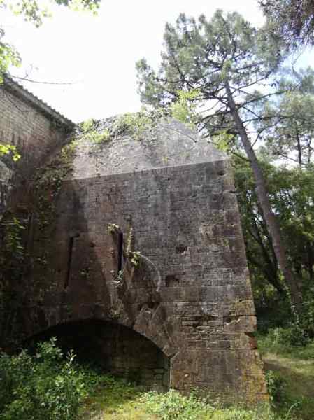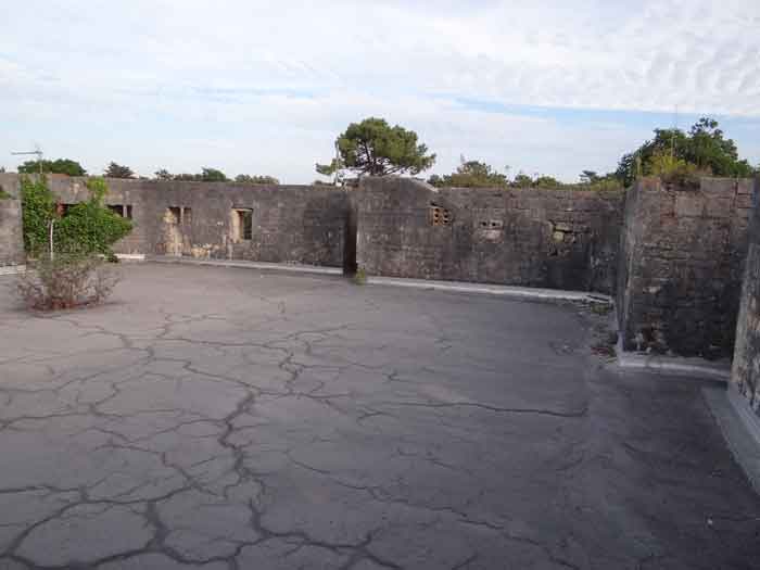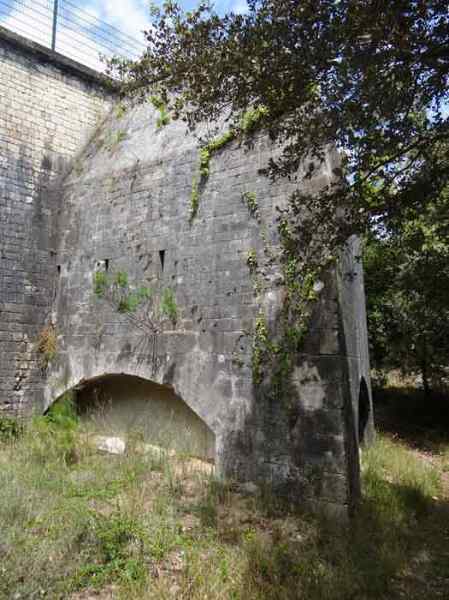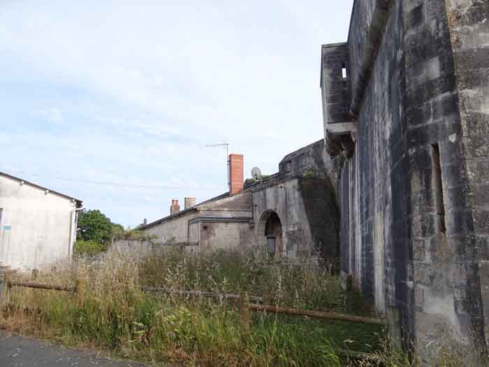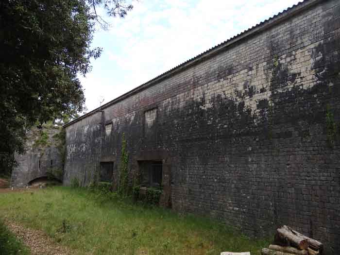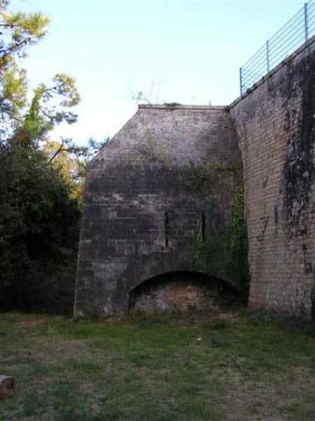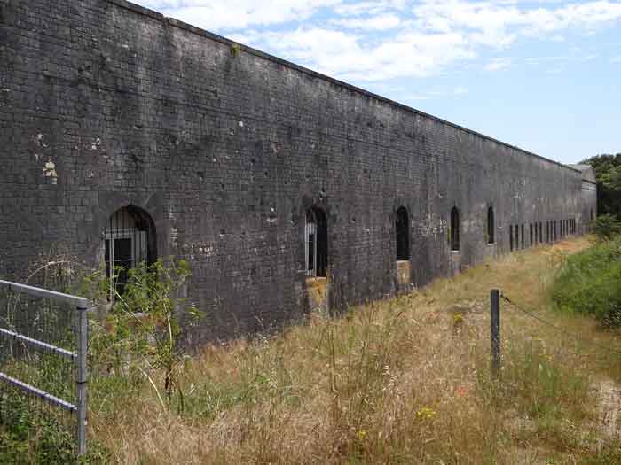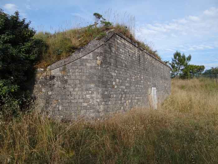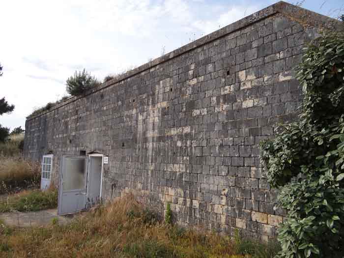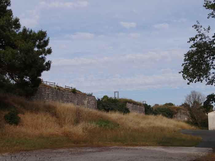 Fortress of Rochefort, north-eastern point of Oléron Island. The genesis of this fort was to say the least tumultuous, between projects accepted then refused after work commenced and other multiple procrastinations. Ultimately, the fort is organized around a Tower Model 1811 No. 1, much more classical than its counterpart in Boyardville, which tower will constitute not only a defensive reduit, but also ensure protection of the gorge front. From 1849 to 1854, a veritable fort, with a dry ditch, will be attached to the tower. The gorge scarp will join two of its opposite angles, so that two of its faces project into the ditch, like a double caponier devoid of a front, having only its two flanks. The entrance, with a drawbridge, will be placed directly to the right of the tower. The fort will take the shape of a very elongated pentagon (± 130 m in length). Two double caponiers will complete the close defense system, at salients II and IV. The latter are very pretty with their foot embrasures surmounted by three rifle embrasures and connected to the top of the scarp (peaking at 8.20 m) not by a mass of earth, but by rubble masonry. Along their entire length, the gorge and fronts I-II, II-III and IV-V have casemates backing onto them, whether for quarters or magazines. The garrison was on the order of 500 men who served 40 guns. The fort is perfectly defiladed from view; to achieve this, topsoil had to be brought in to form all the slopes and then seed them, as sand was not suitable for this. In 1860, high rifle embrasures with setbacks are pierced in the right half of the scarp. Very probably around 1880, the front III-IV is remodeled and provided with three traverse-shelters whose outer ones, and especially the left one, are more imposing than usual. This left traverse furthermore includes two doors. The firing steps give us no clue as to the caliber in place; 19 c, 24 c or 27 c? A report of the Coastal Defense Commission, dated 19 February 1886, reports an annex battery built from 1877 to 1880 and an advanced work built in 1878-1879. The annex battery will be named the Saumonards battery. As for the advanced work, it must be this pretty private property (09/2007) surrounded by an enclosure with corner bastionnets, on the gate of which a plaque "Redoute Beauregard" appears. From the outside no gun emplacement could be detected, but it is possible that the fort's bombardment battery was supported by a medium caliber battery. Not knowing if this designation is official or initiated by the current owner (it is a plaque stuck against one of the entrance pillars) we do not include this redoubt in a separate short article. Finally, in front of the fort, level with its right side, was the exterior post of the line of 47 torpedoes ensuring the protection of the passage south of the Boyard shoal. This post was ideally to be assisted by a searchlight and, necessarily, an electric power plant. Does that still exist? We do not know.