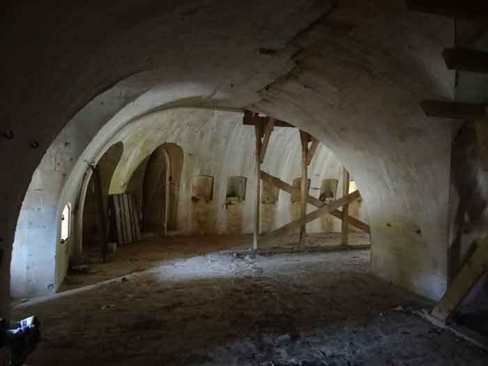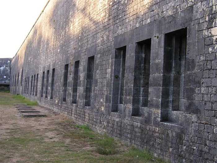 Festung von Rochefort, Nordostspitze der Insel Oléron. Die Entstehung dieses Forts war gelinde gesagt turbulent, zwischen angenommenen, dann nach Beginn der Arbeiten abgelehnten Projekten und anderen vielfältigen Verzögerungen. Letztendlich gliedert sich das Fort um einen Turm Modell 1811 Nr. 1, viel klassischer als sein Gegenstück in Boyardville, welcher Turm nicht nur ein defensives Reduit bilden, sondern auch den Kehlenfrontschutz gewährleisten wird. Von 1849 bis 1854 wird ein echtes Fort mit Trockengraben an den Turm angebaut. Die Kehleneskarpe wird sich mit zwei seiner gegenüberliegenden Winkel verbinden, so dass zwei seiner Flächen im Graben hervortreten, wie eine doppelte Kaponniere ohne Stirnseite, die nur ihre beiden Flanken hat. Der Eingang mit Zugbrücke wird direkt rechts des Turms platziert. Das Fort wird die Form eines sehr gestreckten Fünfecks (± 130 m Länge) annehmen. Zwei doppelte Kaponnieren werden die Nahverteidigungsvorrichtung an den Salienten II und IV vervollständigen. Letztere sind sehr hübsch mit ihren Fußscharten, überragt von drei Gewehrscharten, und verbunden mit der Spitze der Eskarpe (die 8,20 m hoch ist) nicht durch eine Erdmasse, sondern durch Bruchsteinmauerwerk. Über ihre gesamte Länge sind die Kehle und die Fronten I-II, II-III und IV-V mit Kasematten unterlegt, sei es für Unterkünfte oder Magazine. Die Garnison betrug etwa 500 Mann, die 40 Kanonen bedienten. Das Fort ist den Blicken perfekt entzogen; dazu musste Mutterboden herbeigeschafft werden, um alle Böschungen zu bilden und sie dann einzusäen, da Sand dafür nicht geeignet war. 1860 werden hohe Gewehrscharten mit Vorsprüngen in die rechte Hälfte der Eskarpe gebrochen. Sehr wahrscheinlich gegen 1880 wird die Front III-IV überarbeitet und mit drei Traversen-Unterständen versehen, deren äußere, und besonders die linke, imposanter als gewöhnlich sind. Diese linke Traverse umfasst übrigens zwei Türen. Die Schusspositionen liefern uns keinen Hinweis auf das vorhandene Kaliber; 19 c, 24 c oder 27 c? Ein Sitzungsprotokoll der Kommission für Küstenverteidigung vom 19. Februar 1886 berichtet von einer von 1877 bis 1880 gebauten Annexbatterie und einem 1878-1879 gebauten vorgeschobenen Werk. Die Annexbatterie wird Batterie der Saumonards genannt. Was das vorgeschobene Werk betrifft, muss es sich um dieses hübsche Privateigentum (09/2007) handeln, umgeben von einer Einfriedung mit Eckbastionetten, an deren Portal eine Plakette "Redoute Beauregard" angebracht ist. Von außen konnte keine Geschützstellung erkannt werden, aber es ist durchaus möglich, dass die Bombardierungsbatterie des Forts durch eine Batterie mittleren Kalibers unterstützt wurde. Da wir nicht wissen, ob diese Bezeichnung offiziell ist oder vom aktuellen Eigentümer initiiert wurde (es handelt sich um eine an einem der Eingangspfeiler geklebte Plakette), übernehmen wir diese Redoute nicht in einem separaten Artikel. Schließlich, vor dem Fort, auf der Höhe seiner rechten Seite, befand sich der Außenposten der Linie von 47 Torpedos, die den Schutz der Passage südlich der Boyard-Bank sicherstellte. Dieser Posten sollte idealerweise von einem Scheinwerfer und zwangsläufig einem Elektrizitätswerk unterstützt werden. Existiert das noch? Wir wissen es nicht.