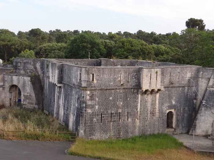 Vesting van Rochefort, noordoostpunt van het Eiland Oléron. De genesis van dit fort was op zijn minst gezegd bewogen, tussen aanvaarde projecten dan geweigerd na start van de werken en andere veelvuldige treuzelarijen. Uiteindelijk articuleert het fort zich rond een toren Model 1811 nr. 1, veel klassieker dan haar zuster van Boyardville, welke toren niet alleen een defensief reduit zal vormen, maar ook de bescherming van de keelfront zal verzekeren. Van 1849 tot 1854 wordt een echt fort, met droge gracht, aan de toren vastgebouwd. De keel-escarp zal zich verbinden met twee van zijn tegenovergestelde hoeken, zodanig dat twee van zijn zijden in de gracht uitkomen, zoals een dubbele caponnière verstoken van front, slechts haar twee flanken hebbend. De ingang, met ophaalbrug, zal direct rechts van de toren geplaatst worden. Het fort zal de vorm aannemen van een zeer uitgerekte vijfhoek (± 130 m lengte). Twee dubbele caponnières zullen het apparaat van nabije verdediging vervolledigen, aan de saillanten II en IV. Deze laatste zijn zeer mooi met hun voetschietgaten overwelfd door drie geweerschietgaten en verbonden met de top van de escarp (toppend op 8,20 m) niet door een massa aarde, maar door metselwerk van bouwpuin. Over hun gehele lengte, de keel en de fronten I-II, II-III en IV-V zien zich kasematten opgedrongen, hetzij voor huisvesting of magazijnen. Het garnizoen was van de orde van 500 man welke 40 kanonnen bedienden. Het fort is perfect gedefileerd aan de zichten; daartoe was het nodig vegetale aarde aan te voeren om alle taluds te vormen dan te bezaaien, het zand daartoe niet geschikt zijnd. In 1860, worden hoge geweerschietgaten met verspringingen doorgebroken in de rechterhelft van de escarp. Zeer waarschijnlijk rond 1880, ziet de front III-IV zich herschikt en voorzien van drie traverse-schuilplaatsen welker buitenste, en vooral die van links, indrukwekkender zijn dan gewoonlijk. Deze traverse van links omvat trouwens twee deuren. De vuurposities leveren ons geen enkel hint op betreffende het ter plaatse zijnde kaliber; 19 c, 24 c of 27 c? Een proces-verbaal van de Commissie voor Kustverdediging, daterend van 19 februari 1886, maakt melding van een annexbatterij gebouwd van 1877 tot 1880 en een vooruitgeschoven werk gebouwd in 1878-1879. De annexbatterij zal batterij van de Saumonards genoemd worden. Wat het vooruitgeschoven werk betreft, het moet gaan om dit mooie privé-eigendom (09/2007) omringd door een omsluiting met hoekbastionnetjes, aan wiens poort een plaat "redoute Beauregard" figureert. Vanaf de buitenkant kon geen enkel kanonemplacement worden opgemerkt, maar het is binnen het mogelijke dat de bombardementsbatterij van het fort werd gesteund door een batterij van middelmatig kaliber. Niet wetend of deze benaming officieel is of geïnitieerd door de huidige eigenaar (het gaat om een plaat geplakt tegen een der pijlers van de ingang) nemen wij deze redoute niet over in een afzonderlijk artikeltje. Tenslotte, voor het fort, ter hoogte van zijn rechterkant, bevond zich de buitenpost van de lijn van 47 torpedo's verzekerend de bescherming van de doorgang ten zuiden van de Boyard-zandplaat. Deze post moest idealiter bijgestaan worden door een projector en, noodzakelijkerwijs, een elektriciteitsfabriek. Bestaat dat nog? Wij weten het niet.