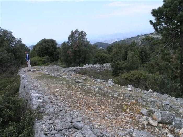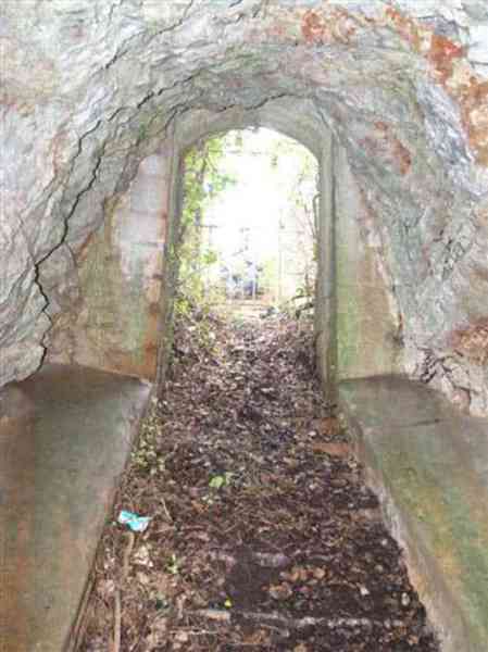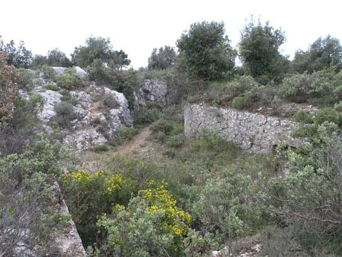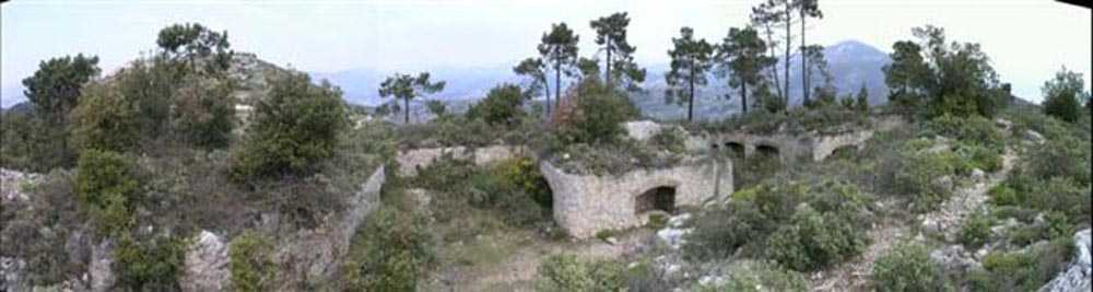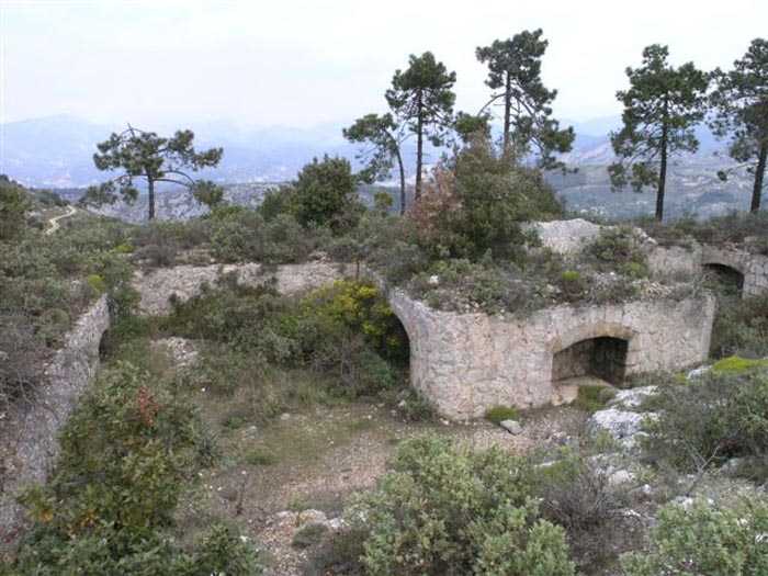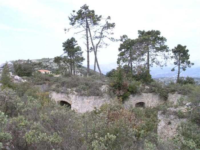 Fortress of Nice, east-northeast of the city, ± 1881. 676 m/alt. First annex battery 450 m southeast of Revère fort. A wall/parapet, thick in some places up to four meters, connects the battery to the fort, passing near the peacetime barracks. The battery is excavated in the rock. A trench runs along the rear of the four platforms, platforms separated by solid traverses but studded with projectile niches at the rate of one at the base, two per right flank and one per left flank. The central traverse, determining the angle breaking the parapet line into a chevron, is narrower at its base than on its head front. Its masonry is perfectly preserved and no slope extends the rear of the platforms, as can be seen at the battery du Pin for example. On its left, the battery magazine is accessible after descending a staircase. It comprises a niche facing the staircase and two recesses, devoid of any partitioning, even at the level of their junction with the central corridor, left as raw rock. These recesses measure about 250 x 200 cm. This magazine, preceded by a small portal that has preserved its grille, is flooded under about forty cm of water (04/2008). Behind the battery, 150 m southeast, the strategic road going towards Forna crosses a tunnel in which there is a rock magazine (see separate article). The junction between this tunnel and the battery was effected by a path making up for a steep slope by winding along the hillside. Sometimes called "battery des Samboules". Botanical trail, free access.