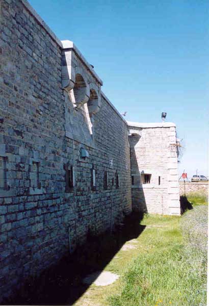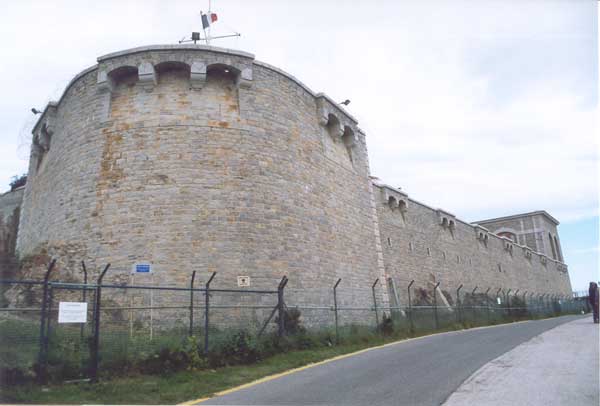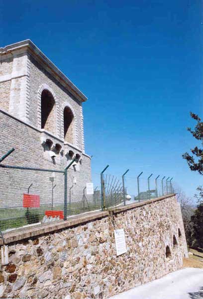 Fortress of Toulon, southwest of the city, 1875-1880. 200 m/alt. ± 1000 men, 32 guns. Large irregular pentagon combining land defense (exits of the Ollioules gorges) and coastal defense (landing at Le Brusc or Bandol). Built in place of a village razed for the cause, it is known for its barracks with 9 bays (+ 2 lateral) on 4 levels, making it the most monumental in the entire Séré de Rivières system. This barracks is backed against the rock and its roof reaches the level of the upper platform of the massif. Carefully maintained, with facades of the bays combining terracotta bricks and limestone rubble, it is certainly one of the most beautiful we have been given to admire. This barracks, preceded by a courtyard, is aligned along front I-II. The scarp of this front is garnished with foot embrasures which are placed so high that it is difficult to distinguish them from machicolations. The caponier of salient II even shows a peculiar re-entrant corner embrasure. The entrance, whose passage is in a segmental arch vault, is surmounted by a pretty cartouche with the name of the fort, itself topped by a small balcony more decorative than effective, furnished with three embrasures which, were it not for their splay, could claim the rank of murder holes. The entrance porch passed, one enters a first courtyard giving onto the rear of the right flank of the large barracks. The narrowness of this courtyard and the height of the four levels of the barracks make the latter even more monumental. In this courtyard, we will note, on the left, the covered passage with two superb keystones leading into the main courtyard, a fountain with careful stonework, an access to the two flights of a stair-ramp more decorative than effective (the two flights have gaps of 160 and 200 cm respectively, which prevents the ramps from playing their role unless using a utopian variable-gauge axle!) and, on the right, the entrance to the enveloping rock gallery which, following the scarp, joins salient II. Indeed, two-thirds of the fort are excavated in the rock and fronts II-III, III-IV and IV-V are furnished with underground casemates whose embrasure was to be pierced only if needed. There would have been 16 of these casemates which were supplied by a magazine with a capacity of 100 tons excavated, itself, right in the center of the fort. Behind the barracks, a broad gallery leads to this magazine while passing to the right of a hoist shaft 6 m wide. This exceptional dimension was necessitated by the absence of a ramp to bring the guns onto the top of the fort. Ammunition and guns followed the same vertical path as did the men, for that matter, a stairwell adjoining the shaft of this hoist. In 1881, the armament consisted of 8 guns of 155 mm for land defense and 4 of 24 c oriented towards the sea. Among the notable singularities, let us note that the circulation corridor behind the magazines on the ground floor of the large barracks is very narrow while these same corridors on the upper floors are wider. At the entrance of the rock gallery at salient V, two casemates serve as stables and one of the two is perfectly restored, the trough being in wood. Finally, in the southeastern corner of the large courtyard, two small bread ovens are still used from time to time for… pizzas. Notable anomaly, the two ovens are of different models, unless the one on the left was destroyed and its facade rebuilt without a precise plan. Today (04/2006) the fort is a communications center of the Navy. Surprisingly for us continentals, the fort is considered a warship. It has its bell and the information broadcast by the loudspeakers is unequivocal: the commanding officer is coming aboard!; The crew's meal is served!,… The visit to Six Fours, even a partial one (for obvious reasons of confidentiality of certain installations), will remain one of the most exceptional memories of our tour of France of fortifications 1874-1914.