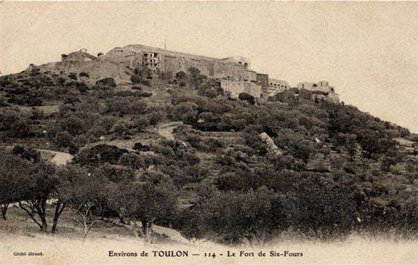 Pevnost Toulon, jihozápadně od města, 1875-1880. 200 m/n.m. ± 1000 mužů, 32 děl. Velký nepravidelný pětiúhelník kombinující obranu pozemní (výstupy z soutěsek Ollioules) a pobřežní (vylodění v Le Brusc nebo Bandol). Postavena na místě vesnice srovnané se zemí pro tento účel, je známá svými kasárnami o 9 polích (+ 2 bočních) na 4 úrovních, což z nich činí nejmonumentálnější v celém systému Séré de Rivières. Tato kasárna je přisazena ke skále a její střecha dosahuje úrovně horní platformy masivu. Pečlivě udržována, s fasádami polí kombinujícími pálené cihly a vápencové lomové zdivo, je jistě jednou z nejkrásnějších, kterou jsme měli možnost obdivovat. Tato kasárna, předcházená nádvořím, je seřazena podél fronty I-II. Eskarpa této fronty je opatřena střílnami u paty, které jsou umístěny tak vysoko, že je těžké je odlišit od střílen. Kaponiera vysunutí II dokonce ukazuje zvláštní vtaženou nárožní střílnu. Vchod, jehož průchod je v segmentové klenbě, je překonán pěkným kartuší se jménem pevnosti, sám zakončený balkónkem spíše dekorativním než účinným, opatřeným třemi střílnami, které, nebýt jejich rozšíření, by mohly nárokovat hodnost padacích mříží. Průjezd vstupním portálem, vstoupíme do prvního nádvoří ústícího na zadní stranu pravého křídla velkých kasáren. Úzkost tohoto nádvoří a výška čtyř pater kasáren činí tyto ještě monumentálnější. Na tomto nádvoří si povšimneme vlevo kryté chodby se dvěma nádhernými svorníky vedoucími do hlavního dvora, kašny s pečlivým kamenosochařským provedením, přístupu ke dvěma ramenům schodišťové rampy spíše dekorativní než účinné (dvě ramena mají rozteč 160 a 200 cm, což brání rampám plnit jejich úlohu, leda by se použila utopická náprava s proměnným rozchodem!) a vpravo vchodu do obalové skalní galerie, která podél eskarpy dosahuje vysunutí II. Skutečně, dvě třetiny pevnosti jsou vytesány ve skále a fronty II-III, III-IV a IV-V jsou opatřeny podzemními kasematami, jejichž střílna měla být proražena pouze v případě potřeby. Bylo by tam 16 těchto kasemat, které byly zásobovány prachárnou o kapacitě 100 tun vytesanou, ta sama, přímo ve středu pevnosti. Za kasárnami široká galerie vede k tomuto magazínu, přičemž prochází vpravo od výtahové šachty o šířce 6 m. Tato výjimečná dimenze byla zapotřebí kvůli absenci rampy pro vytažení děl na vrchol pevnosti. Střelivo a děla následovala stejnou vertikální cestu stejně jako muži, mimochodem, schodišťová šachta přiléhá k šachtě tohoto výtahu. V roce 1881 se výzbroj skládala z 8 děl ráže 155 mm pro pozemní obranu a 4 ráže 24 c orientovaných k moři. Mezi pozoruhodné zvláštnosti zaznamenejme, že oběžná chodba za sklady v přízemí velkých kasáren je velmi úzká, zatímco tytéž chodby v horních patrech jsou širší. U vchodu do skalní galerie u vysunutí V slouží dvě kasematy jako stáje a jedna z obou je dokonale zrestaurovaná, žlab je ze dřeva. Konečně, v jihovýchodním rohu velkého dvora se dva malé chlebové peci občas stále používají na… pizzy. Pozoruhodná anomálie, obě pece jsou různých modelů, ledaže by ta levá byla zničena a její fasáda přestavěna bez přesného plánu. Dnes (04/2006) je pevnost spojovacím střediskem námořnictva. Překvapivě pro nás pevninany je pevnost považována za válečnou loď. Má svůj zvon a informace vysílané reproduktory jsou jednoznačné: velitel nastupuje na palubu!; Posádce se vydává jídlo!,… Návštěva Six Fours, byť částečná (z očividných důvodů důvěrnosti některých zařízení), zůstane jedním z nejvýjimečnějších vzpomínek našeho okruhu Francií opevnění 1874-1914.
