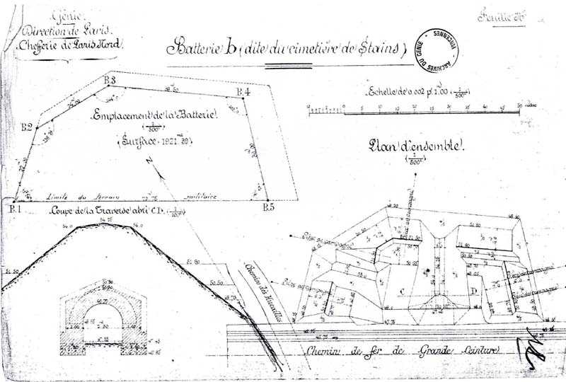 Pevnost Paris, severo-severovýchodně od města, ±1878. Jedna ze 2 přístavních baterií pevnosti Stains zvané „B de Stains“, druhá je baterií Pierrefitte.
