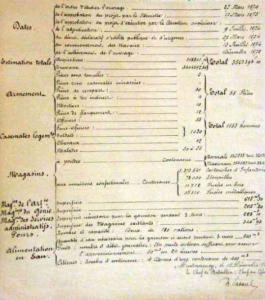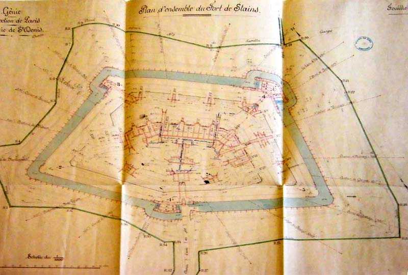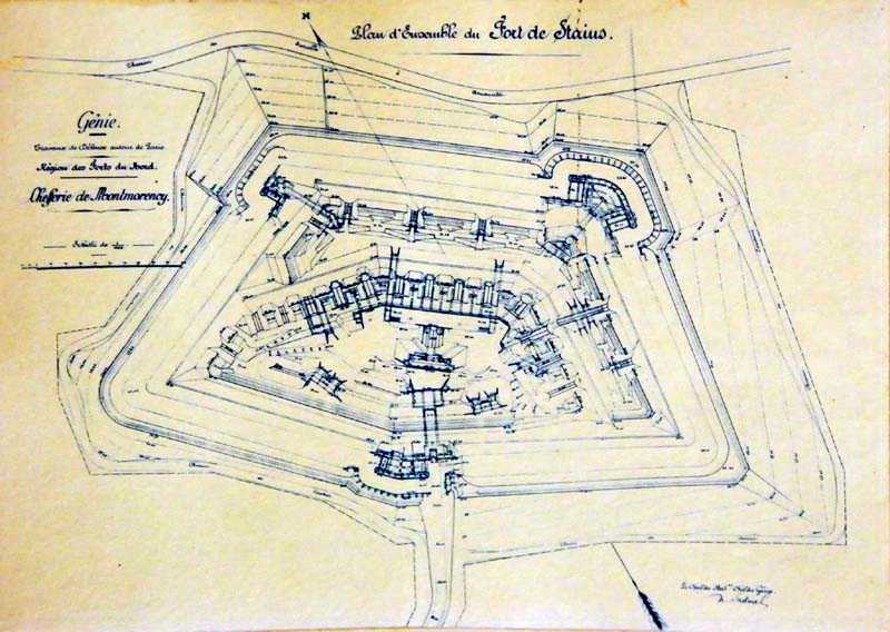 Vesting Parijs, ten noordnoordoosten van de stad, 1875-1878. 88 m/hoogte. Groot cavalierfort voor 1053 manschappen en 58 kanonnen, waaronder 2 onder de Mougin Mle 1876-toren (ontvangen op 25-11-1884). Trapeziumvormig, de kloof was licht gebogen, waardoor het een vijfhoek vormde. De breuk in de kloof wordt gemarkeerd door een dubbele caponnière. Het fort omvatte 4 kazematten voor indirect vuur, twee aan twee ondersteund door de borstwering van de kloof en waarvan drie schietgaten, versterkt met beton, nog steeds zichtbaar zijn. De grachten zijn nu gedempt, de kazerne met tien traveeën op twee niveaus is volledig bedekt met taluds, evenals de artilleriecavalier. Alleen de linkervleugel is overgebleven, bekroond met drie traversen van schuilplaatsen. Op enige afstand van elke kazernevleugel bevond zich een groot kruitmagazijn dat verbonden was met de circulatiegang aan de achterkant van de kazerne en dus via schachten met de cavalier. De kruitbehandeling vond daarom onder een afdak plaats tot aan de schietplatforms van de cavalier. Dwarsliggers 1 en 2 van de onderste batterij omlijsten de afdaling naar de vleugel van saillant III, maar ook hier is alles dichtgemetseld. Als de Mougin-koepel nog steeds aanwezig is, zijn de onderbouwconstructies ontoegankelijk. Deze koepel was verticaal boven de dienstschacht van de dubbele caponnière van saillant IV geplaatst. Deze dubbele caponnière had drie kanonnen per vuurrichting. Een project uit 1911, dat geen vervolg kreeg, verleende het, net als vele andere forten in de omgeving, de beschikking over 1 T 75 en 2 T Mi. Ondersteund door de gelijknamige batterijen en Pierrefitte, bewaakte het de vlakte van Bourget. Dit fort liep in 1944 zeer zware schade op en zijn toekomst lijkt nu beslist: het is een openbaar park geworden, een eiland van groen waar, hoewel elke opening zorgvuldig is dichtgemetseld, nog steeds vele architectonische kunstwerken te zien zijn die liefhebbers zullen bekoren. Verschillende vermeldingen in sluitstenen zijn nog steeds te onderscheiden, medaillons in lateien sieren nog steeds de vijf traveeën van het officierspaviljoen, terwijl de linkervleugel van de grote kazerne elementen in renaissancestijl vertoont, die op een lust voor het oog na volkomen nutteloos zijn. De grachten zijn volledig gedempt, maar de walstraat van de voorgevel wordt doorkruist door een pad. De oversteekplaatsen waarlangs het loopt, hebben allemaal twee niveaus. De grote kazerne, de grachten, de kruitmagazijnen daarentegen, alles is volledig gedempt. Wat de koepel van Mougin betreft, de kinderen uit de omliggende dorpen verslijten hun broek zo erg door erover te glijden dat hij bijna glanst als een nieuwe cent. (03/2007).