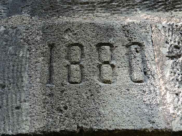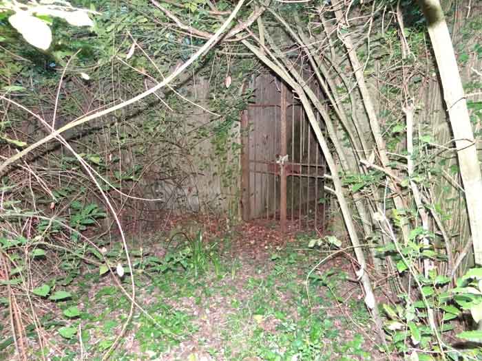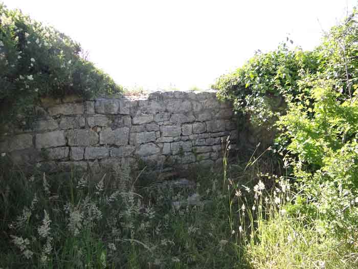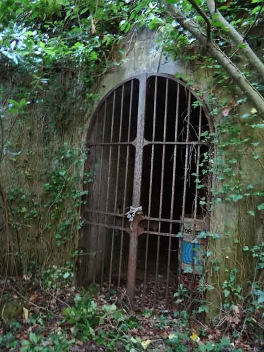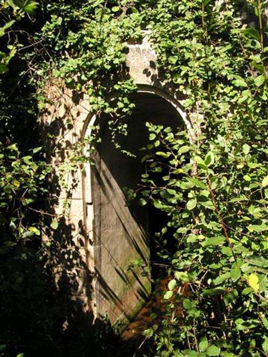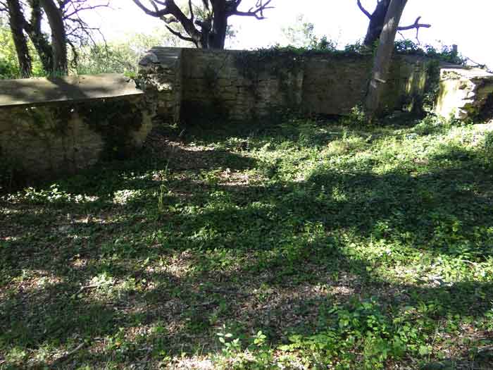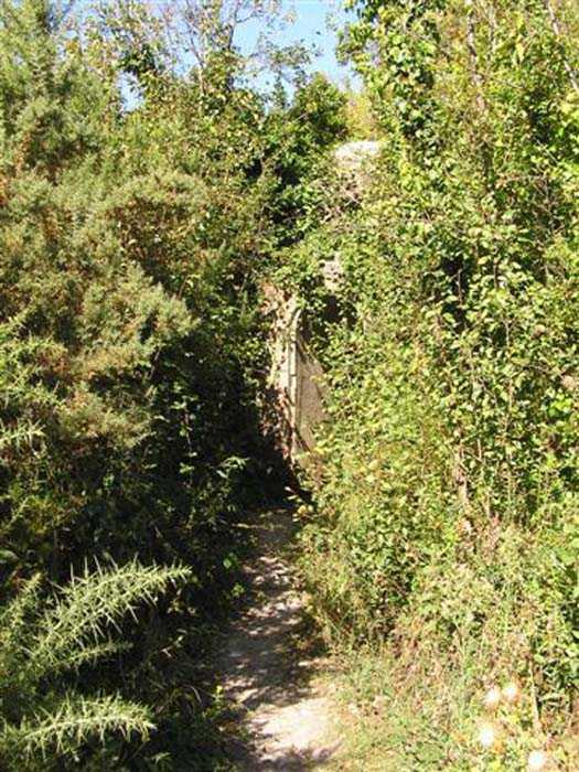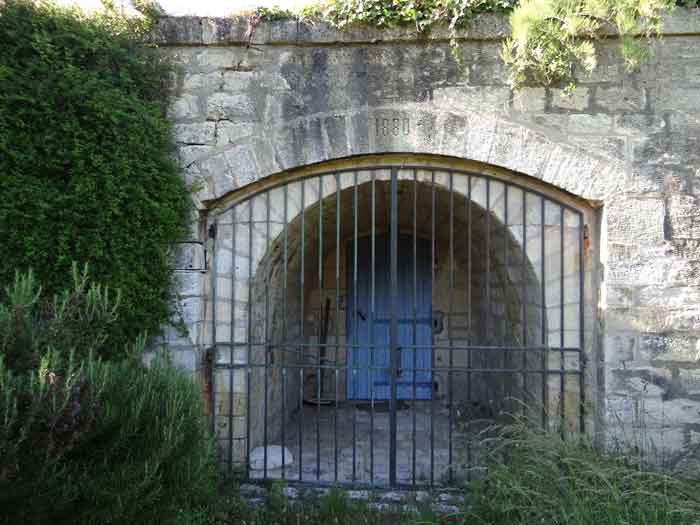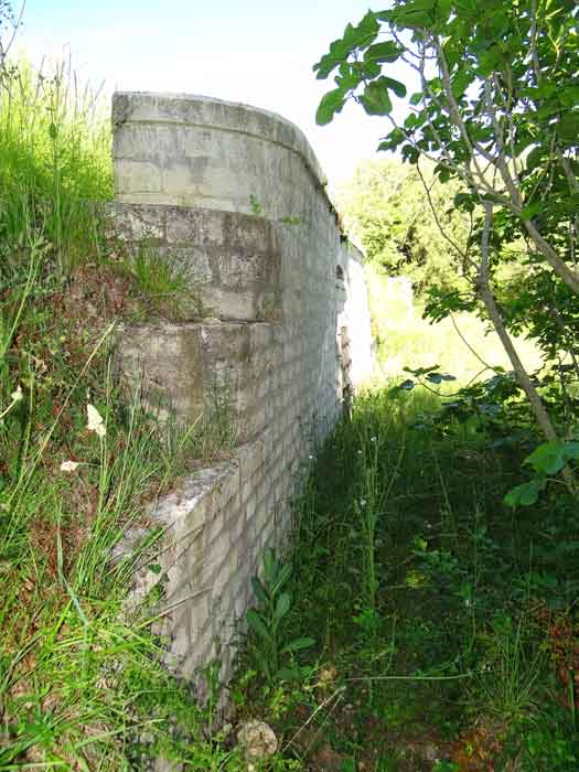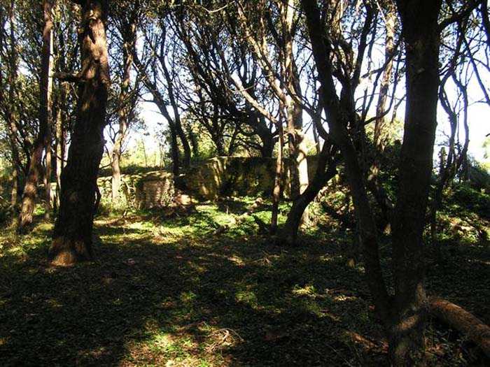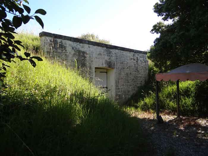 Fortress of Rochefort, north of Île d’Aix, 1878-1880. The 1878 project planned for a curved front with a thick parapet behind which, on either side of a bombproof powder magazine, the 19 c guns would have been placed. These, four in number, would have been separated by full or hollow traverses. The ends of the frontal arc then folded back towards the entrance of the battery, at the center of the gorge. The latter, straight, would have had a ditch and an enclosure wall. The counterscarp would even have been crowned with a pentagonal advanced work, a sort of ravelin surmounted by a firing parapet for infantry. A series of eight rooms, barracks and magazines, would have backed onto the gorge, on either side of a tunnel entrance. The realization turned out quite different; seen from the sky, this battery had a very particular configuration; one might have thought it equipped with cat's ears to use a rarely used architectural term. Indeed, armed with two 24 c guns separated by two other 19 c guns placed slightly behind the first, the advanced emplacements of the 24 cm guns (on P.C. mounts) guaranteed the latter an azimuth of nearly 190°. The 19 c guns were in turn framed by carefully aligned hollow traverses. The left side of the battery consisted of an earthen merlon protecting a powder magazine, most probably model 1879. A second, smaller powder magazine limited the battery's footprint on its right side. The gorge was now open. After 1889, the 24 c guns will be replaced by two other 19 c guns because the depths in the beaten zone did not allow the new ships to venture there. The required organic personnel was 38 men. This battery still exists, it is located in private property and its platforms are invaded by vegetation. It is not maintained and its remains are hardly legible. There is a well, a concrete magazine where 25 cm of water stagnates, and two of its three traverses (the outer ones) have wing walls with stepped returns. (03/2008).