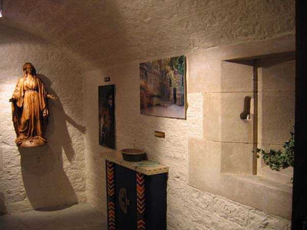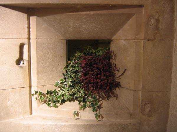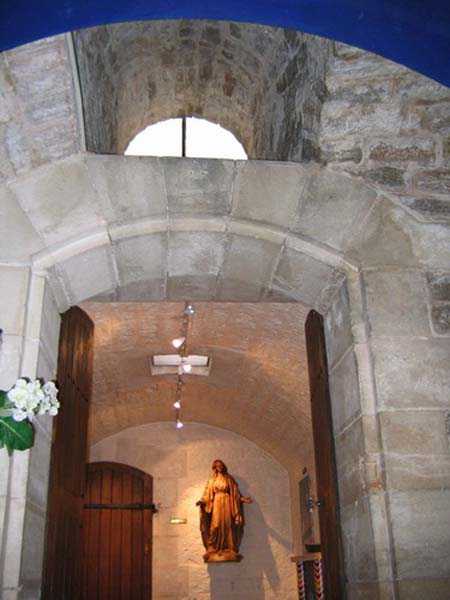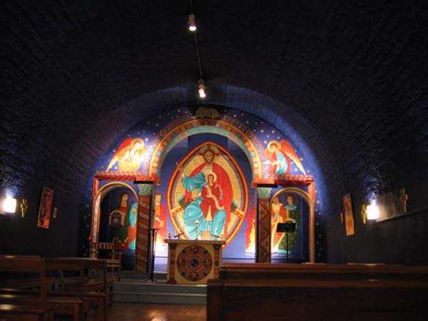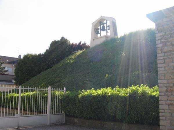 Fortress of Dijon, north-west of the city, circa 1880. Powder magazine, model 1874, covered with earth, located behind Fort de Hauteville. Today (2005) converted into a chapel dedicated to Saint Bernard. The carillon surmounts the former light well and inside, the lamp embrasure of the airlock is perfectly visible. This is a practically unique example of reconversion (Notre Dame du Faron in Toulon is less successful) and it must be acknowledged that the challenge has been perfectly met. Those responsible have managed to blend modern decoration and old rubble masonry vaults. We have designated it as the Saint-Bernard magazine for lack of other information. As its transformation into a chapel obviously post-dates its original use, we have unfortunately been unable to find its original designation.
