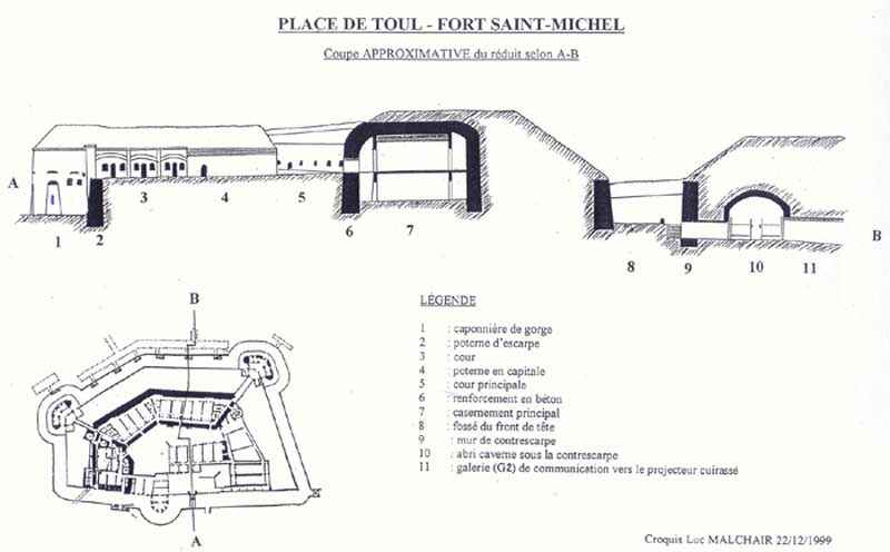 Befestigtes Lager Toul, nördlich der Stadt, 1874–1877. 387 m ü. M. 726 Mann und 22 Geschütze, darunter 12 Flankengeschütze. Genannt Fort Klein. Ein erstes Projekt sah diese Redoute in der gleichen Form vor wie die von Lucey und Villey-le-Sec, aber die Pläne wurden dahingehend abgeändert, dass sie ein unregelmäßiges Sechseck bildete. Die leichten Brüche in der Kehle und der Spitze ließen sie dennoch eher einem Trapez ähneln. Zur Verteidigung ihrer sechs Fronten verfügt sie über drei doppelte Kaponnieren, die alle an ungeraden Frontvorsprüngen platziert sind. Die Schanze am Frontbogen I schützt die beiden Schluchtfronten. Sie ist einzigartig, da sie einen Keller mit Schießscharten für Musketenfeuer besitzt, die nur das Schießen auf die ihnen gegenüberliegende Böschungsspitze und kein Gefecht im Graben zulassen. Diese Schießscharten öffnen sich zu den Scharten, die im Erdgeschoss hervortreten, was sie zu einem einzigartigen Fall machen dürfte. Diese vier Scharten betreffen nur die abgerundete Vorderseite dieser Orgel. Der Zugang zum Keller dieser Kaponniere erfolgt über eine Falltür im Erdgeschoss, ebenfalls eine Ausnahme. Der Eingang zur Redoute hat keinen Vorbau. Die beiden Pilaster sind mit einer zinnenbewehrten Mauer verkleidet, die auf einen Innenhof hinausgeht. Die Geländer einer Zugbrücke von Ardagt & Pilter sind noch vorhanden, und in der Vegetation des Grabens kann man die Überreste ihres beweglichen Teils sowie den seltenen Metallpfeiler der festen Brücke erkennen. Dieser Innenhof überblickt die ehemalige Offizierskaserne. Gegenüber der Truppenkaserne führte ein Kapitälchengang. Letzterer ging ein schmaler Graben voraus (ähnlich einem englischen Innenhof), sodass sich der Innenhof sozusagen auf der Höhe des ersten Stockwerks der Kaserne befand. Diese Kaserne, bestehend aus neun Jochen auf zwei Ebenen, hatte eine zickzackförmige Form, wobei die vier Joche auf ihrer linken Seite nach Süden zurückgeklappt waren. Die Kasematten im Untergeschoss haben relativ niedrige Decken. 1892 wurde diese Kaserne mit Beton gedeckt. Dieses Dach fällt nun vor die Fassade hinter dem Graben zurück, der nicht mehr deutlich als solcher erkennbar ist. Dieses Szenario gibt es sonst nur im Fort von Replaton in Modane. Diese Modernisierung umfasste alle Räumlichkeiten links dieser Kaserne bis zur Mitte der Front I-II, wo am Grund des Schluchtgrabens eine Kriegskaserne betoniert wurde. Von dieser konnte man durch einen tiefen Stollen und vor der Verfüllung in den letzten Jahren die Höhlenunterstände außerhalb der Hülle erreichen (siehe Mont Saint-Michel). Die Redoute verfügte über zwei Brotöfen für je 300 Rationen, die sich heute in einem eher traurigen Zustand befinden. Von der Kavallerie, die vor der Betonierung über der Truppenkaserne stand, ist nichts mehr übrig. Dagegen sind zwei Stützsäulen für Flugabwehr-Maschinengewehre und mindestens ein Panzer für Flugabwehrkanonen erhalten. Diese Anlagen müssen aus dem Ersten Weltkrieg stammen, und laut einer Graffiti an einer Kasernenwand befand sich dort das dritte Geschütz des 403. Flugabwehrregiments (Graffiti vom April 1936). Beachten Sie, dass die Kavalleristen nur mit zehn Geschützen bewaffnet sein durften. Die Redoute hatte keine Wallstraße, da diese in den Umschlag verlegt worden war (siehe Umschlag des Forts Mont Saint-Michel). Zwei große, im Vorsprung VI eingeschlossene Pulvermagazine mit einer Gesamtlagerkapazität von 190.000 kg teilen sich dieselbe Trennwand. Ihre nebeneinander liegenden Lagerräume sind durch einen in diese gemeinsame Trennwand eingelassenen Erker miteinander verbunden. Beide sind spitzbogig und mit einer dünnen Ziegelmauer ausgekleidet, die selbst mit einer Zementschicht überzogen ist. Nicht weit davon entfernt kann ein geschultes Auge den abgerissenen optischen Kommunikationsposten erkennen. Dieser Posten war mit dem Fort von Frouard, dem Lucey-Plateau und einem freistehenden Posten hinter dem Werk von Charmes verbunden. Vom ursprünglichen Posten ist nichts mehr übrig. Er wurde durch einen Betonmonolithen ersetzt, der über einen großen vertikalen Schacht zugänglich ist. Wann und warum, wissen wir nicht, aber heute ist nur noch die Basis erhalten und nur zwei der drei Zinnen sind noch zu erahnen. Die Kaponnieren der Fronten III und V sind eine Besonderheit. Der für die Kanonen vorgesehene Raum ist schmaler als üblich, was die Konstrukteure bei der Wahl des 12-Pfünder-Geschützes dazu zwang, die Schießscharten erheblich zu verändern und nur einen schmalen Abstand zwischen denen dieses Geschützes und denen des Revolvergeschützes beizubehalten. Bemerkenswert ist auch, dass die Zinnen sowohl an der Vorderseite als auch an den flankierenden Steilwandgalerien im oberen Teil abgestuft sind. Ihre flankierenden Galerien sind praktisch so breit wie ihre Seiten. Alle haben zwei Erker, von denen einer ein Ausfalltor hat. Über eines davon konnte man den Graben der Kopffronten erreichen. Sowohl im Frontbogen III als auch im Frontbogen V gibt es einen über eine Treppe erreichbaren Kontereskarpenunterstand. Andererseits finden wir, dem Winkel des Frontbogens IV folgend, unter der Kontereskarpe der Fronten III-IV und IV-V, den längsten Höhlenunterstand, den wir je gesehen haben. Nicht weniger als sechs Treppen ermöglichen den Zugang. Zwei endlose Reihen von im Boden eingelassenen und durch einen Mittelgang getrennten Bettpfosten zeugen von der großen Zahl an Männern, die hier Schutz finden konnten. Von diesem Unterstand gehen zwei Galerien ab, eine rechts, die andere links von der Batterie Bruley, die sich im Fortmantel im Nordwesten befindet. Im Februar 2001 fanden wir die Redoute in einem durchaus akzeptablen Erhaltungszustand und mit sehr wenigen Graffiti vor. Lediglich einige Mauerwerke sowie die Brotöfen, deren Metallteile gerippt waren, hatten unter dem Frost gelitten. Eine seltene Beobachtung: Im Dezember 2011 verschlechterte sich der Zustand des Ortes nicht,