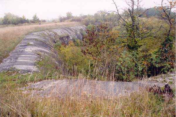 Toul fortified camp, north of the city, 1874-1877. 387 m alt. 726 men and 22 guns including 12 flanking. Called Fort Klein. A first project envisaged this redoubt in the same shape as those of Lucey and Villey-le-Sec, but the plans were modified to make it an irregular hexagon, the slight breaks in its throat and its head front nevertheless making it more like a trapezoid. To defend its six fronts, it has three double caponiers, all placed at odd-numbered salients. The one at salient I protects the two gorge fronts. It is unique because it has a basement with firing crenels for musketry fire, which only allow firing at the top of the escarpment facing them and no action in the ditch. These crenels open into the fruit of foot crenels emerging on the ground floor, which must make it a unique case. These foot crenels, four in number, only concern the rounded face of this organ. Access to the basement of this caponier is via a trapdoor in the ground floor, also an exception. The entrance to the redoubt has no porch. The two pilasters are clad with a crenellated wall overlooking a courtyard. The rails of an Ardagt & Pilter drawbridge are in place, and in the vegetation of the ditch, one can make out the remains of its movable part as well as the rare metal pier of the fixed bridge. This courtyard overlooks what was probably the officers' barracks. A capital passage led opposite the troop barracks. The latter was preceded by a narrow ditch (like an English courtyard), so much so that the courtyard was located, so to speak, at the level of the first floor of the barracks. This barracks, composed of nine bays on two levels, had a chevron shape, the four bays on its left side folding back towards the south. The casemates on the lower floor have fairly low ceilings. In 1892, this barracks was covered with concrete. This roof now falls back in front of the facade beyond the ditch, which no longer clearly appears as such. This scenario is only present elsewhere at the fort of Replaton in Modane. This modernization included all the premises to the left of this barracks, up to the center of front I-II, where a war barracks was concreted at the bottom of the gorge ditch. From the latter, one could, through a deep gallery and before the backfilling of recent years, reach the cave shelters outside the envelope (see Mont Saint-Michel). The redoubt had two bread ovens for 300 rations each, which are now in a rather sad state. Nothing remains of the cavalryman surmounting the troop barracks before the concreting. On the other hand, there are two support columns for anti-aircraft machine guns and at least one tank for anti-aircraft guns. These arrangements must date from the First World War and, according to graffiti left on a wall of the barracks, we had there the third gun of the 403rd Anti-Aircraft Regiment, graffiti dated April 1936. Note that the cavalryman was only to be armed with ten guns. The redoubt did not have a rampart street, the latter having been transferred to the envelope (see envelope of the fort of Mont Saint-Michel). Sealed in salient VI, two large powder magazines, with a total storage capacity of 190,000 kg, share the same partition wall. Placed side by side, their storage rooms communicate through a bay pierced in this common partition. Both are ogival and lined with a thin brick wall, itself covered with a film of cement. Not far from them, a trained eye will be able to spot the optical communications post, which has been cut down. This post communicated with the fort of Frouard, the Lucey plateau and a detached post behind the work of Charmes. Nothing remains of the original post. It was replaced by a concrete monolith accessible by a large vertical shaft. When and why, we do not know, but today only the base remains and only two of the three battlements can be guessed. The caponiers of salients III and V are special. The space reserved for the cannons is narrower than usual, which forced the designers, when adopting the 12-pounder gun, to considerably modify the embrasures, retaining only a thin separation between that of this gun and that of the revolver gun. Still singularly, the battlements of both their faces and their flanking escarpment galleries have their upper part stepped. Their flanking gallery is practically as wide as their sides. All have two orillons, one of which has a postern gate. By taking one of these, one could reach the ditch of the head fronts. Whether in salient III or salient V, there is a counterscarp shelter accessible by a staircase. On the other hand, following the angle of salient IV, under the counterscarp of fronts III-IV and IV-V, we find the longest cave shelter that we have ever seen. No fewer than six staircases provide access. Two endless rows of bedposts sealed in the ground and separated by a central aisle testify to the large number of men that could be sheltered here. Two galleries leave this shelter, one to the right, the other to the left of the Bruley battery, located in the fort's envelope, to the northwest. In February 2001, we found the redoubt in a perfectly acceptable state of preservation and very little graffiti. Only some masonry had suffered from frost, as well as the bread ovens, whose metal parts had been ribbed. A rare observation, in December 2011, instead of getting worse, the state of the place improved, notably thanks to the maintenance carried out by the members of a paintball club and the presence of sheep and goats. The powder magazines remain immaculate as do the caponiers and counterscarp shelters (except that of salient III where fire has blackened the walls). Unfortunately, the German occupier removed as many metal elements as possible, but this does not detract from the specificities of the place which, without even mentioning the envelope and the external organs, certainly deserve a visit. Private property, access prohibited.