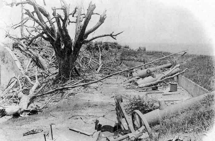 Martinique. Saint-Pierre. Ancienne batterie, déclassée avant 1888, que nous citons à la vue d’une photo, prise visiblement après l’éruption de la Montagne Pelée, le 8 mai 1902. L’armement semble être composé d’obusiers de 22 cm sur affût dit des « colonies ». Ehemalige Batterie, die vor 1888 außer Dienst gestellt wurde, die wir aufgrund eines Fotos erwähnen, das offensichtlich nach dem Ausbruch des Pelée-Berges am 8. Mai 1902 aufgenommen wurde. Die Bewaffnung scheint aus 22-cm-Haubitzen auf sogenannter „Kolonien“-Lafette zu bestehen. Voormalige batterij, buiten dienst gesteld vóór 1888, die we vermelden naar aanleiding van een foto, kennelijk genomen na de uitbarsting van de Montagne Pelée op 8 mei 1902. De bewapening lijkt te bestaan uit 22 cm-houwitsers op zogenaamde „koloniën“-affuit. Former battery, decommissioned before 1888, which we mention on the basis of a photo, apparently taken after the eruption of Montagne Pelée on 8 May 1902. The armament seems to consist of 22 cm howitzers on so-called “colonies” mounting. Bývalá baterie, vyřazená před rokem 1888, kterou zmiňujeme na základě fotografie pořízené zřejmě po erupci hory Pelée 8. května 1902. Výzbroj se zdá sestávat z 22cm houfnic na takzvané „koloniální“ lafetě. © JJM 31/03/2026