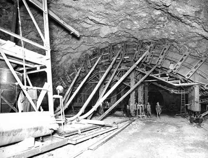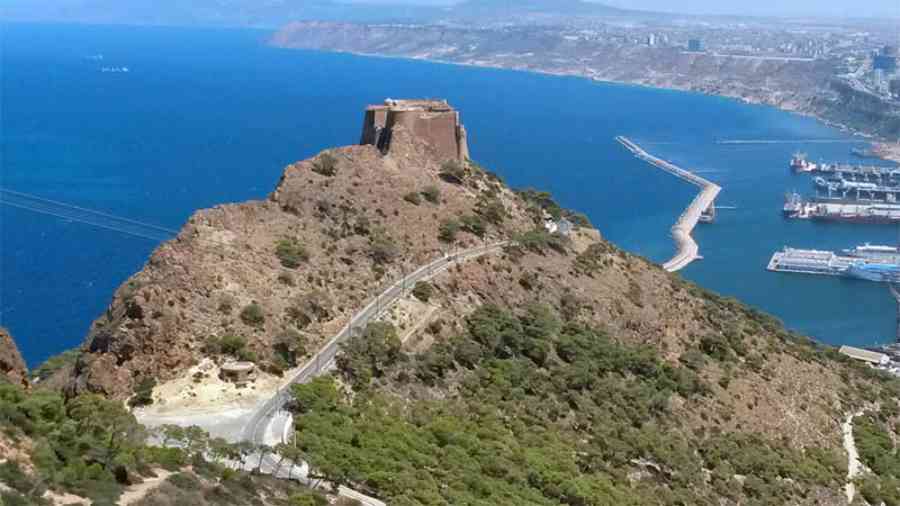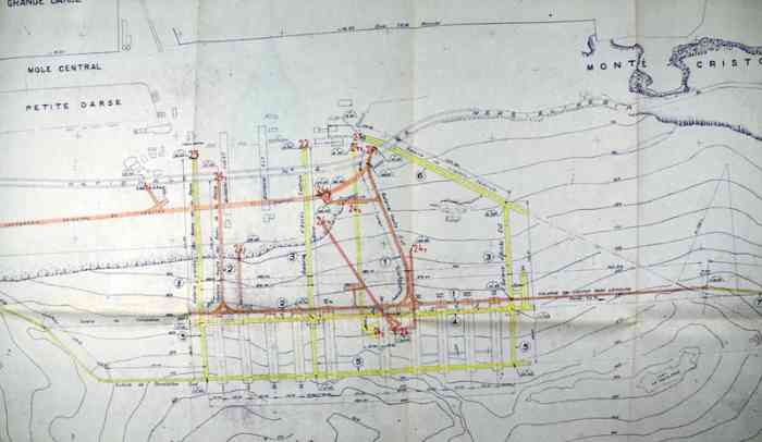 After the Second World War, and in parallel with the work on the port of Mers el-Kébir, gigantic works for the construction of underground infrastructures were undertaken in the massifs of the djebels Murdjadjo, Santon and Santa-Cruz. The objective was to shelter the vital installations of this "main fleet base", according to the terminology in force at the time, from bombardment. But the project had to quickly integrate the nuclear risk, and the necessary modifications delayed the execution of the tunneling works, which only began in 1951. The installations include :